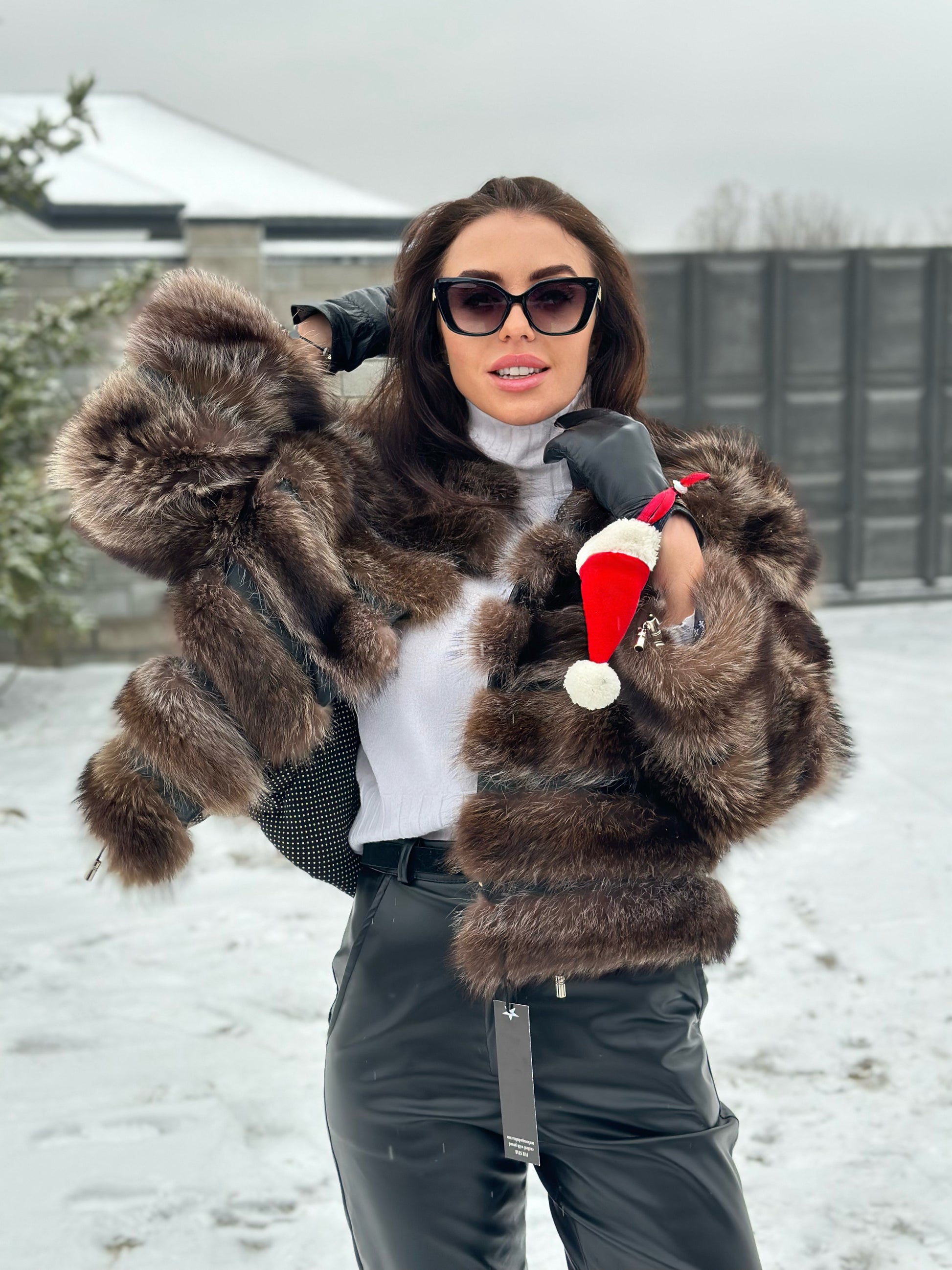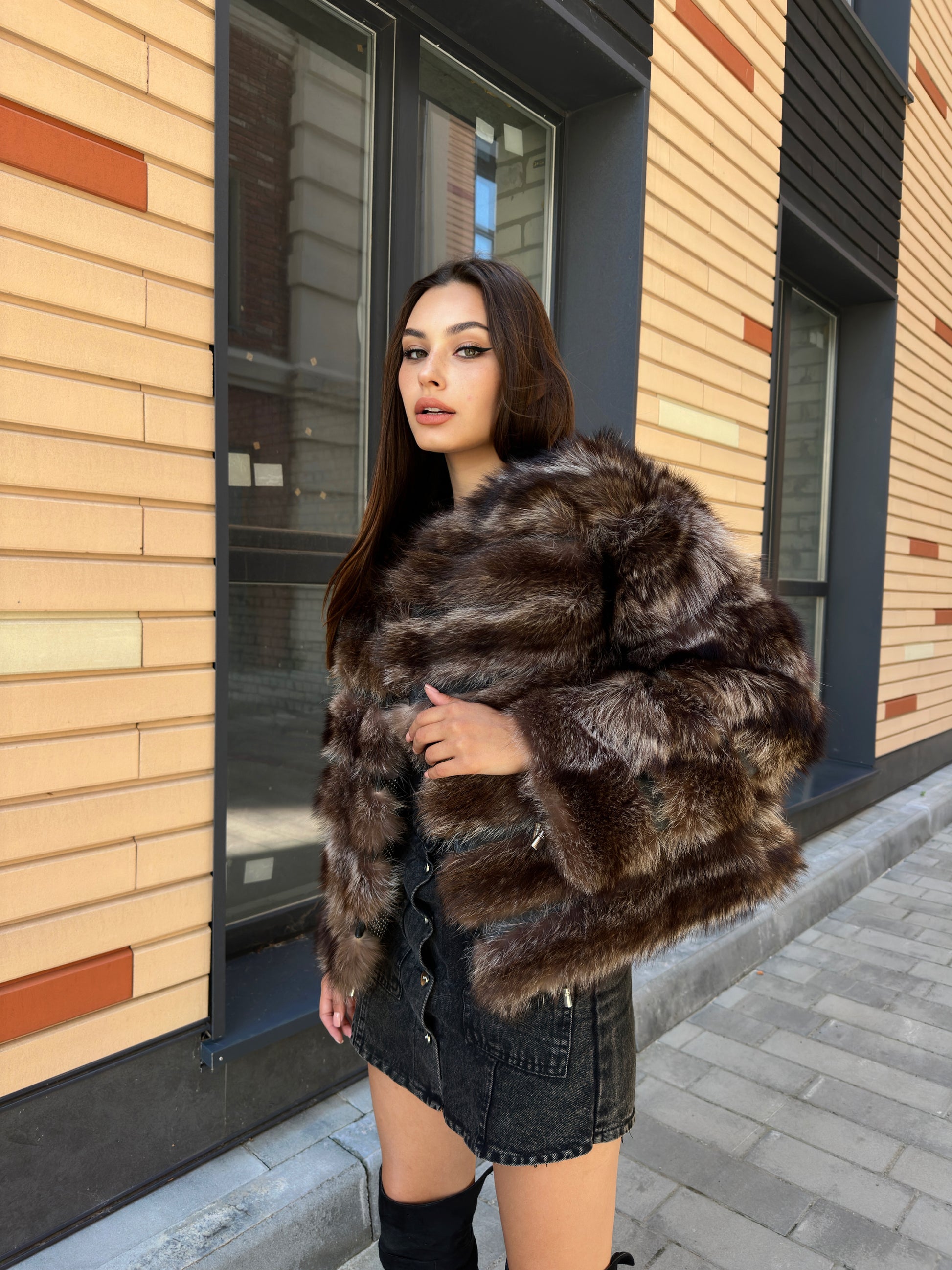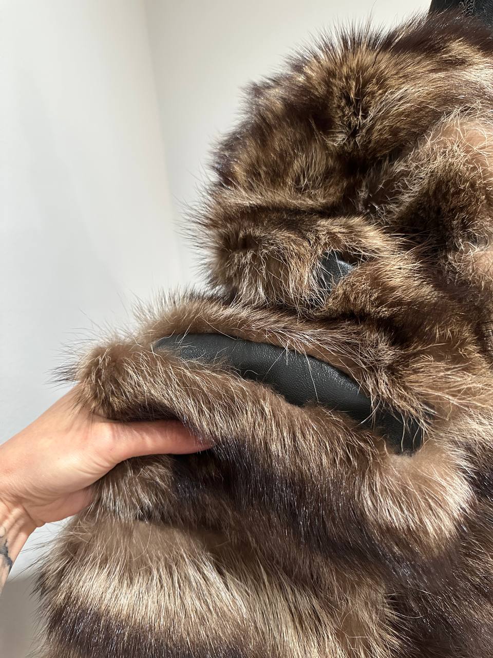 Women's fur coat made of natural raccoon fur natural color L size. Fur - fluffy, thick, warm, soft, shiny pile. The laying of the fur is horizontal, between the fur is genuine black leather. The model is a bomber jacket, on the bottom there is a drawstring. Also, the sleeves have a drawstring, you can adjust the width of the sleeve. There are 2 pockets. Fastens with hooks. Viscose lining, soft to the touch. Ukrainian manufacturer.