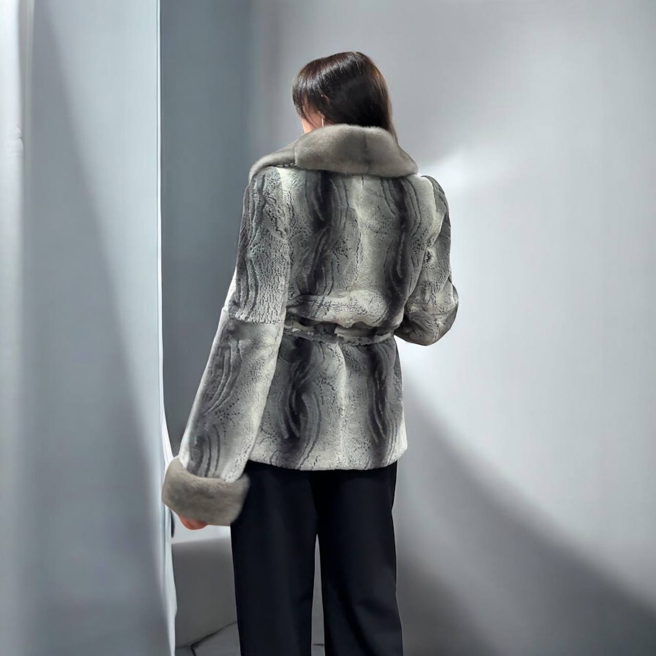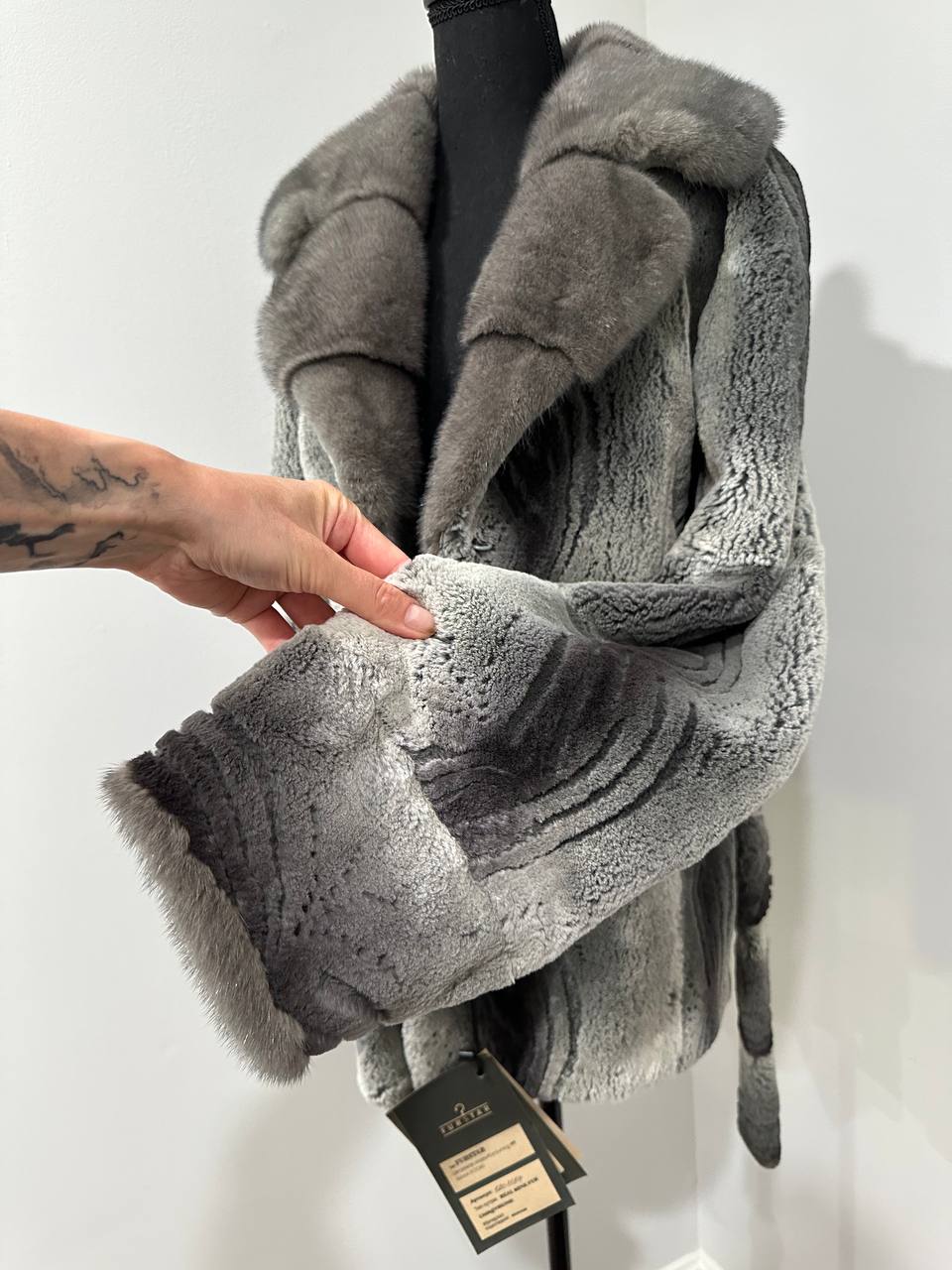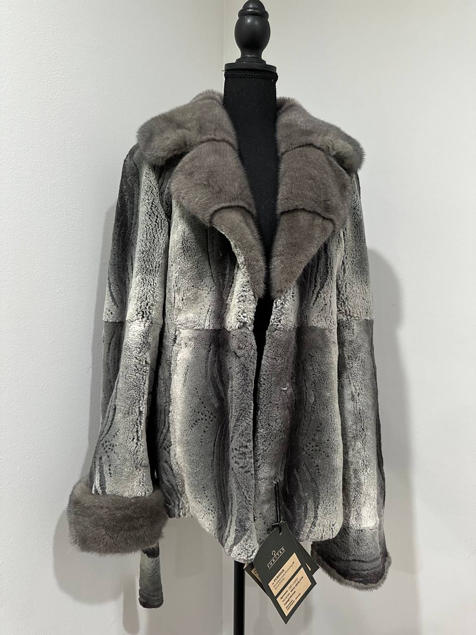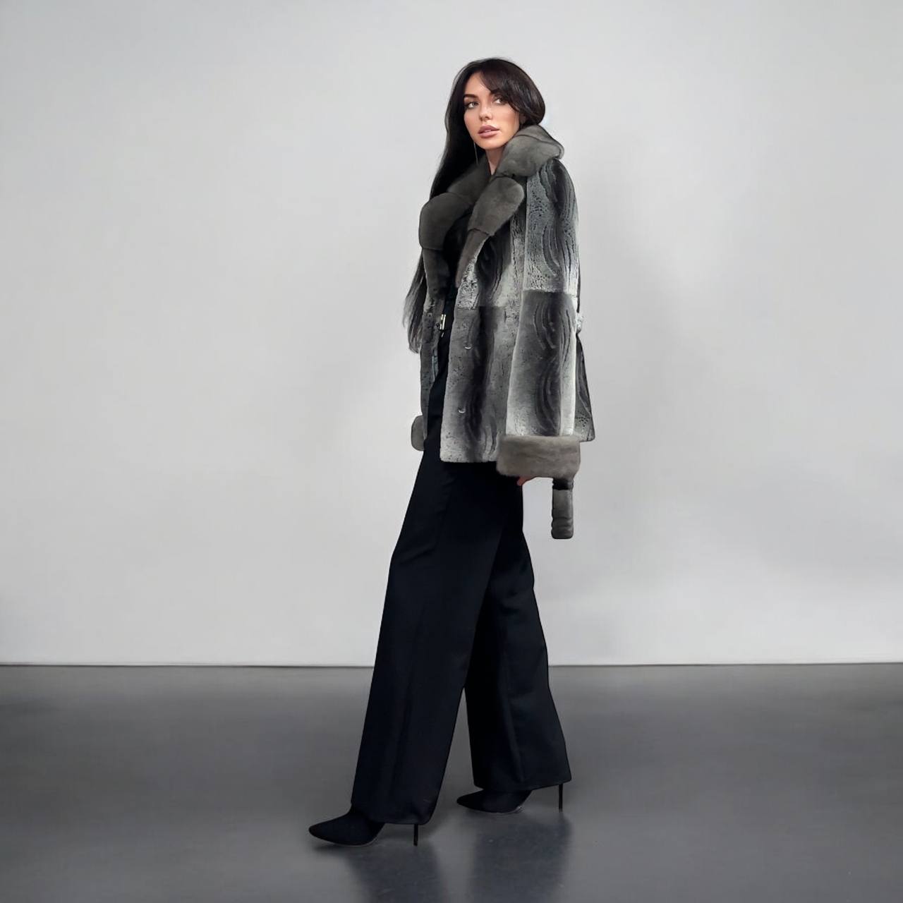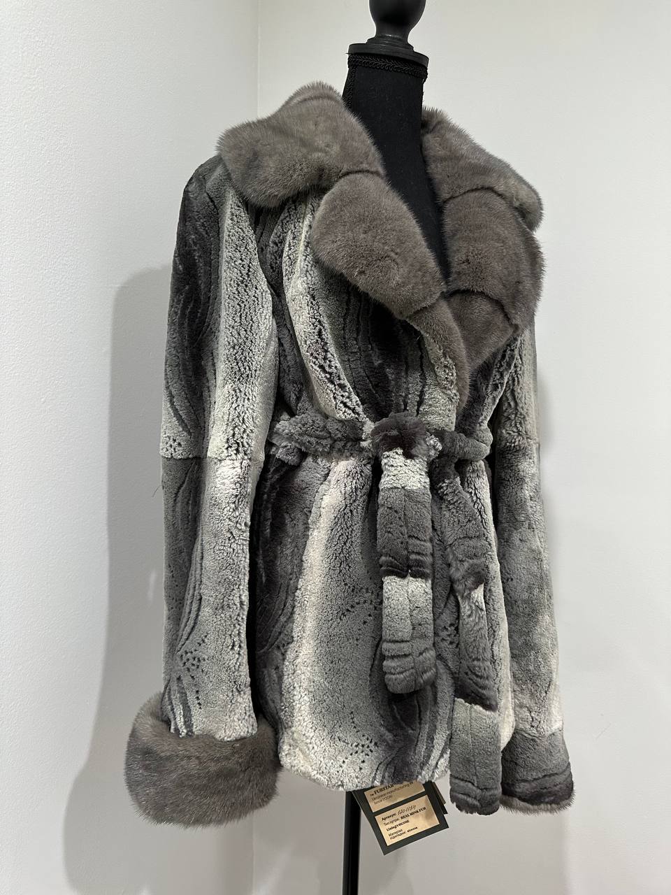 Indulge in ultimate luxury with this gorgeous fur jacket crafted from premium karakul (astrakhan) fur, beautifully dyed to mimic the exquisite patterns of chinchilla. The luxurious natural mink fur collar and sleeve cuffs add sophistication and warmth, making this coat a true statement piece.