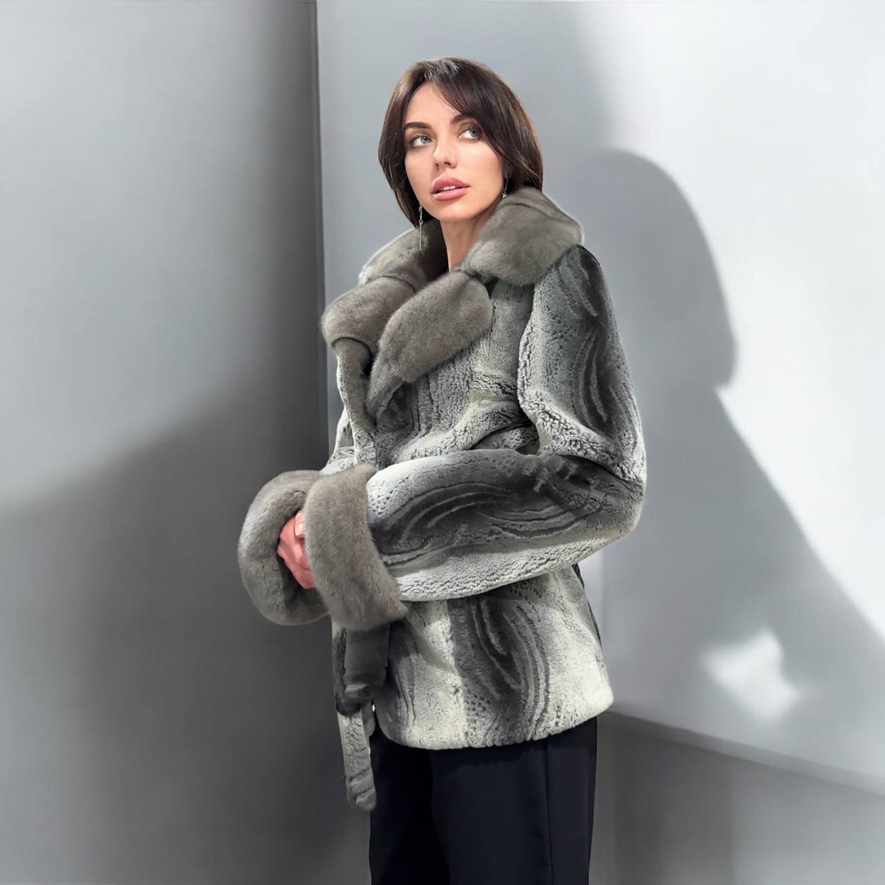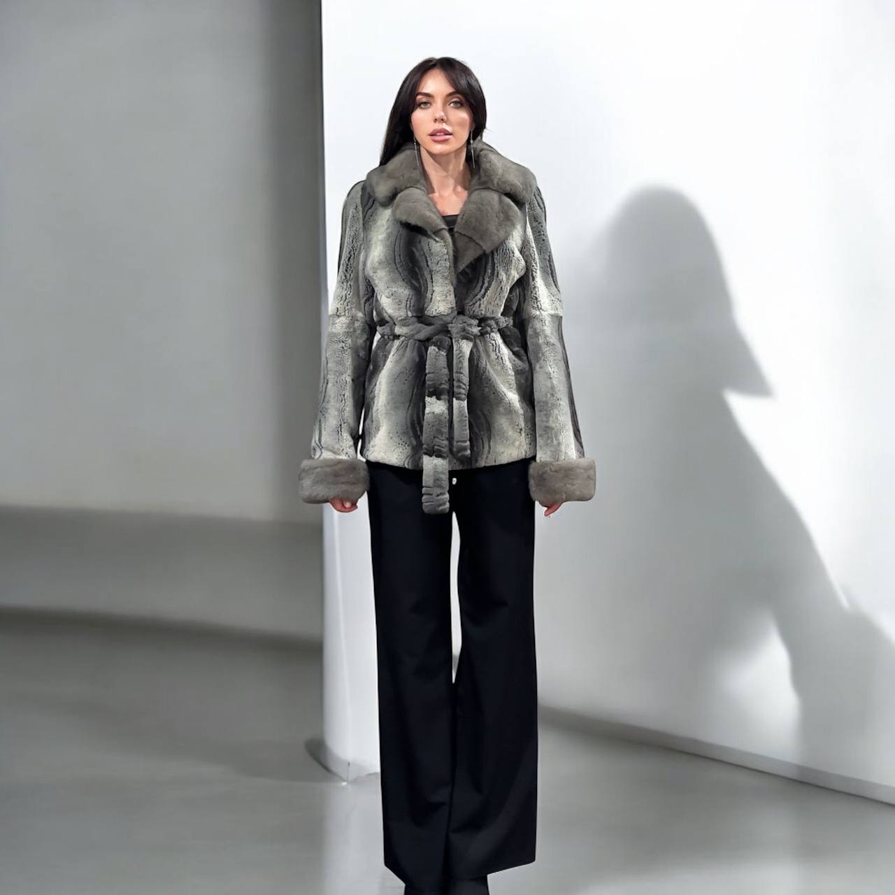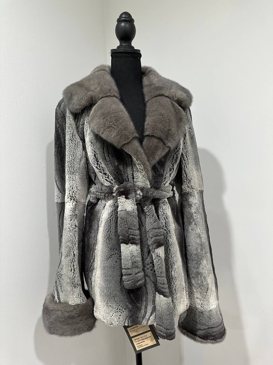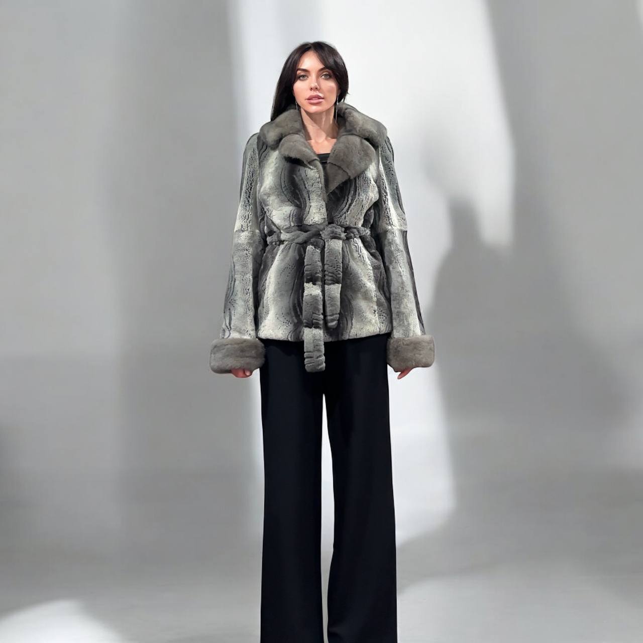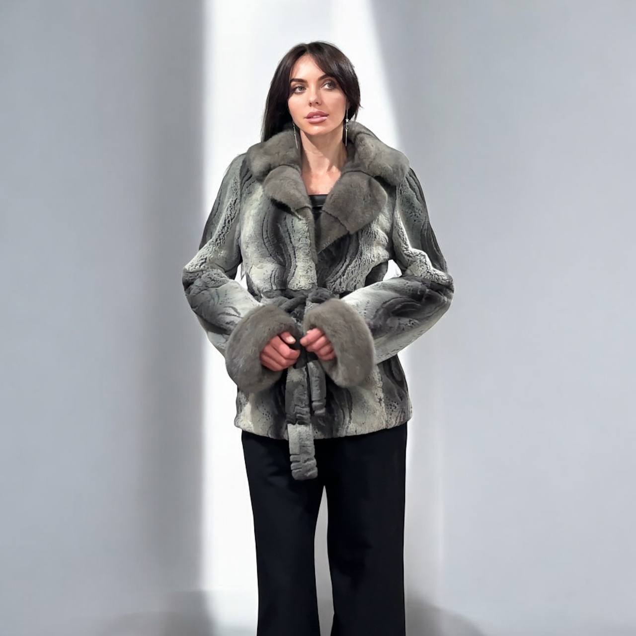 Indulge in ultimate luxury with this gorgeous fur jacket crafted from premium karakul (astrakhan) fur, beautifully dyed to mimic the exquisite patterns of chinchilla. The luxurious natural mink fur collar and sleeve cuffs add sophistication and warmth, making this coat a true statement piece.