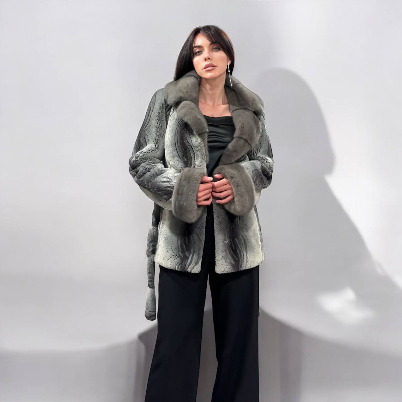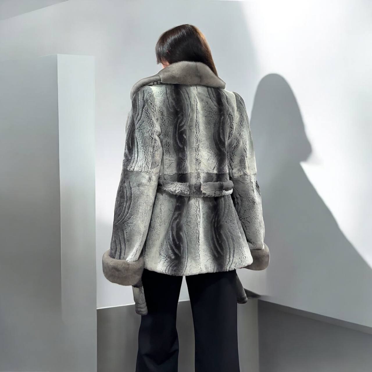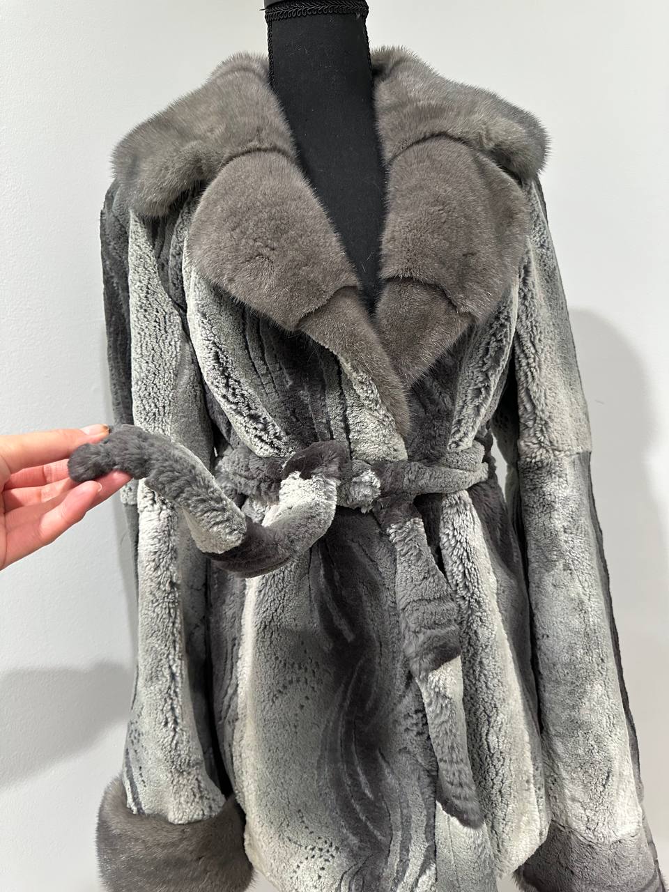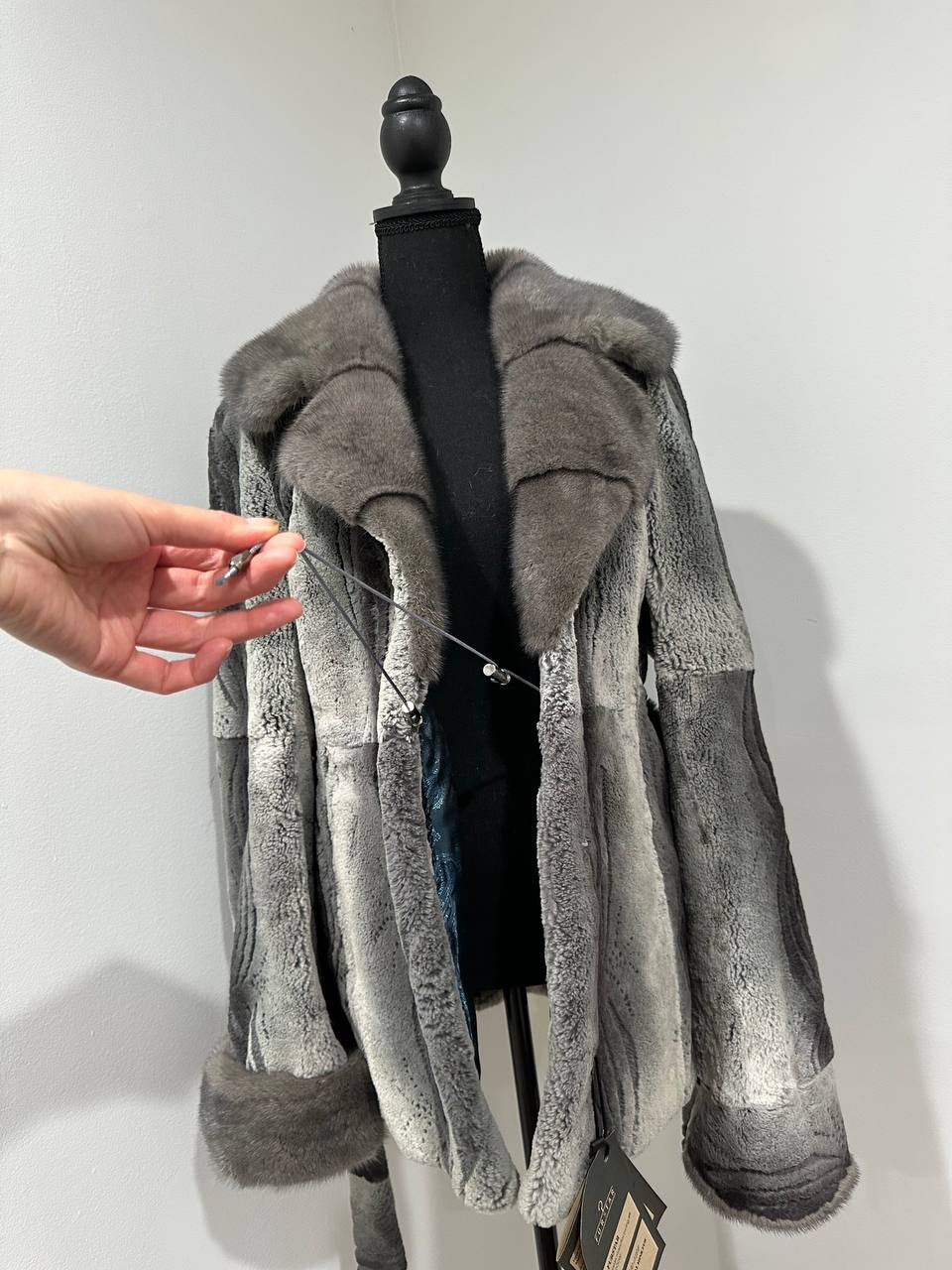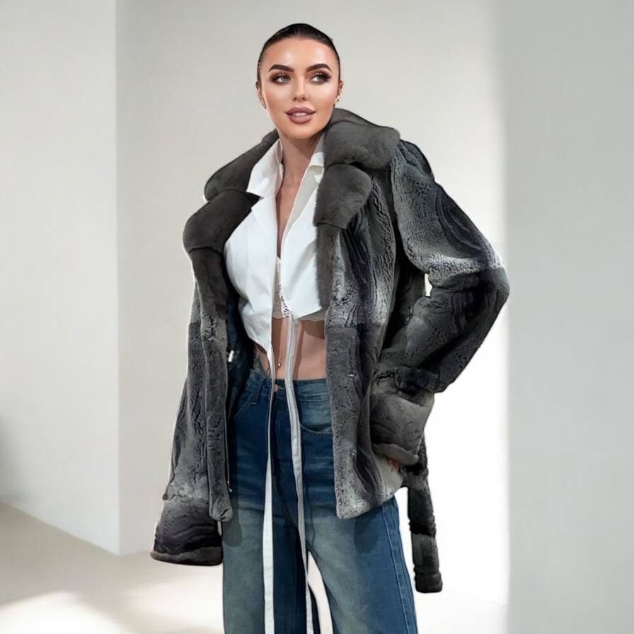 Indulge in ultimate luxury with this gorgeous fur jacket crafted from premium karakul (astrakhan) fur, beautifully dyed to mimic the exquisite patterns of chinchilla. The luxurious natural mink fur collar and sleeve cuffs add sophistication and warmth, making this coat a true statement piece.