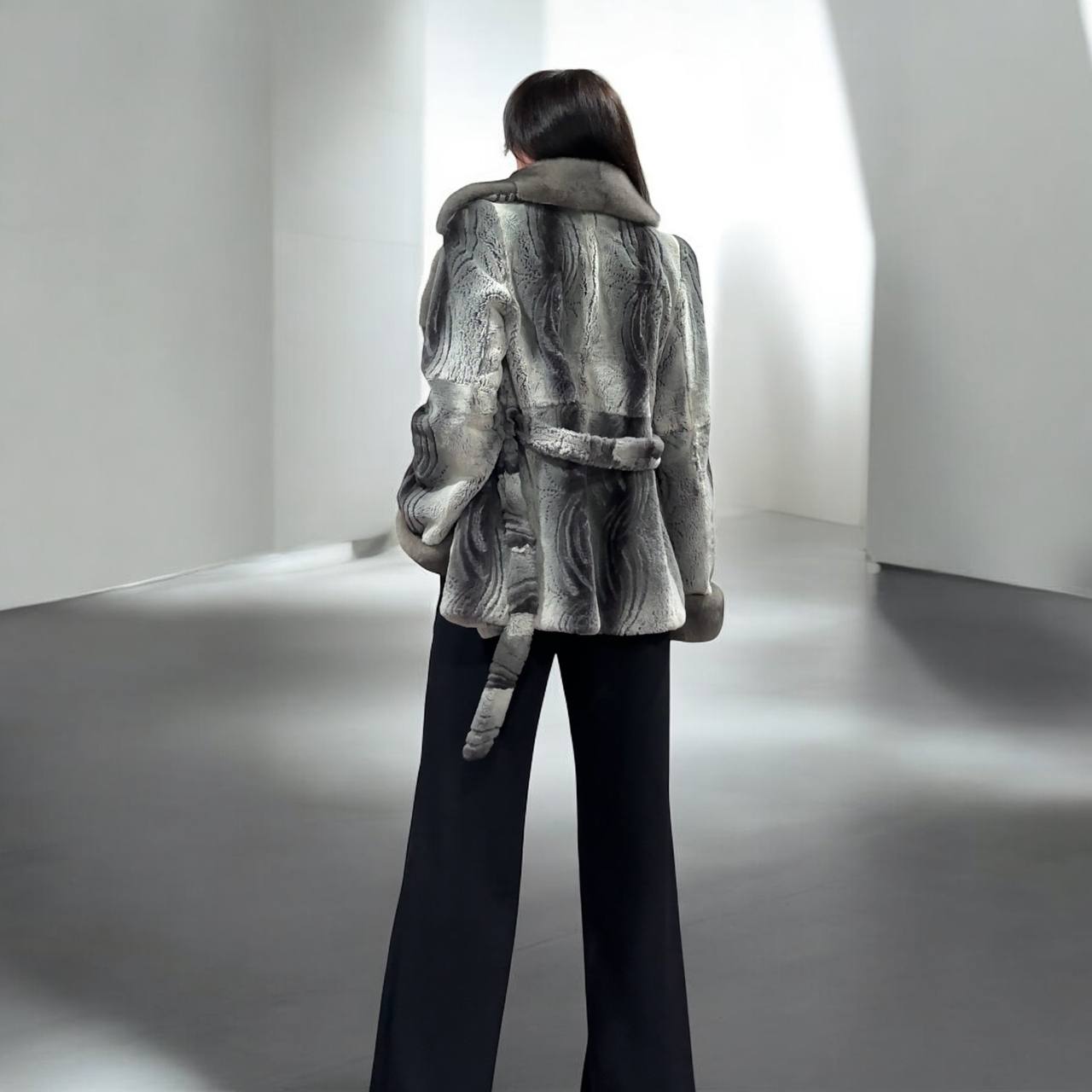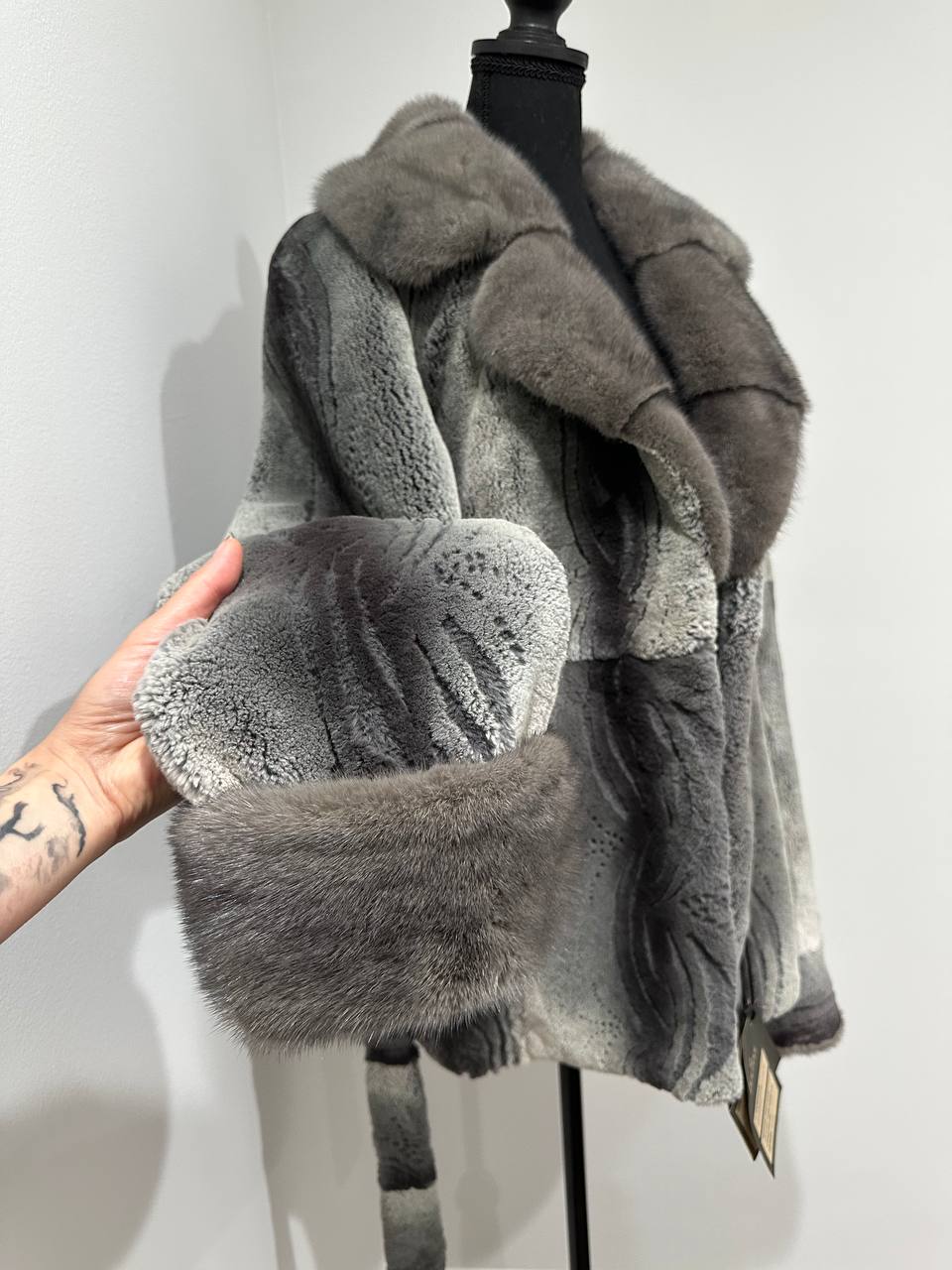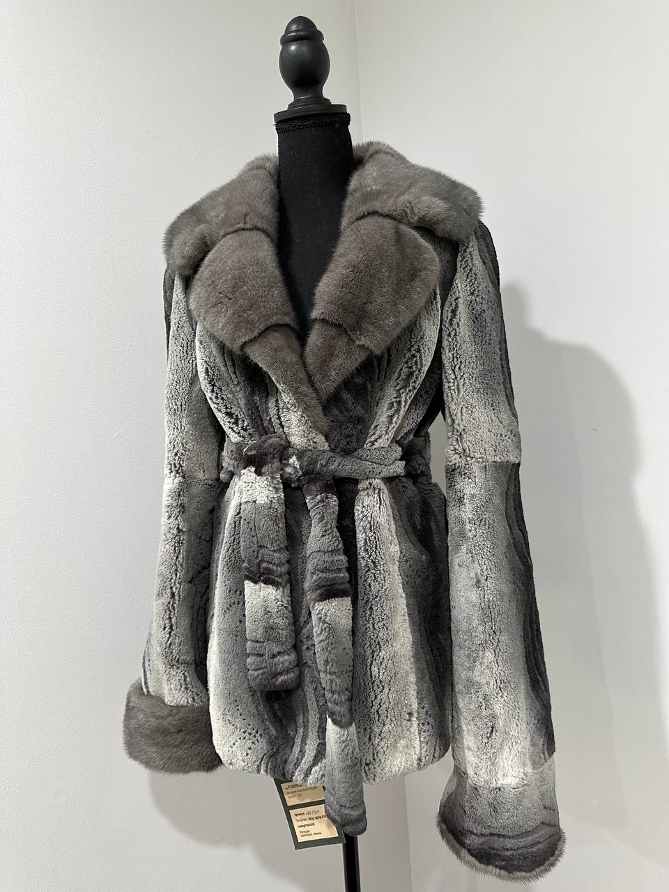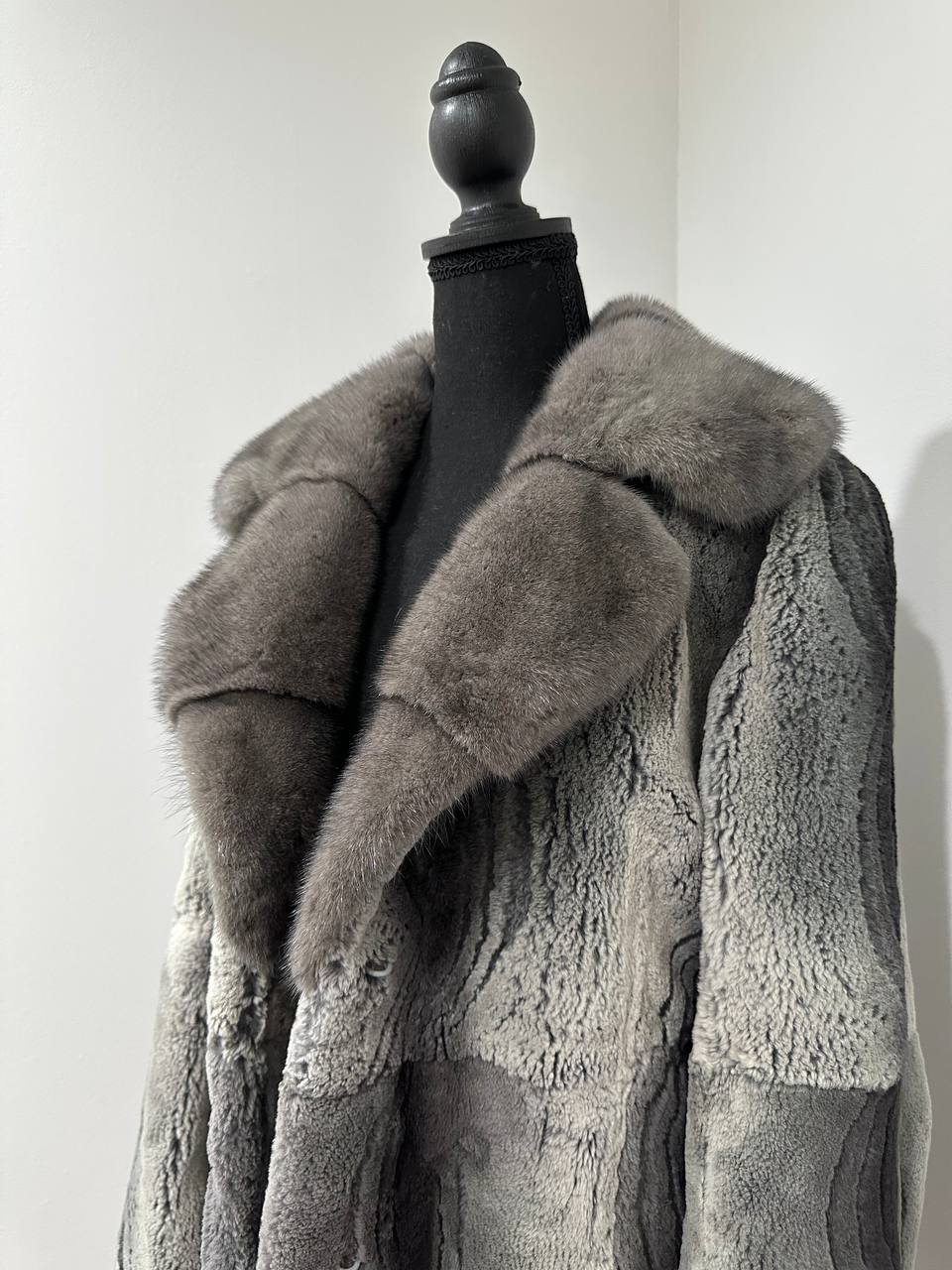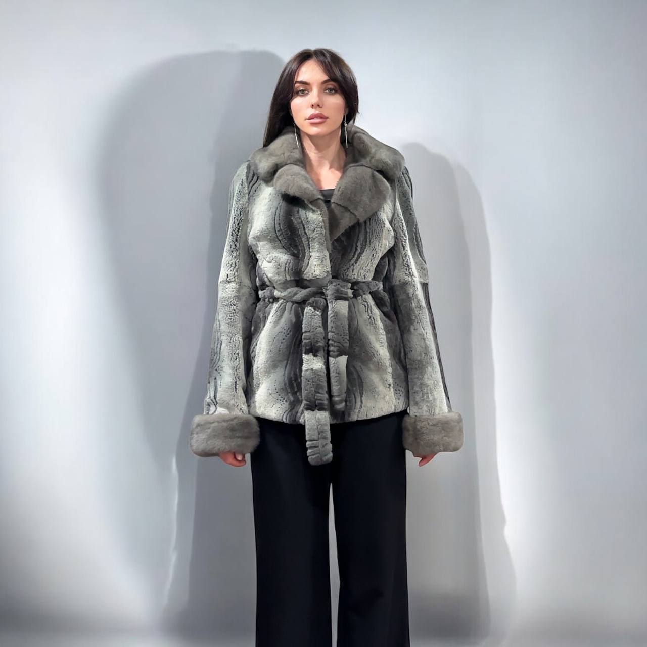 Indulge in ultimate luxury with this gorgeous fur jacket crafted from premium karakul (astrakhan) fur, beautifully dyed to mimic the exquisite patterns of chinchilla. The luxurious natural mink fur collar and sleeve cuffs add sophistication and warmth, making this coat a true statement piece.