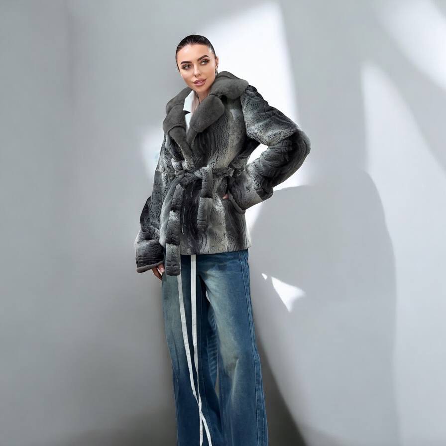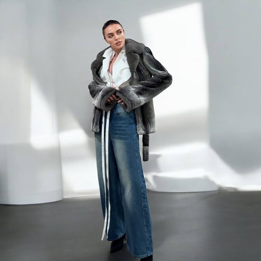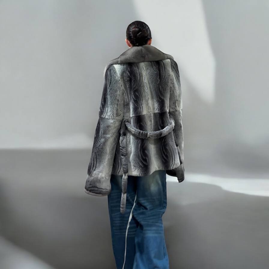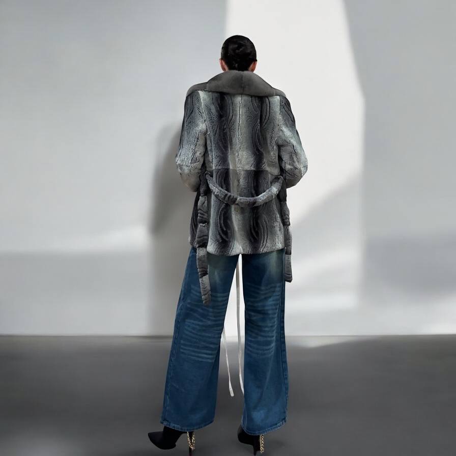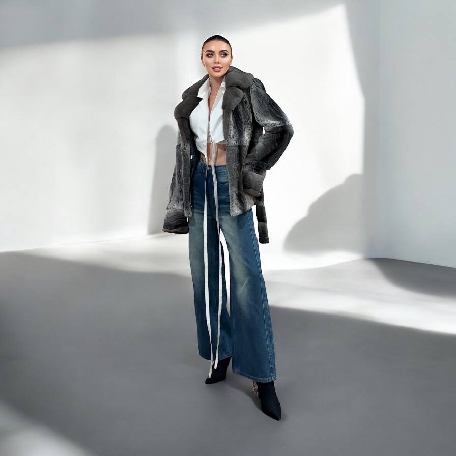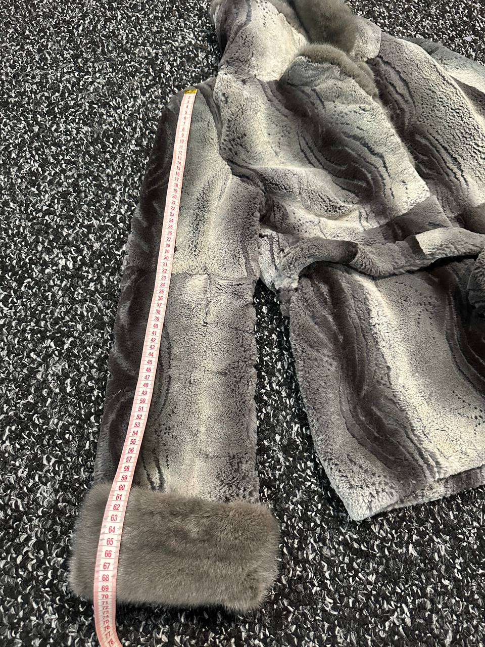 Indulge in ultimate luxury with this gorgeous fur jacket crafted from premium karakul (astrakhan) fur, beautifully dyed to mimic the exquisite patterns of chinchilla. The luxurious natural mink fur collar and sleeve cuffs add sophistication and warmth, making this coat a true statement piece.