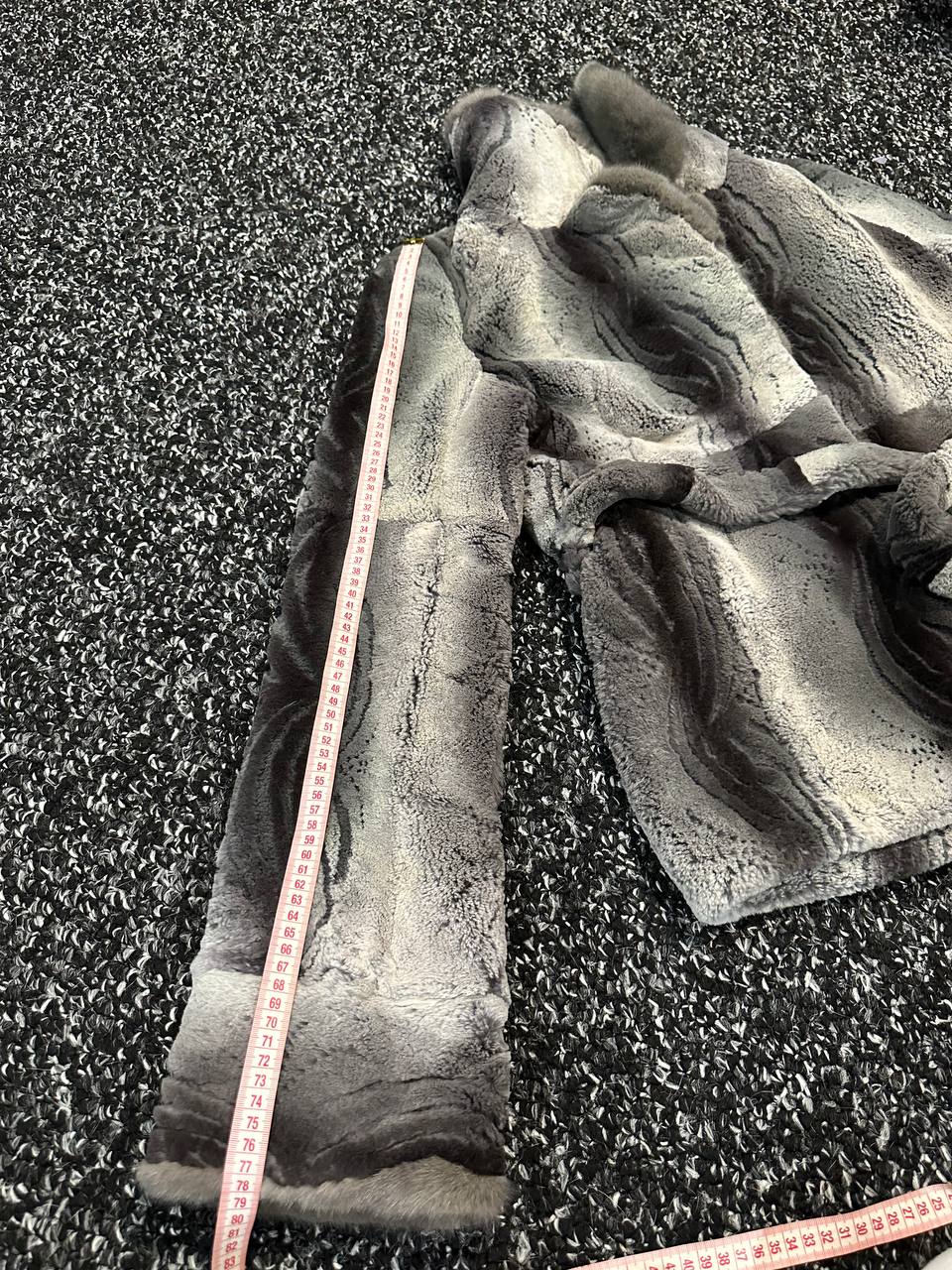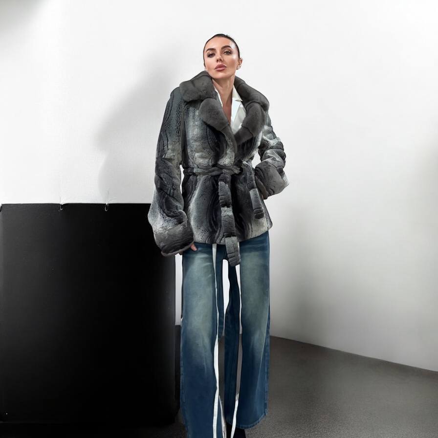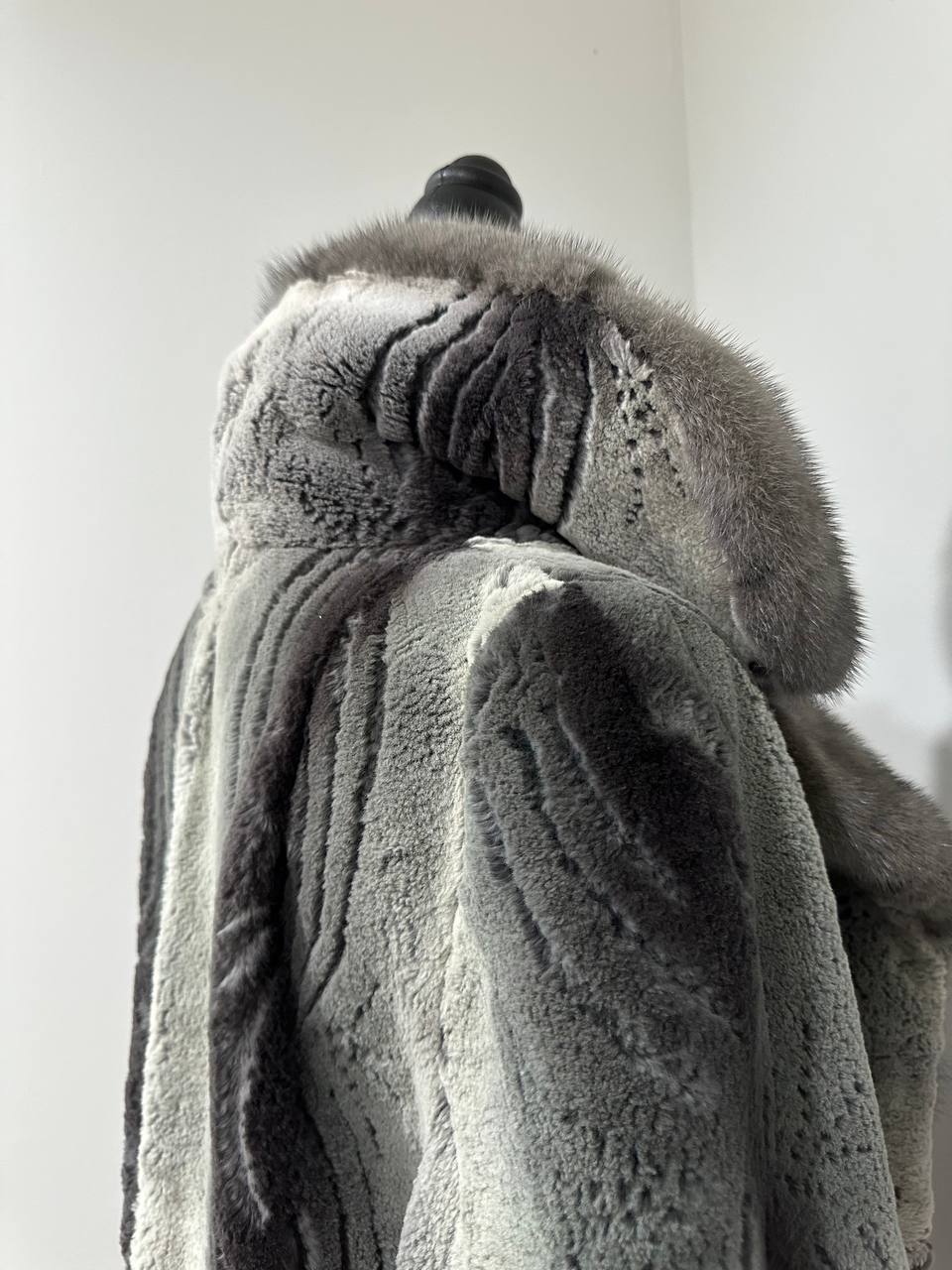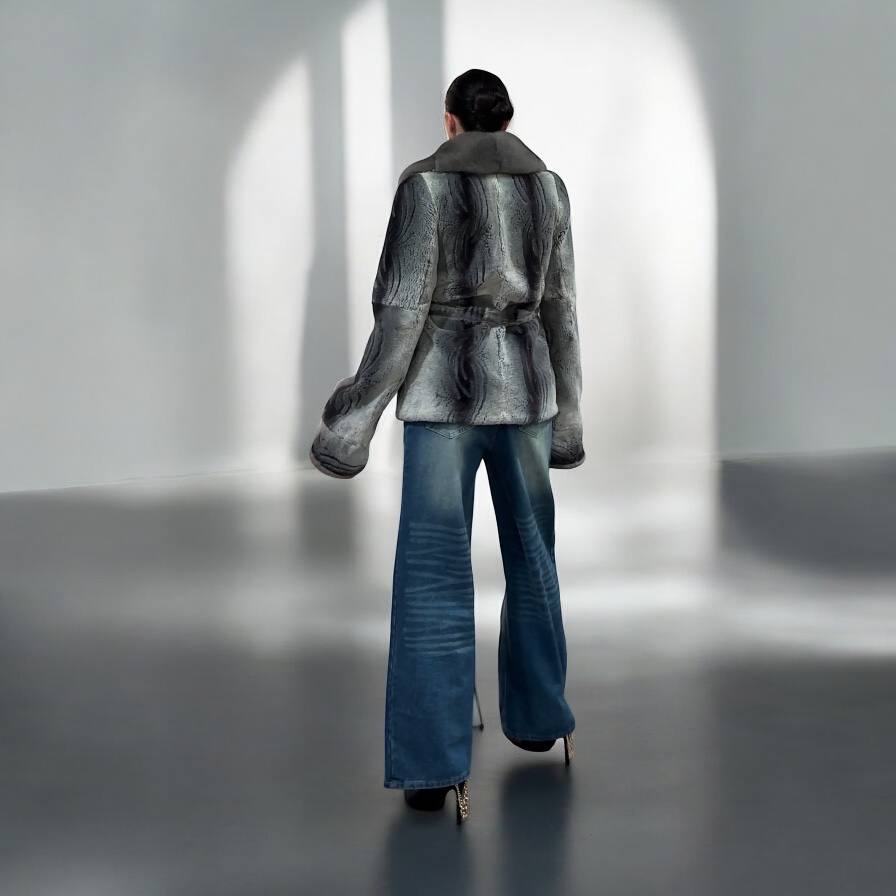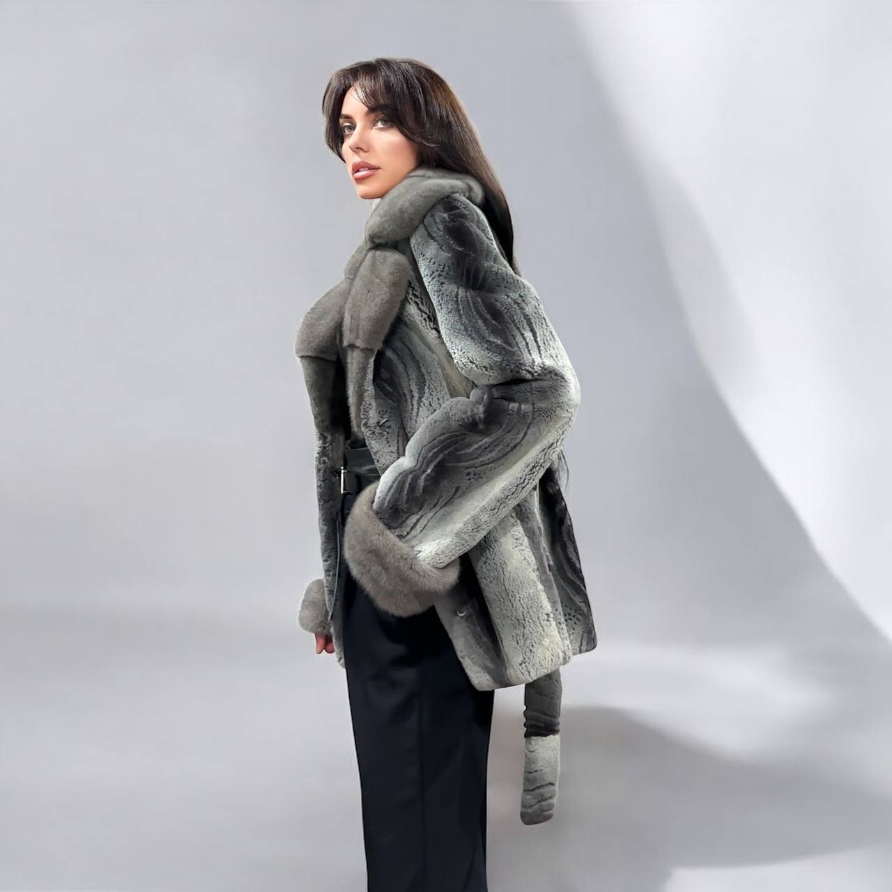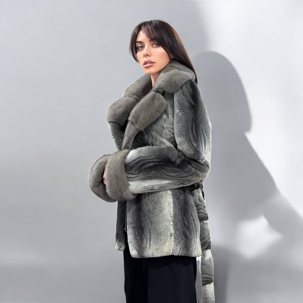 Indulge in ultimate luxury with this gorgeous fur jacket crafted from premium karakul (astrakhan) fur, beautifully dyed to mimic the exquisite patterns of chinchilla. The luxurious natural mink fur collar and sleeve cuffs add sophistication and warmth, making this coat a true statement piece.
