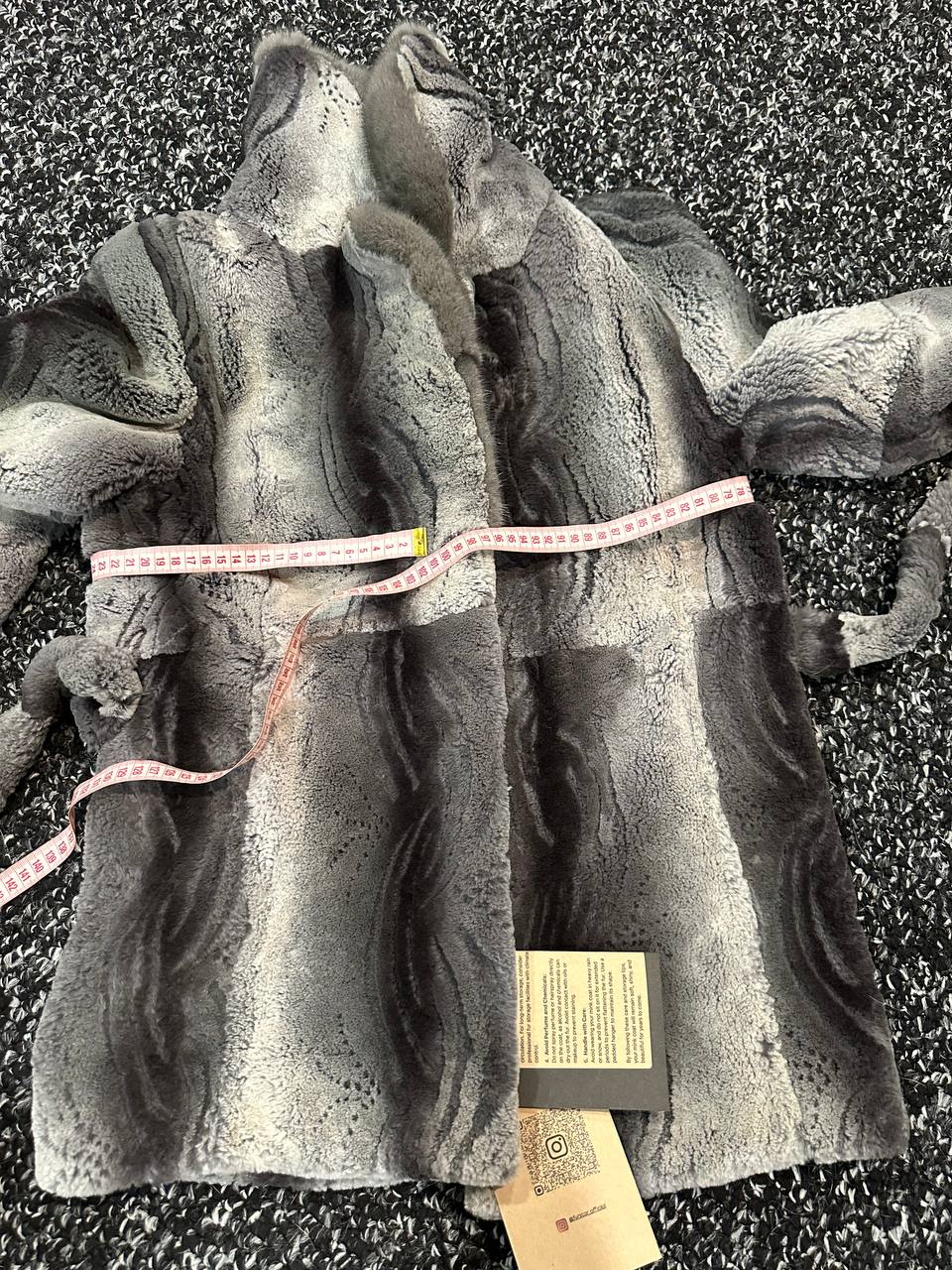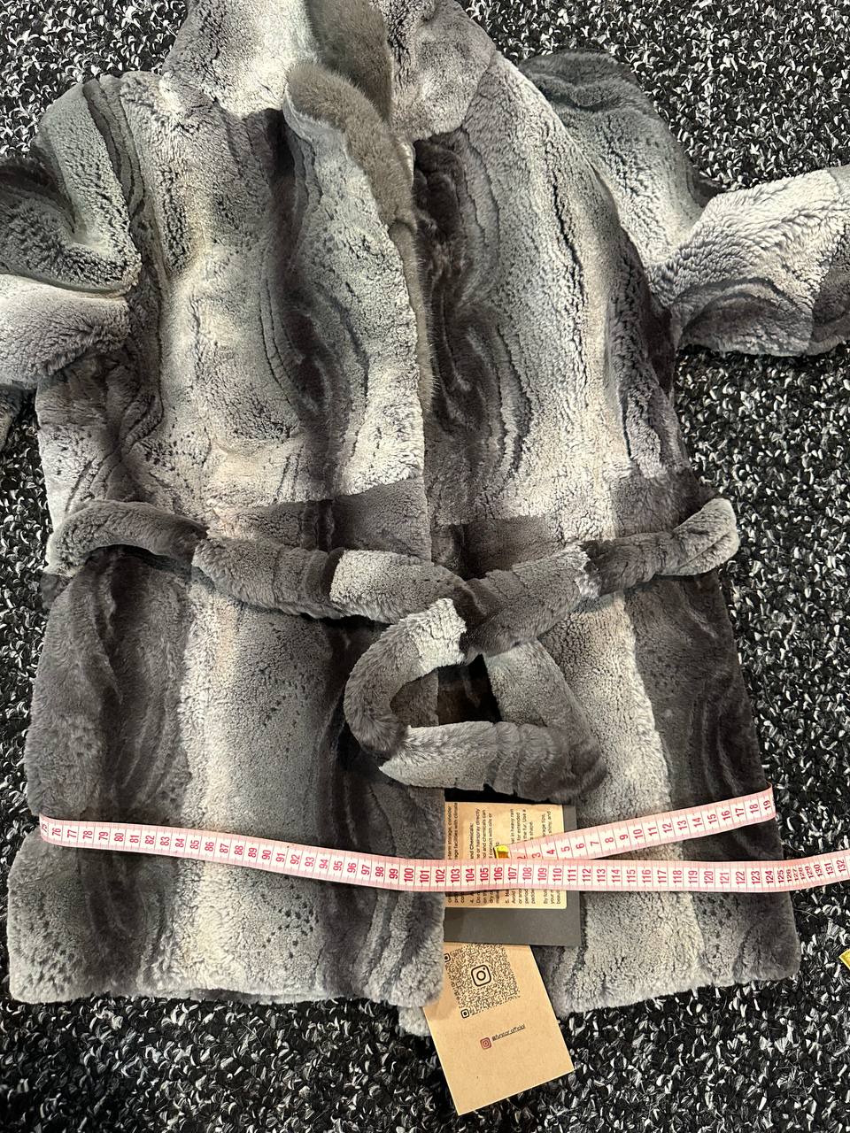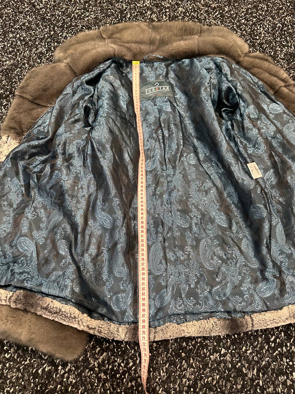 This is a luxury women’s fur jacket made from karakul (astrakhan) fur with like chinchilla-dyed finish. The collar and sleeve cuffs are made from natural mink fur, adding extra softness and elegance. The lining is high-quality jacquard fabric with a paisley pattern. Brand: FURSTAR, Size: M.
