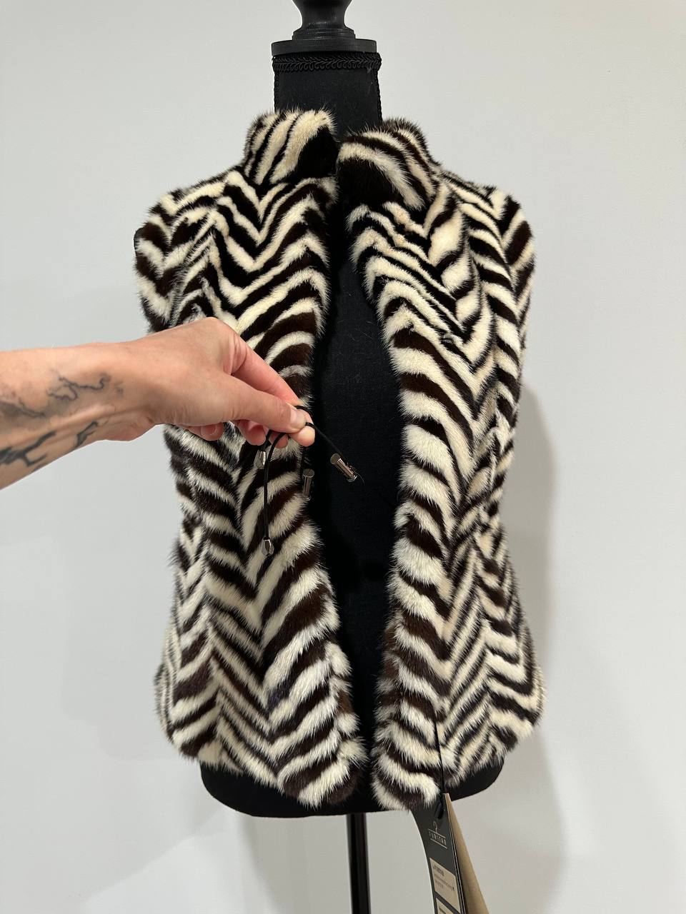 REAL MINK FUR vest in zebra print, straight fitted model with drawstring at the waist. Made from mink pieces in dark brown and cream colors. There are two outside pockets. This sleeveless jacket is fastened with hooks. Lining viscose to match the fur, the hem is sewn. The mink is natural, the fur is thick, shiny, soft. Ukrainian manufacturer. UNIQUE MODEL, EXCLUSIVE, TRADE BRAND FURSTAR