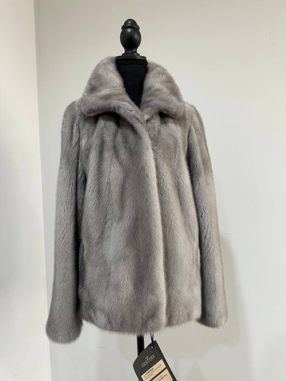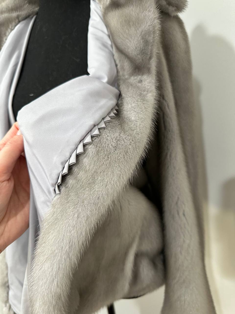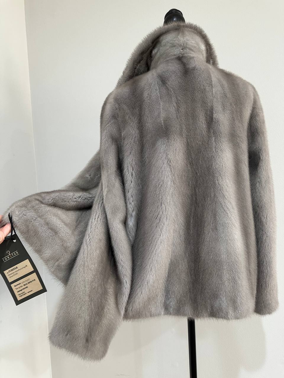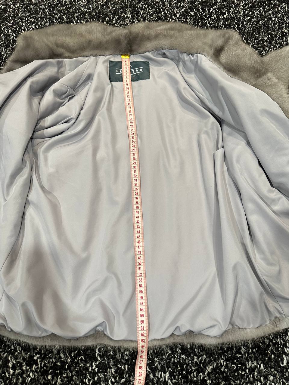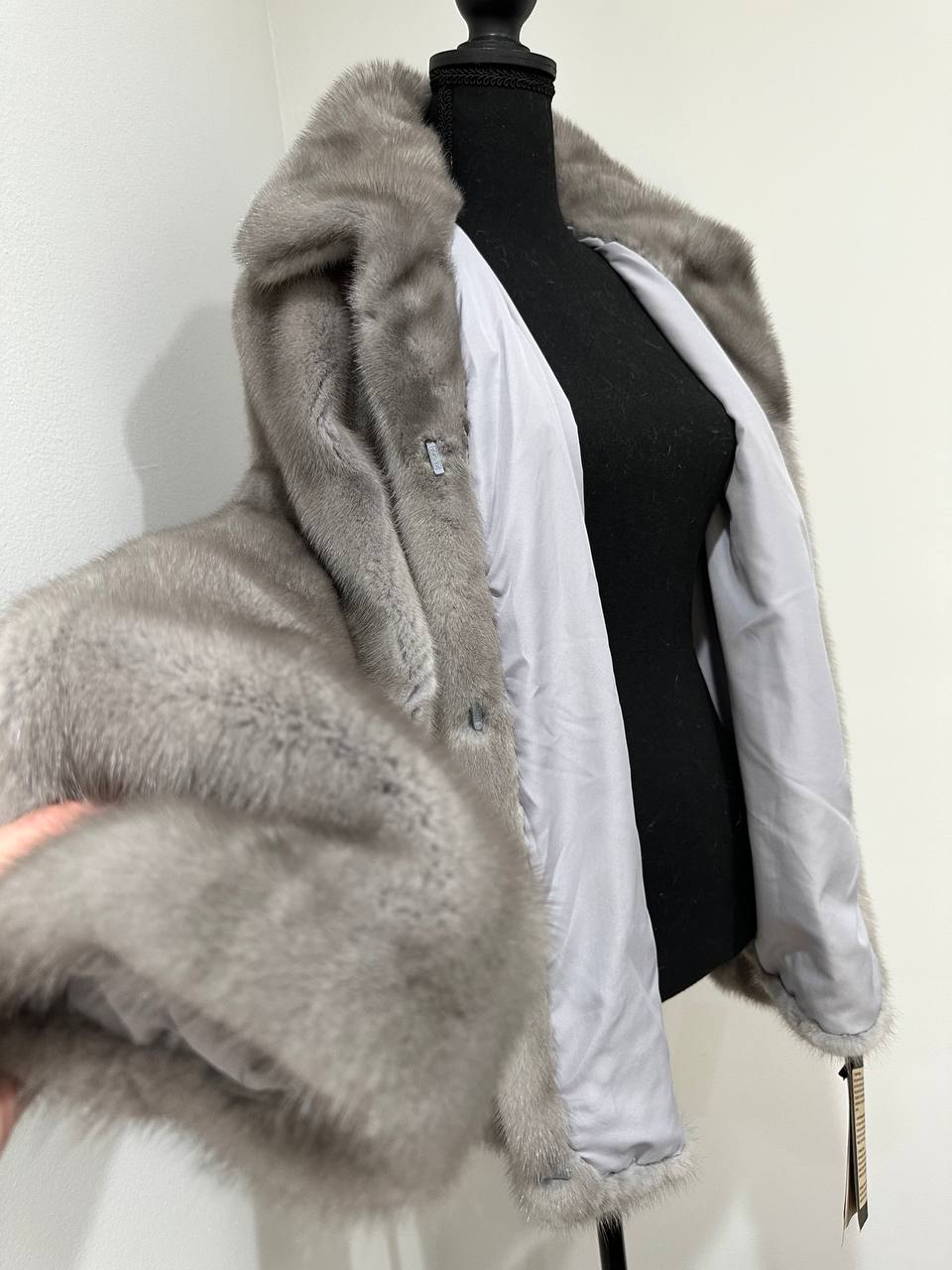 branded women's short mink coat made of luxurious Finnish mink, size M. The model is straight, there are 2 pockets. Fur - natural color, grey. Soft chic, delicate pile, thick down, soft, warm. Solid plates. Viscose lining, sewn hem. There is also 1 pocket inside. Ukrainian manufacturer.