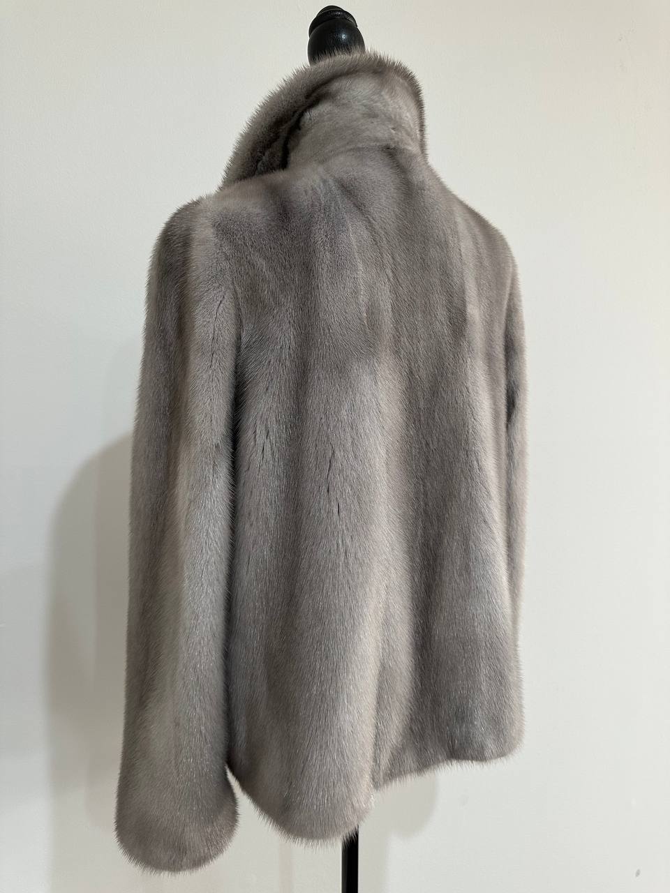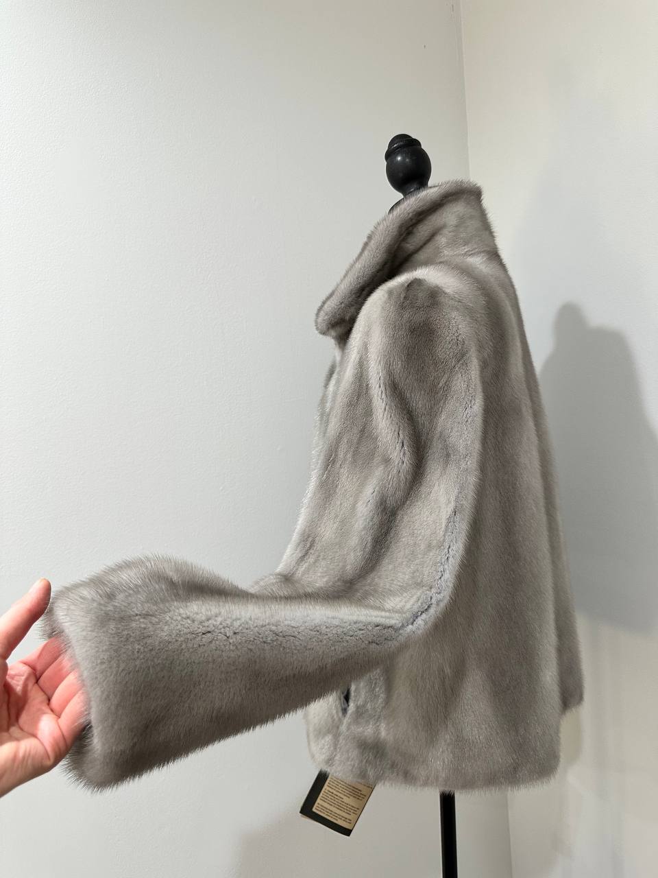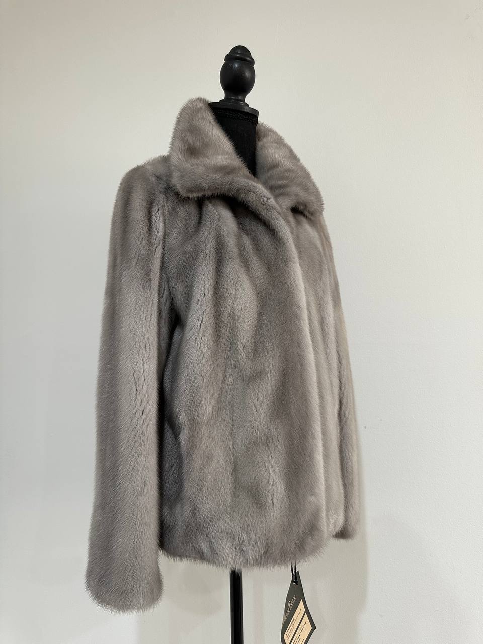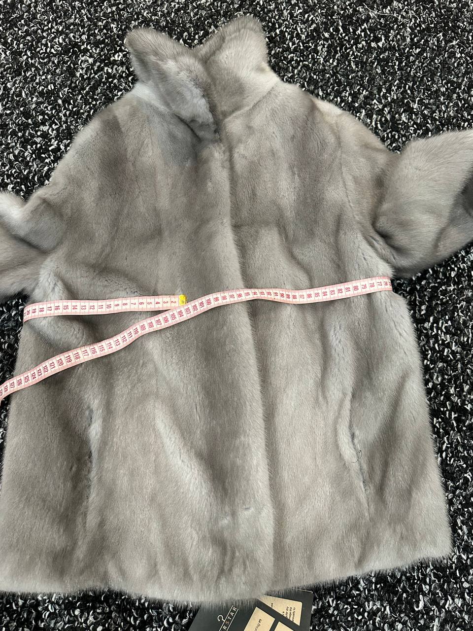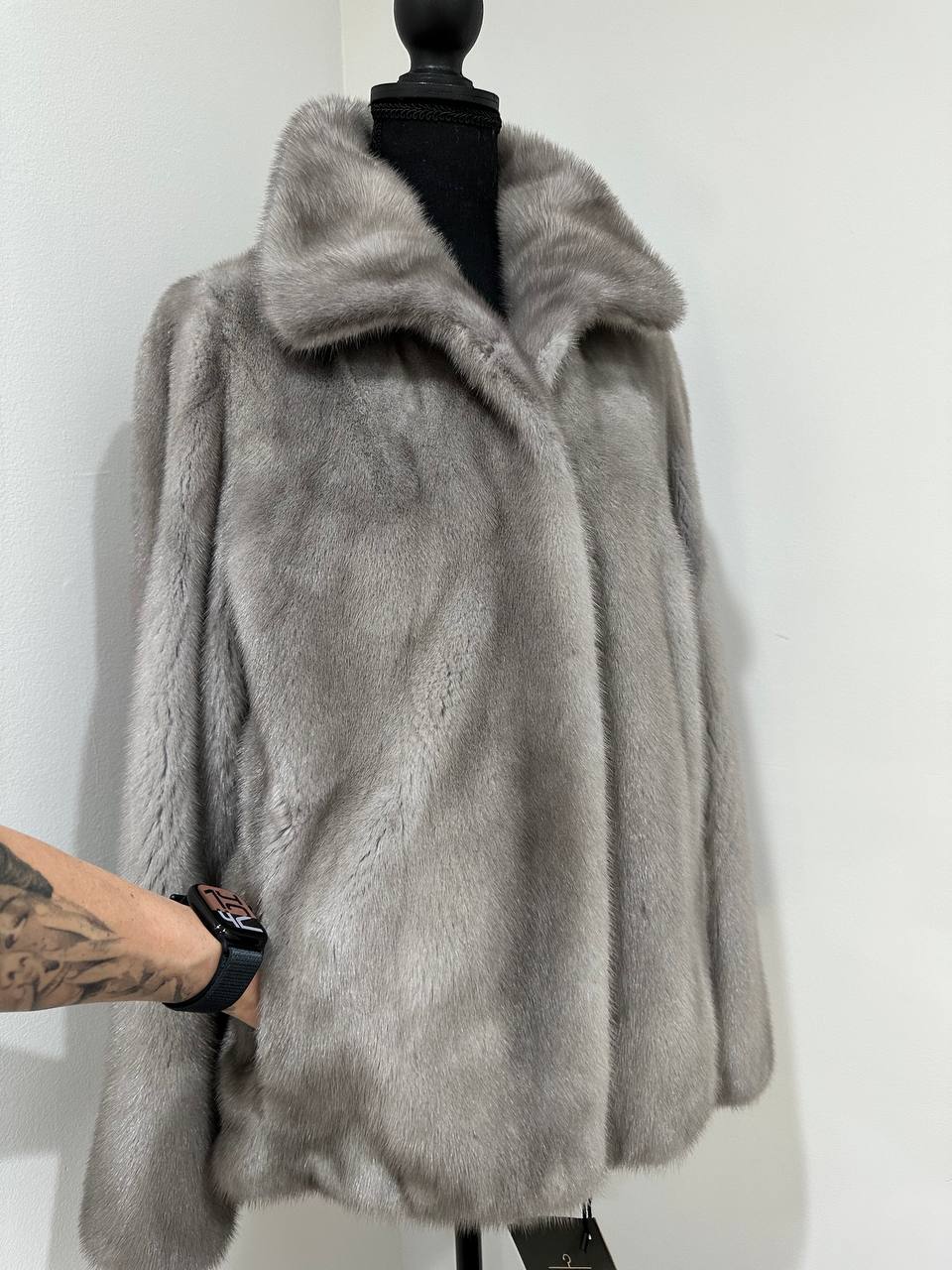 branded women's short mink coat made of luxurious Finnish mink, size M. The model is straight, there are 2 pockets. Fur - natural color, grey. Soft chic, delicate pile, thick down, soft, warm. Solid plates. Viscose lining, sewn hem. There is also 1 pocket inside. Ukrainian manufacturer.