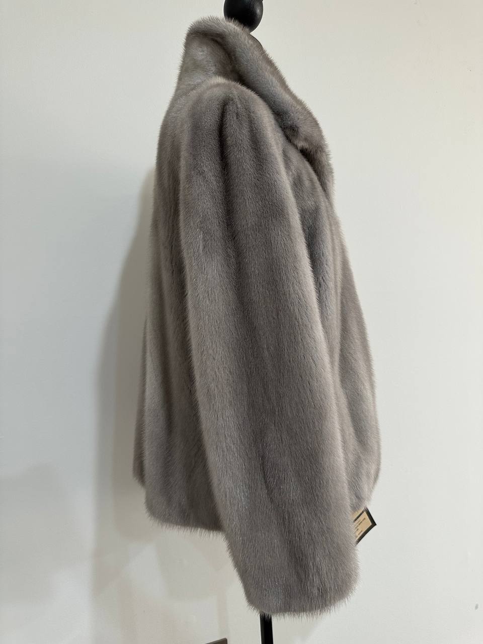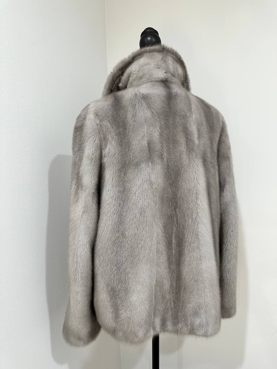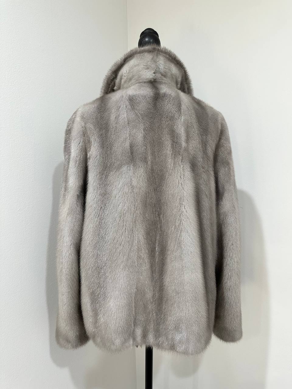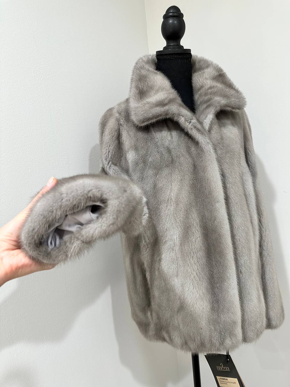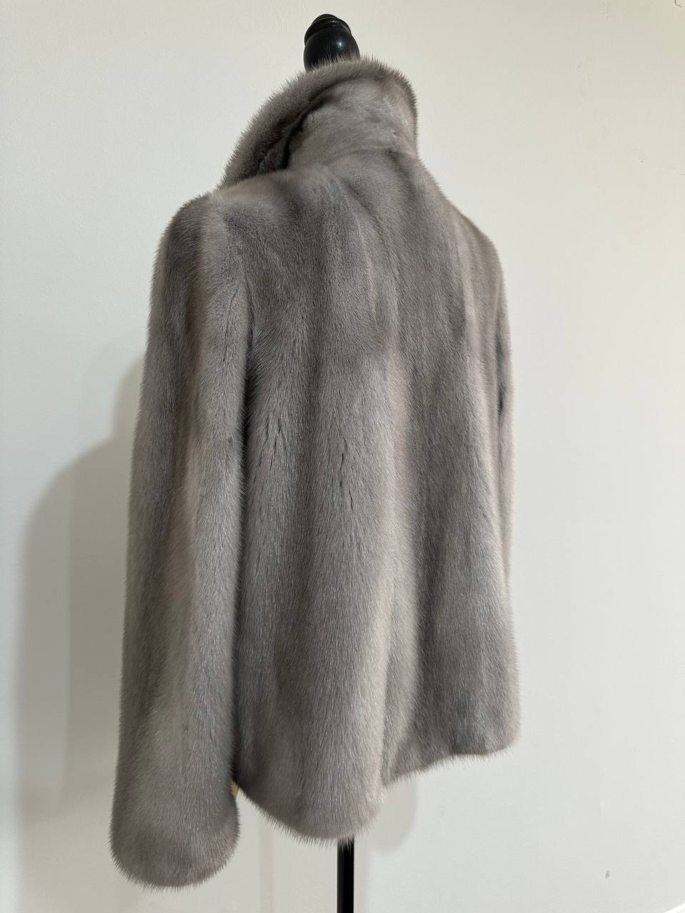 branded women's short mink coat made of luxurious Finnish mink, size M. The model is straight, there are 2 pockets. Fur - natural color, grey. Soft chic, delicate pile, thick down, soft, warm. Solid plates. Viscose lining, sewn hem. There is also 1 pocket inside. Ukrainian manufacturer.