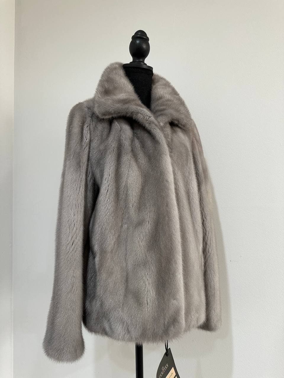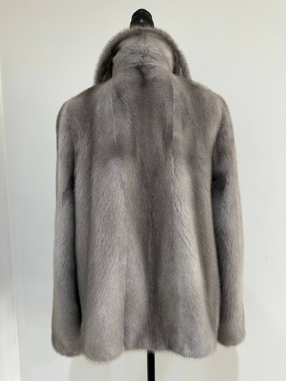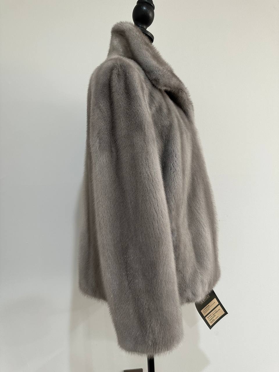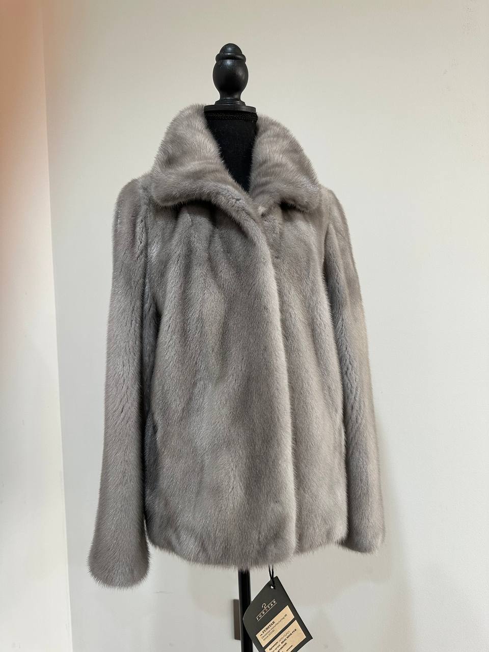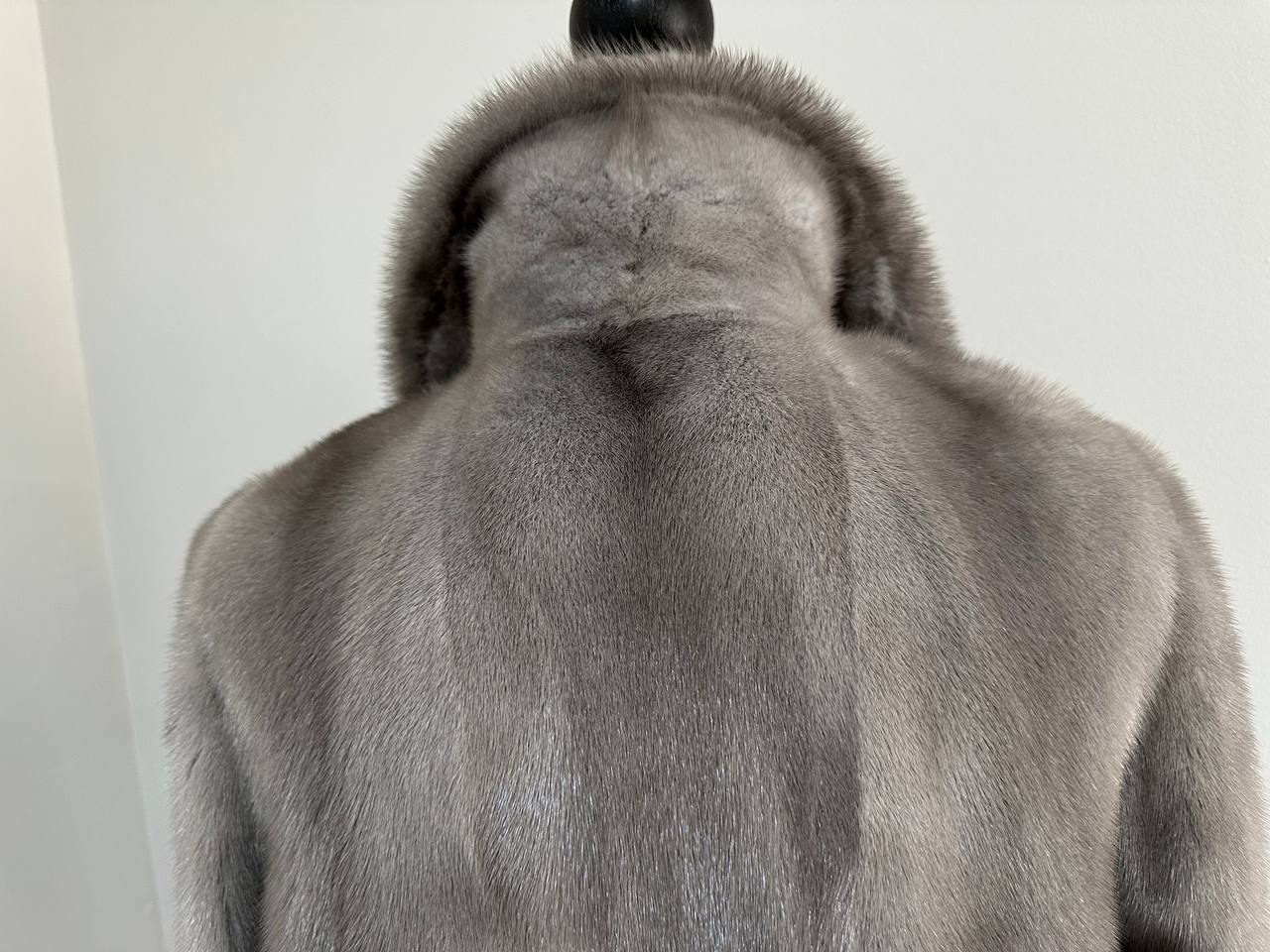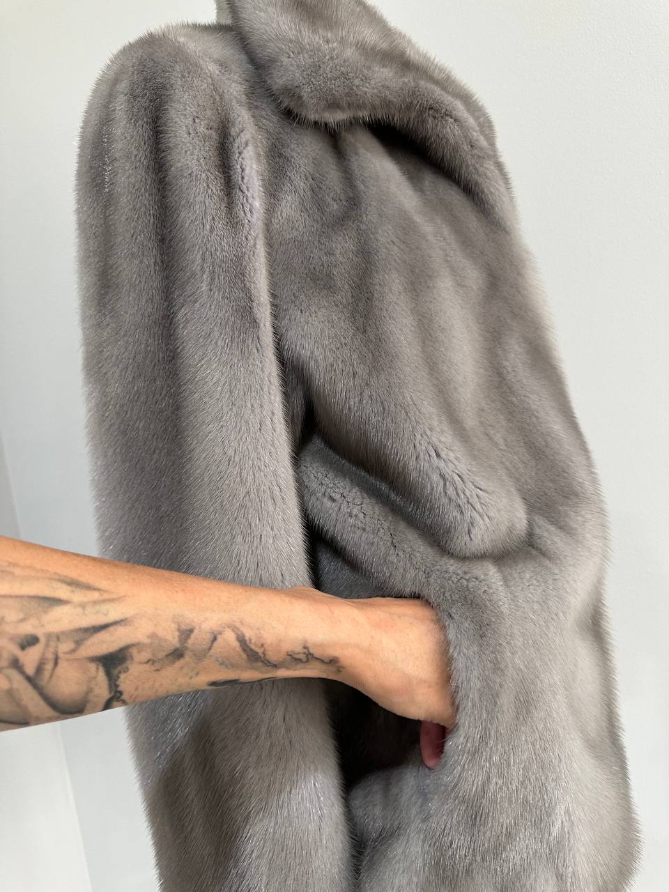 branded women's short mink coat made of luxurious Finnish mink, size M. The model is straight, there are 2 pockets. Fur - natural color, grey. Soft chic, delicate pile, thick down, soft, warm. Solid plates. Viscose lining, sewn hem. There is also 1 pocket inside. Ukrainian manufacturer.