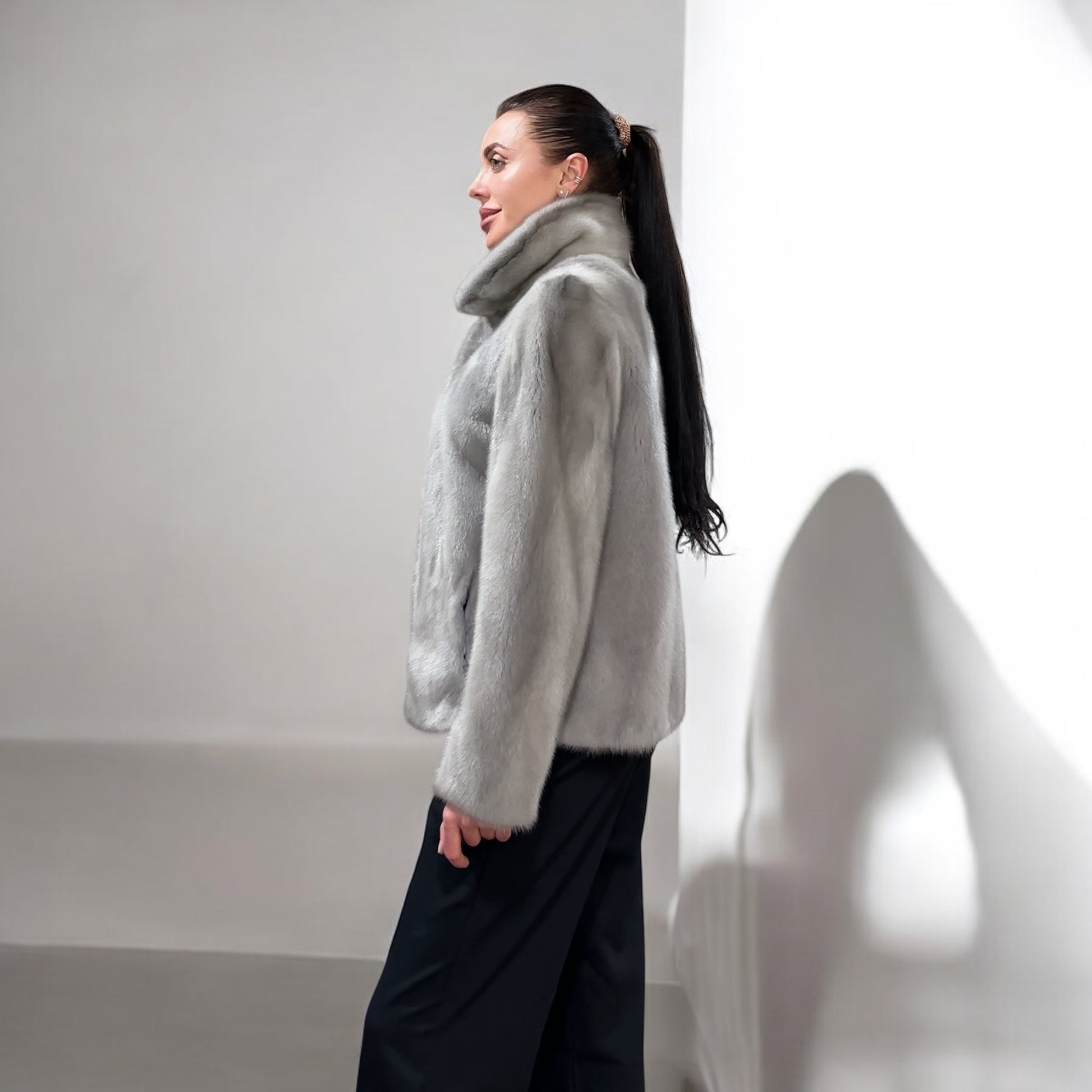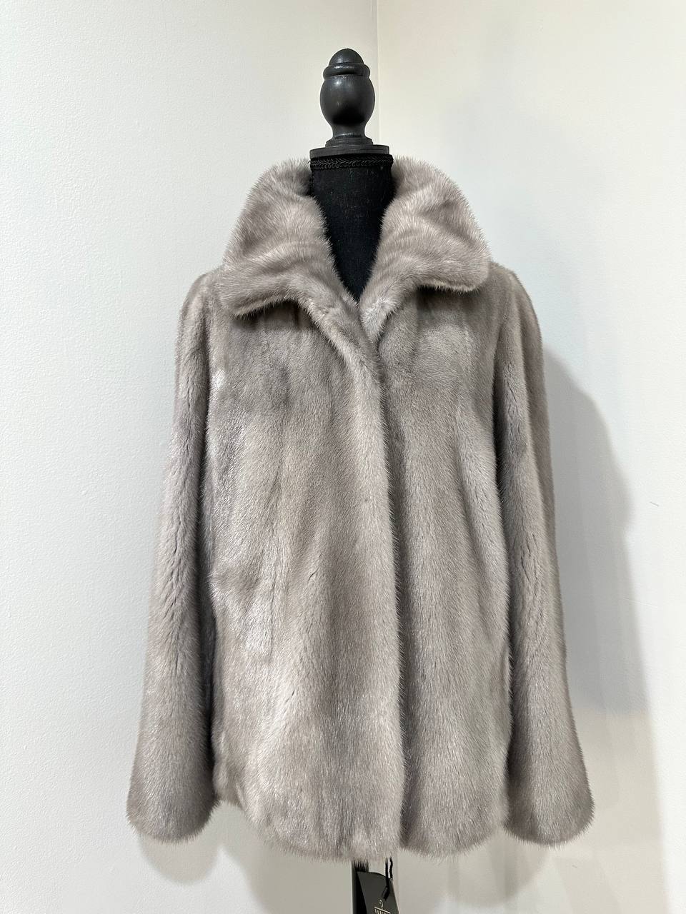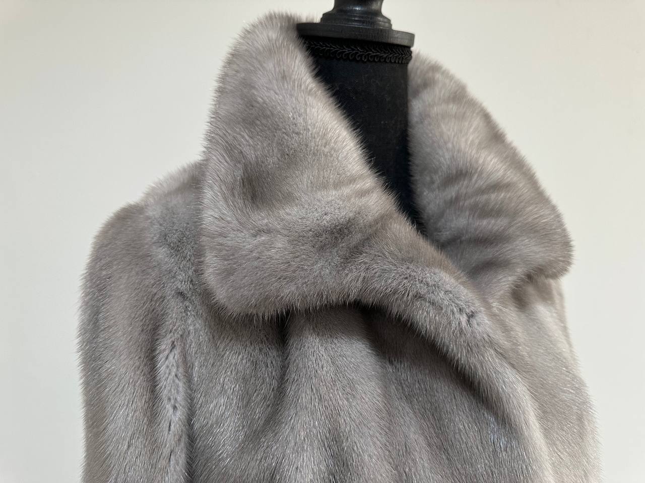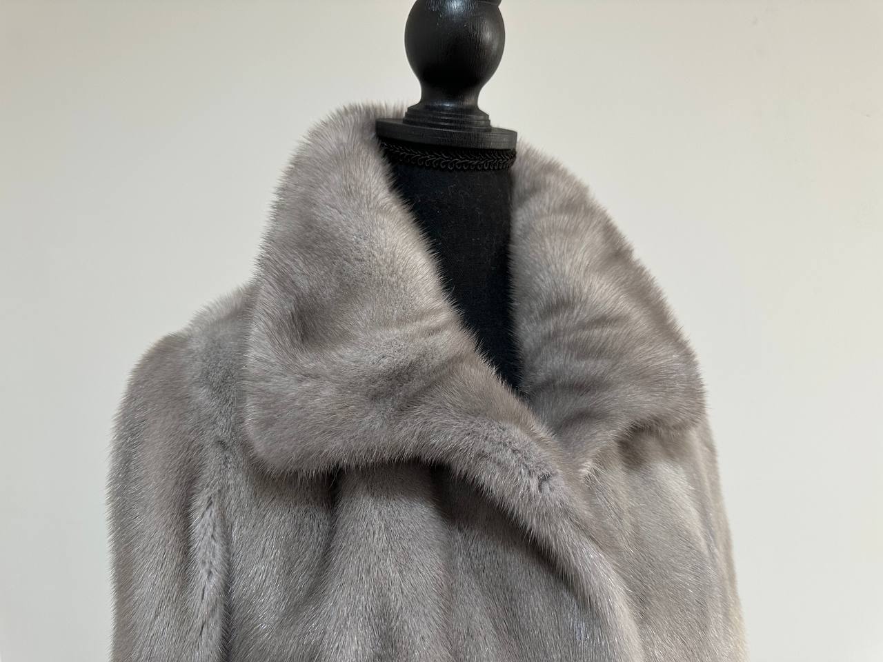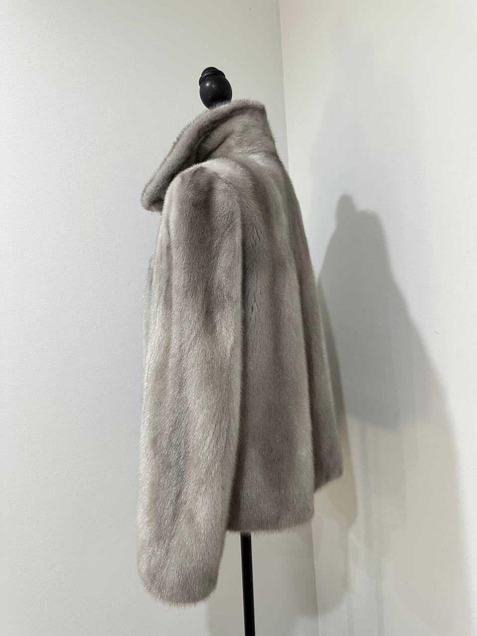 branded women's short mink coat made of luxurious Finnish mink, size M. The model is straight, there are 2 pockets. Fur - natural color, grey. Soft chic, delicate pile, thick down, soft, warm. Solid plates. Viscose lining, sewn hem. There is also 1 pocket inside. Ukrainian manufacturer.