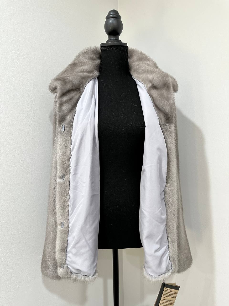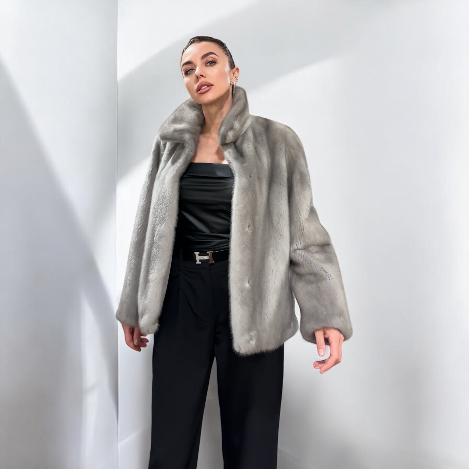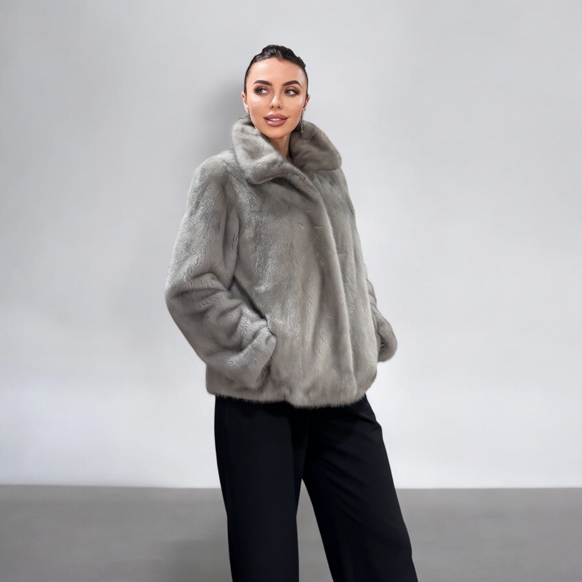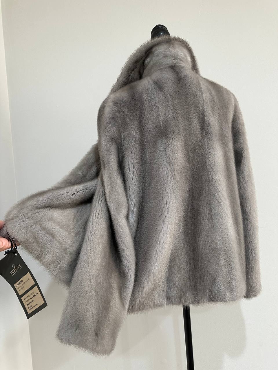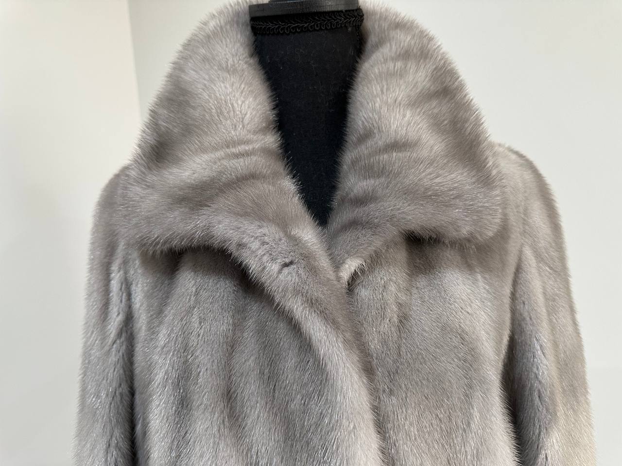 branded women's short mink coat made of luxurious Finnish mink, size M. The model is straight, there are 2 pockets. Fur - natural color, grey. Soft chic, delicate pile, thick down, soft, warm. Solid plates. Viscose lining, sewn hem. There is also 1 pocket inside. Ukrainian manufacturer.