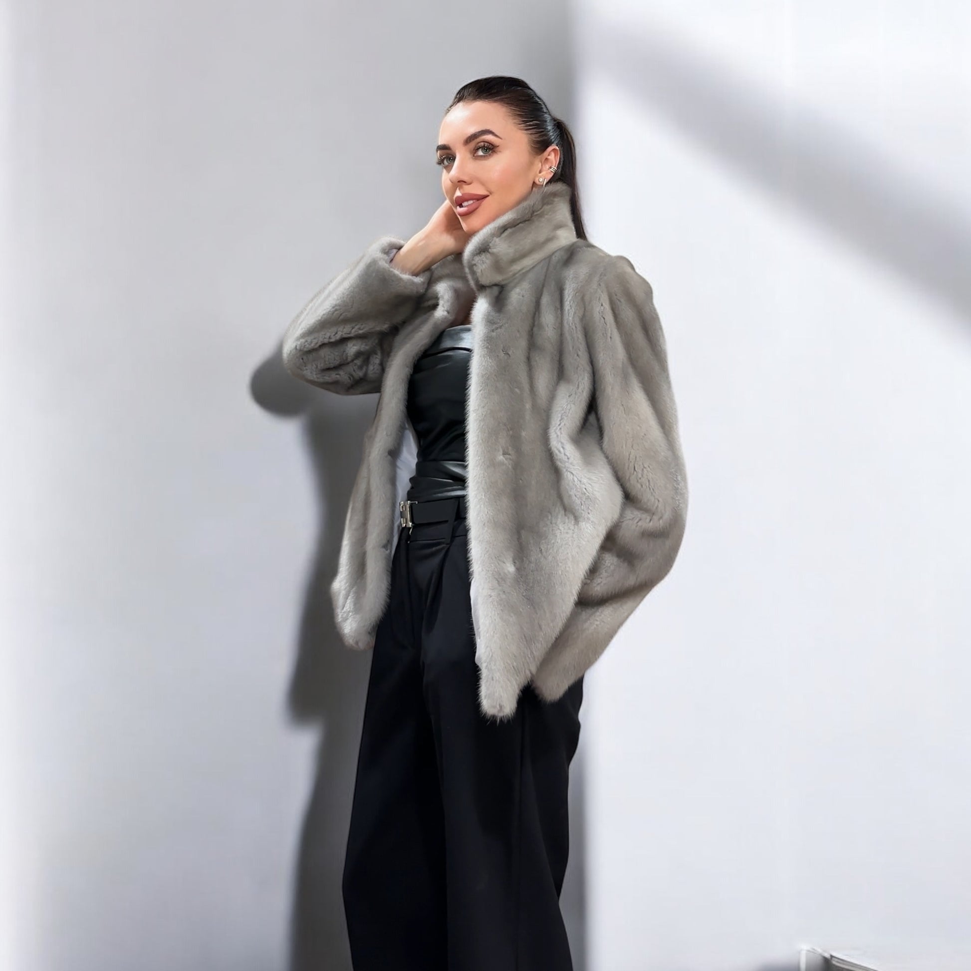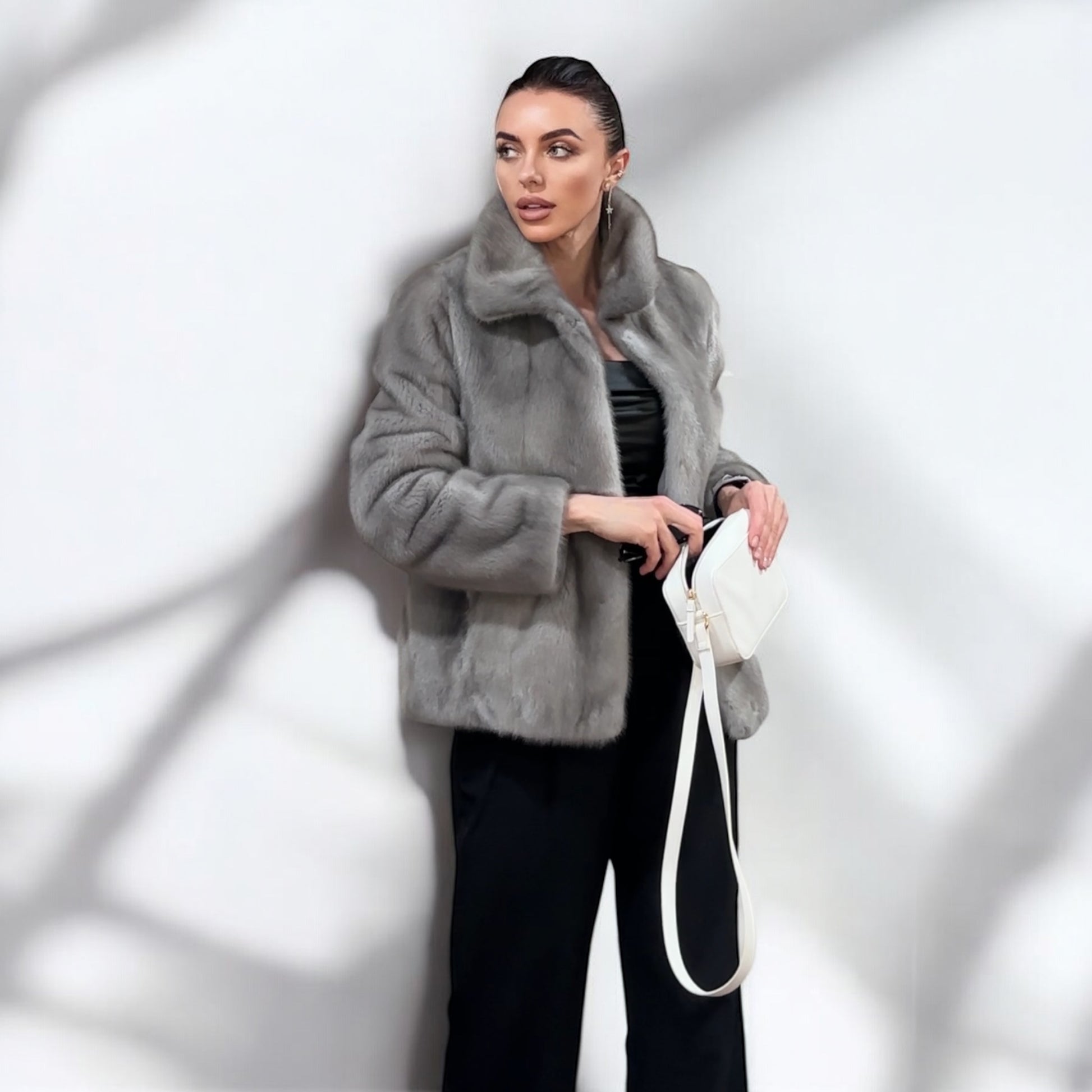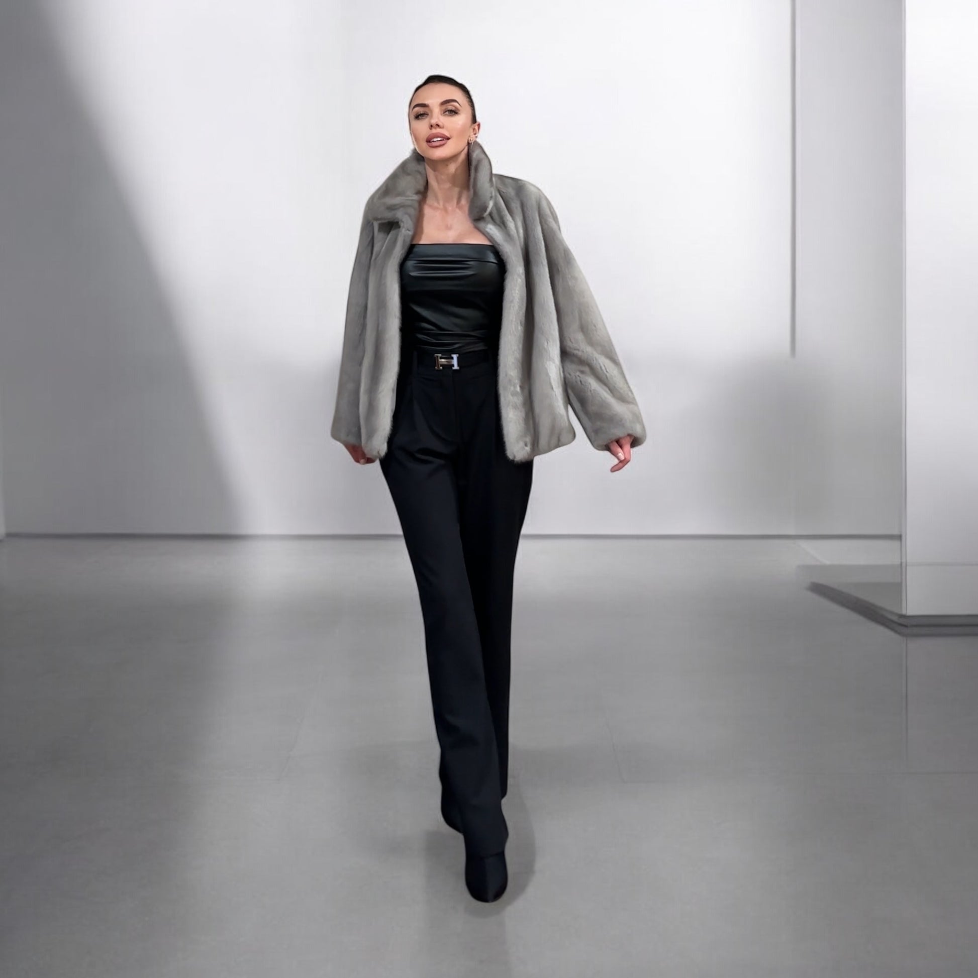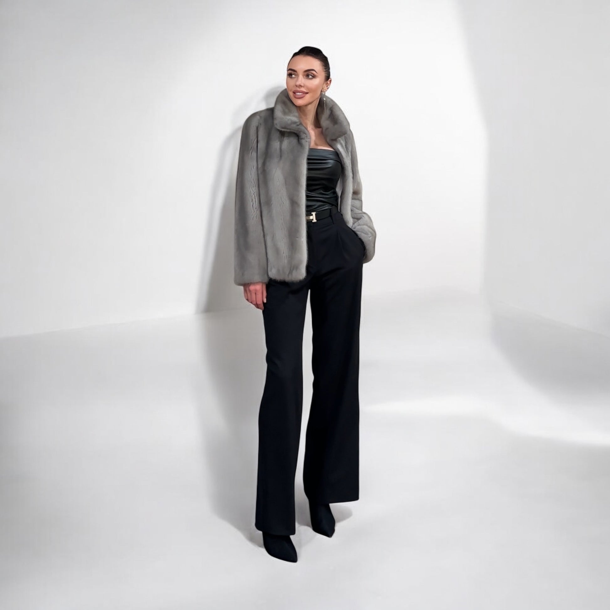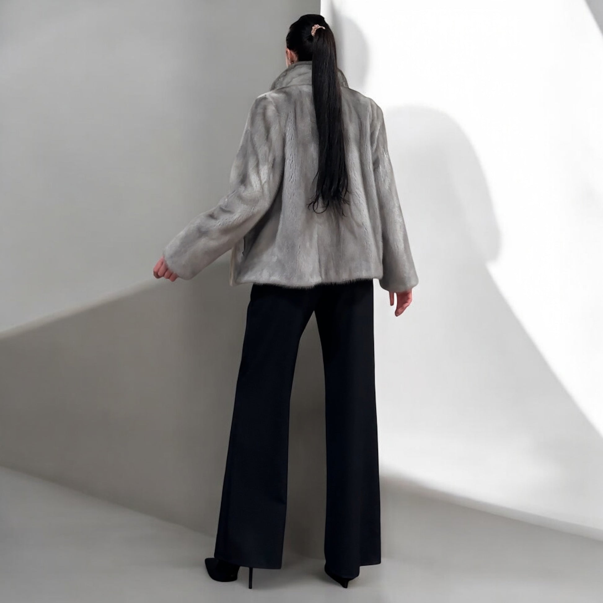 branded women's short mink coat made of luxurious Finnish mink, size M. The model is straight, there are 2 pockets. Fur - natural color, grey. Soft chic, delicate pile, thick down, soft, warm. Solid plates. Viscose lining, sewn hem. There is also 1 pocket inside. Ukrainian manufacturer.