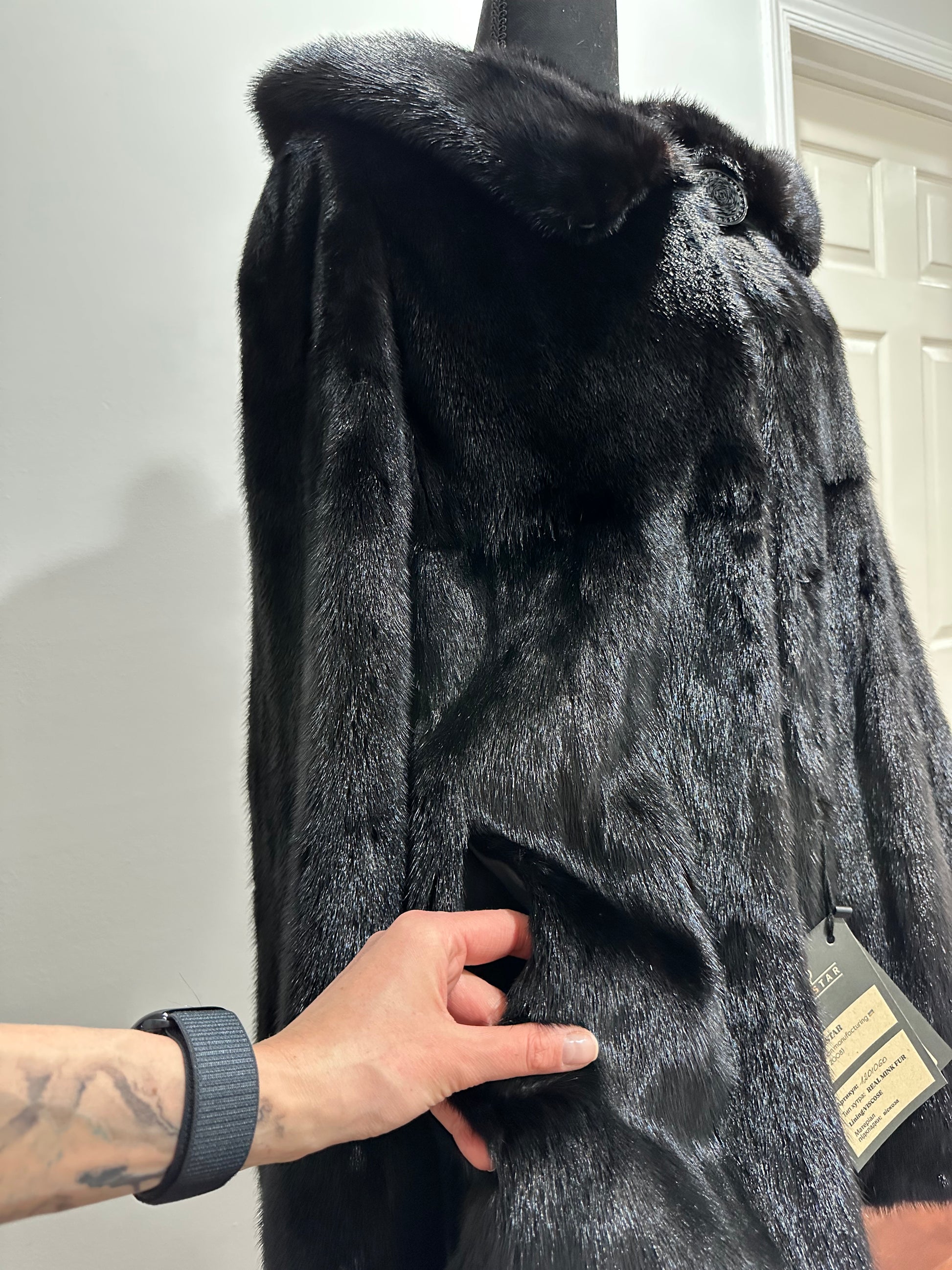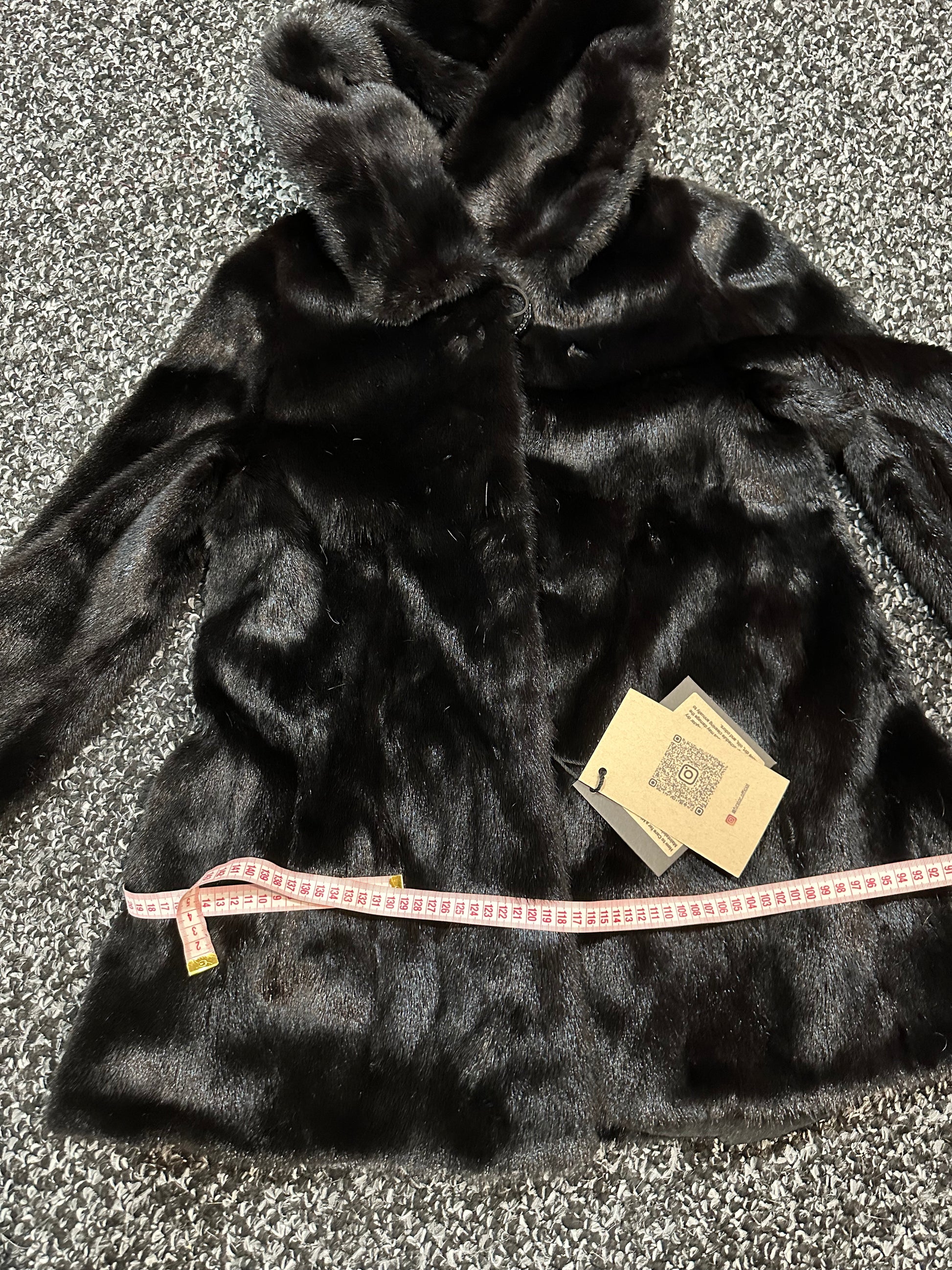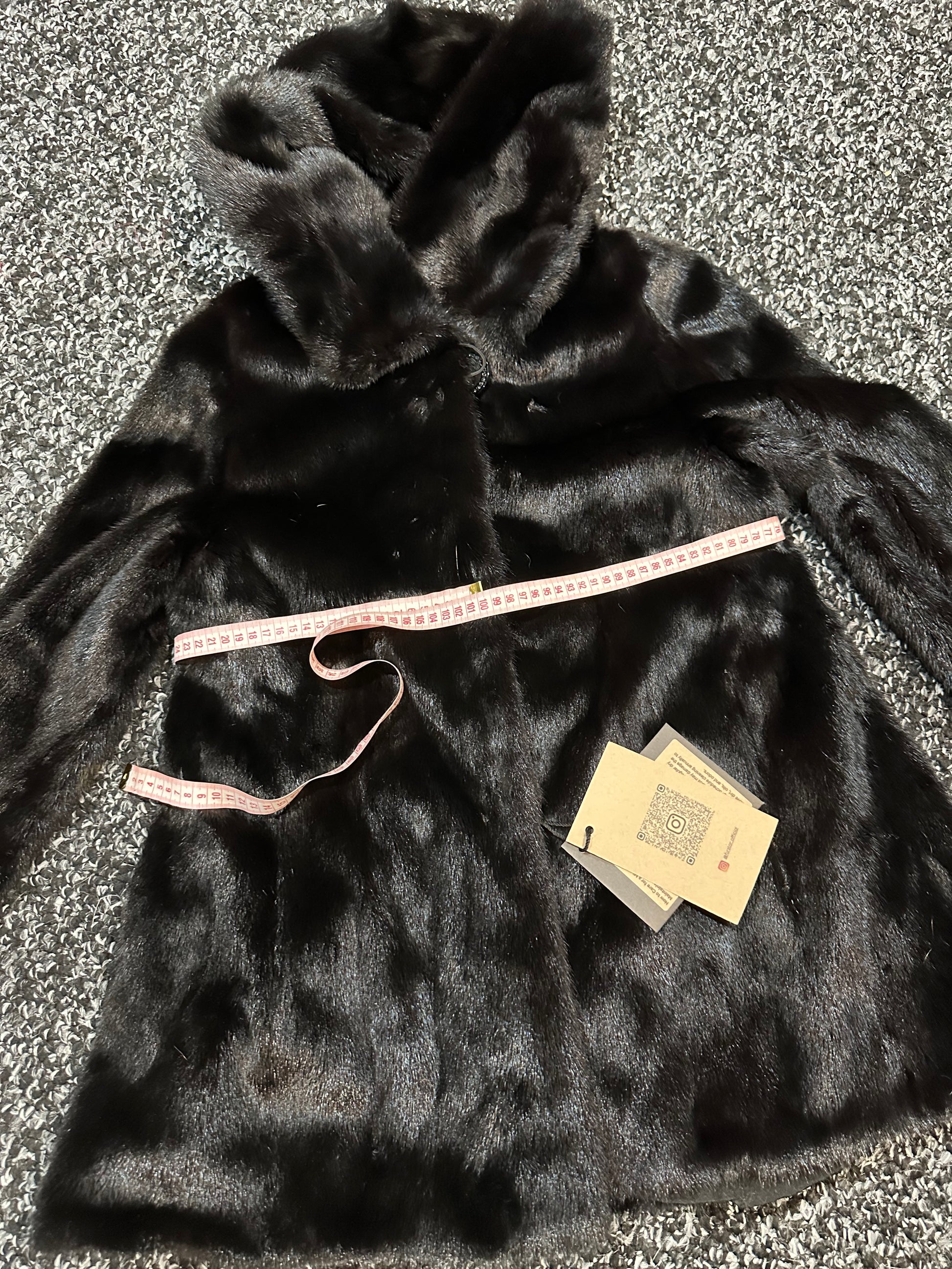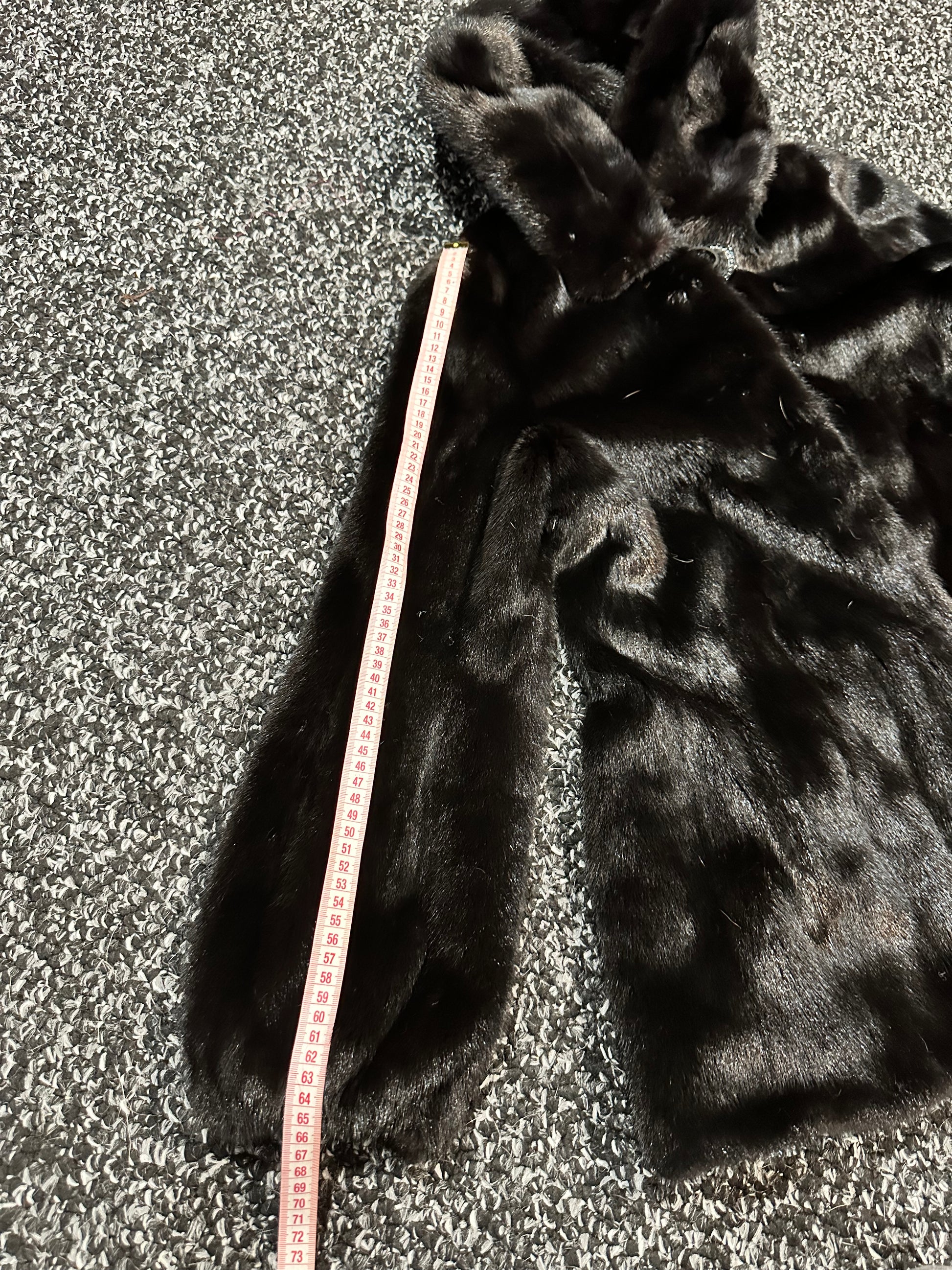 Women's mink fur coat with a hood size M. Color - deep BLACK, natural color. The sleeves are long. The fur is thick, fluffy, soft, shiny. There are 2 pockets. Fastens with hooks. Ukrainian manufacturer.