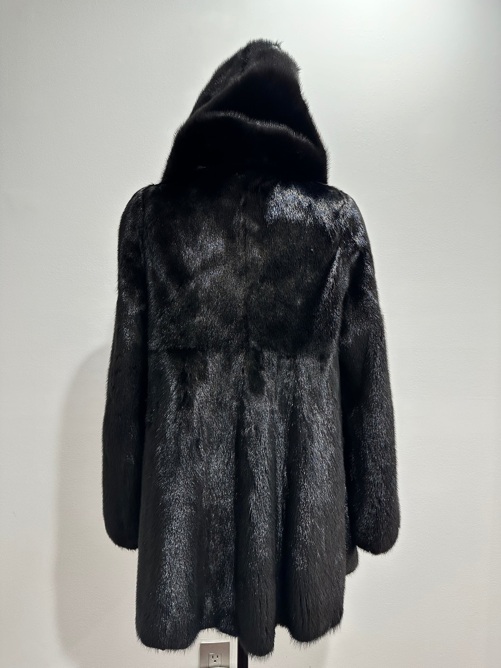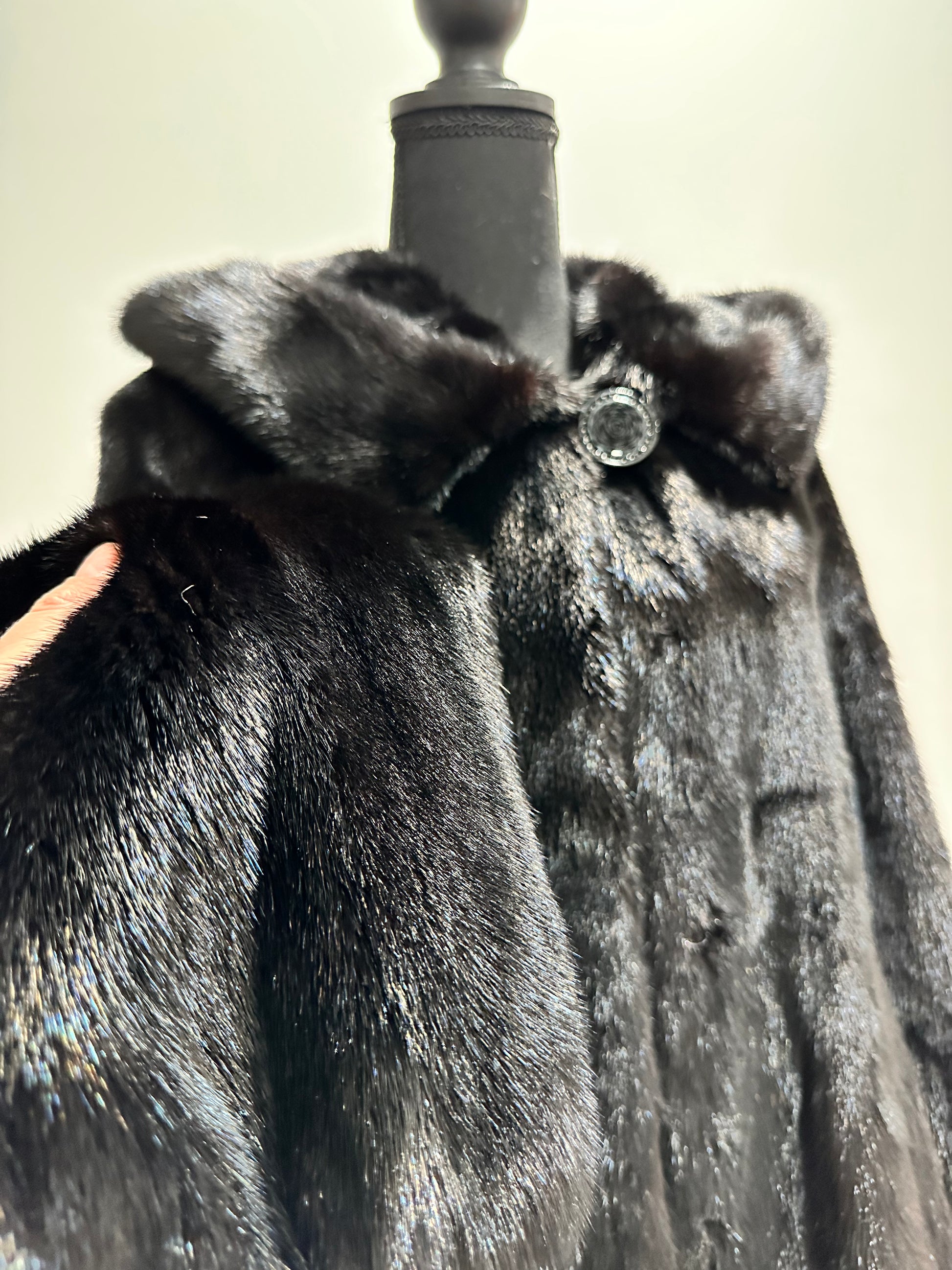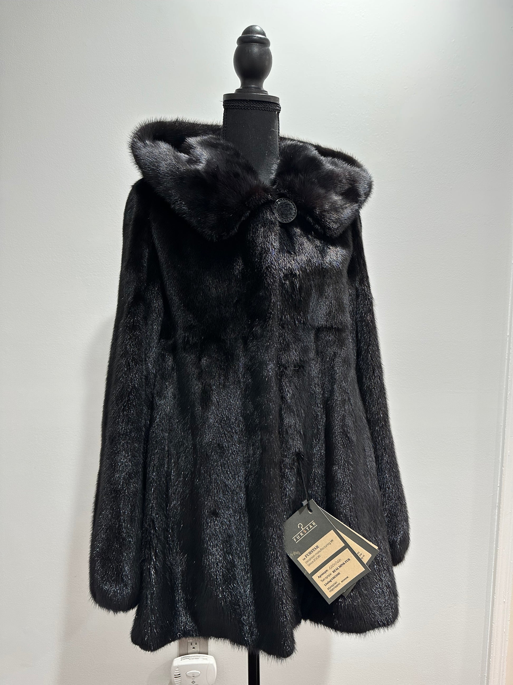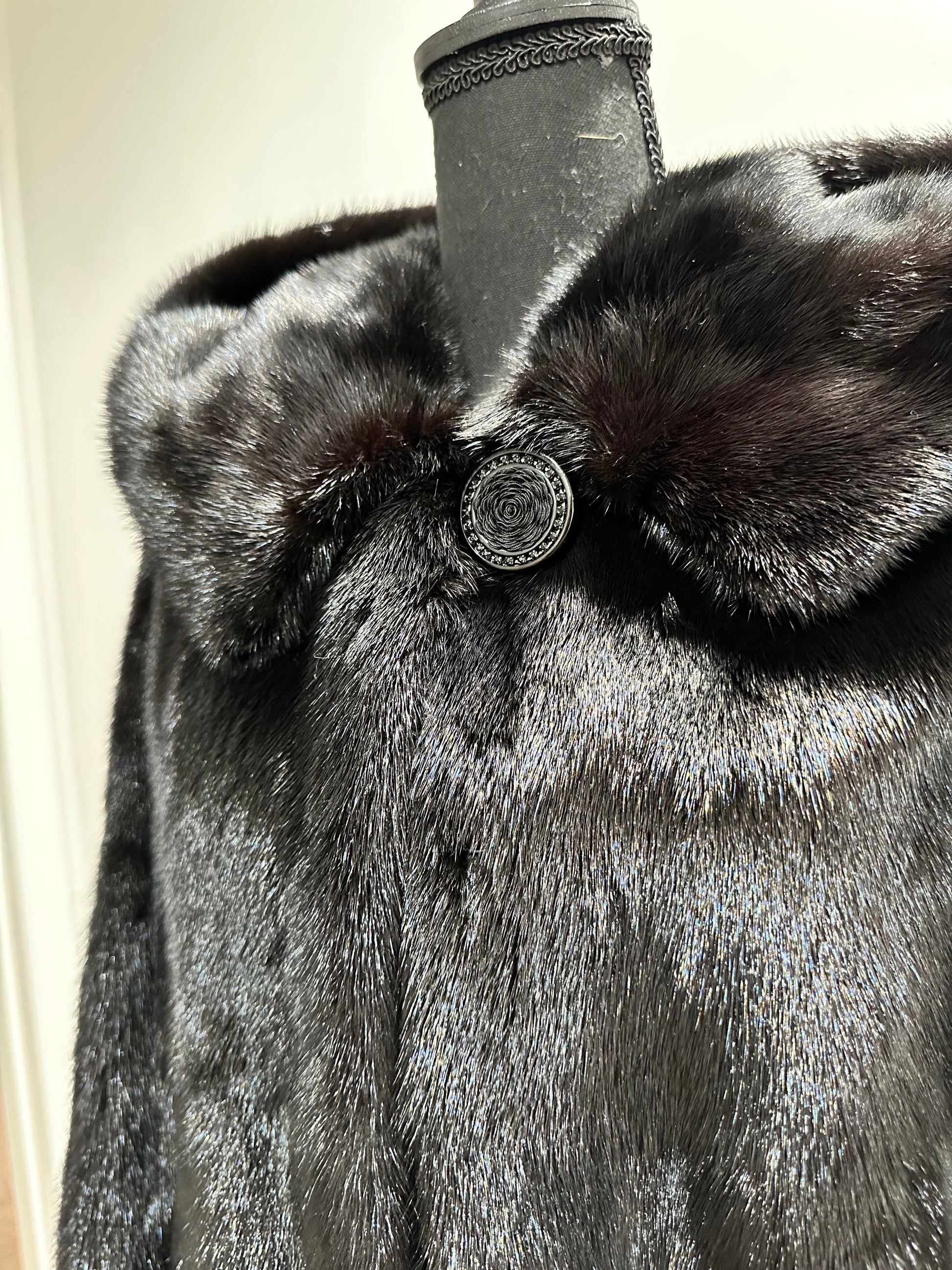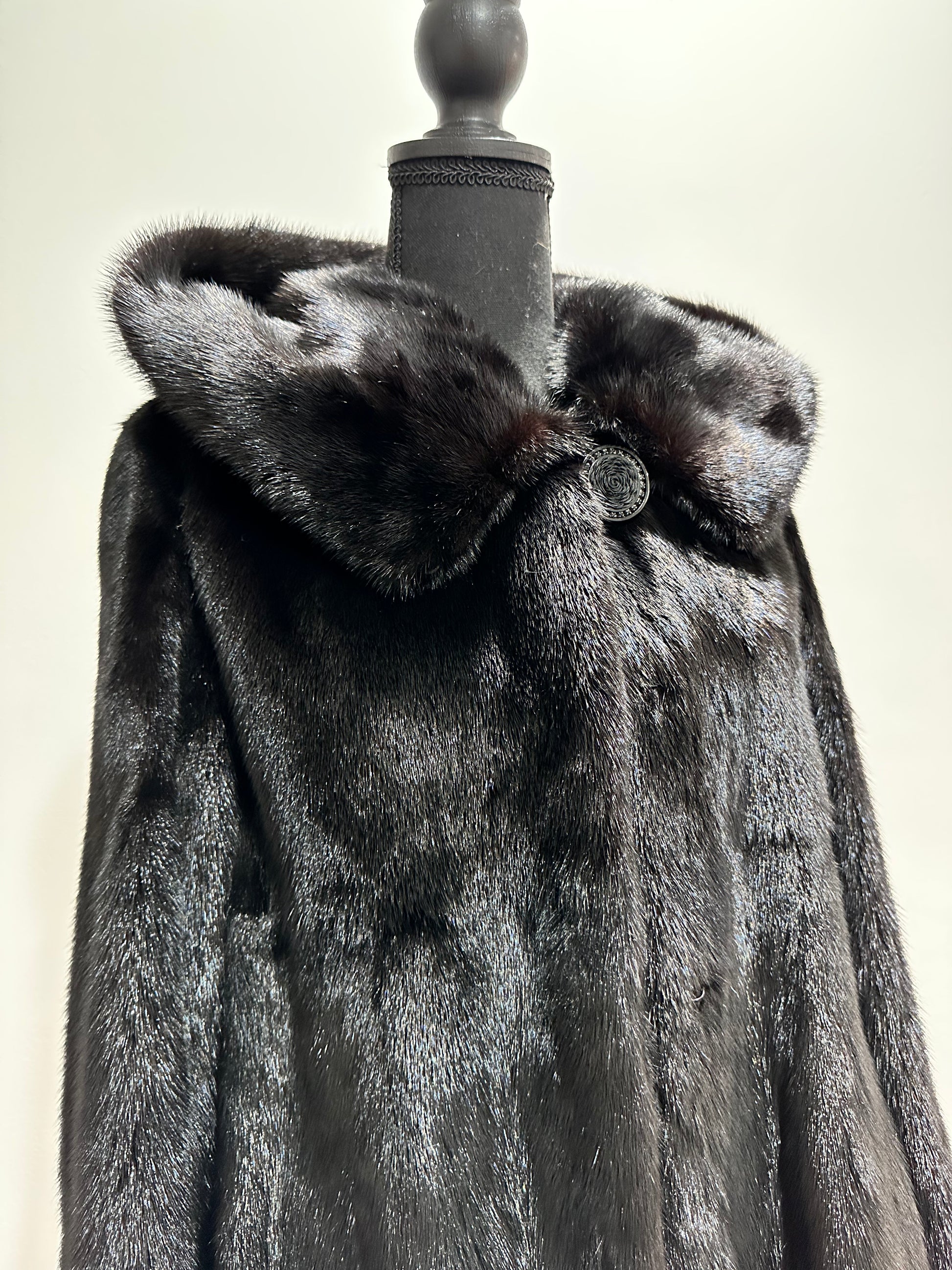Women's mink fur coat with a hood size M. Color - deep BLACK, natural color. The sleeves are long. The fur is thick, fluffy, soft, shiny. There are 2 pockets. Fastens with hooks. Ukrainian manufacturer.