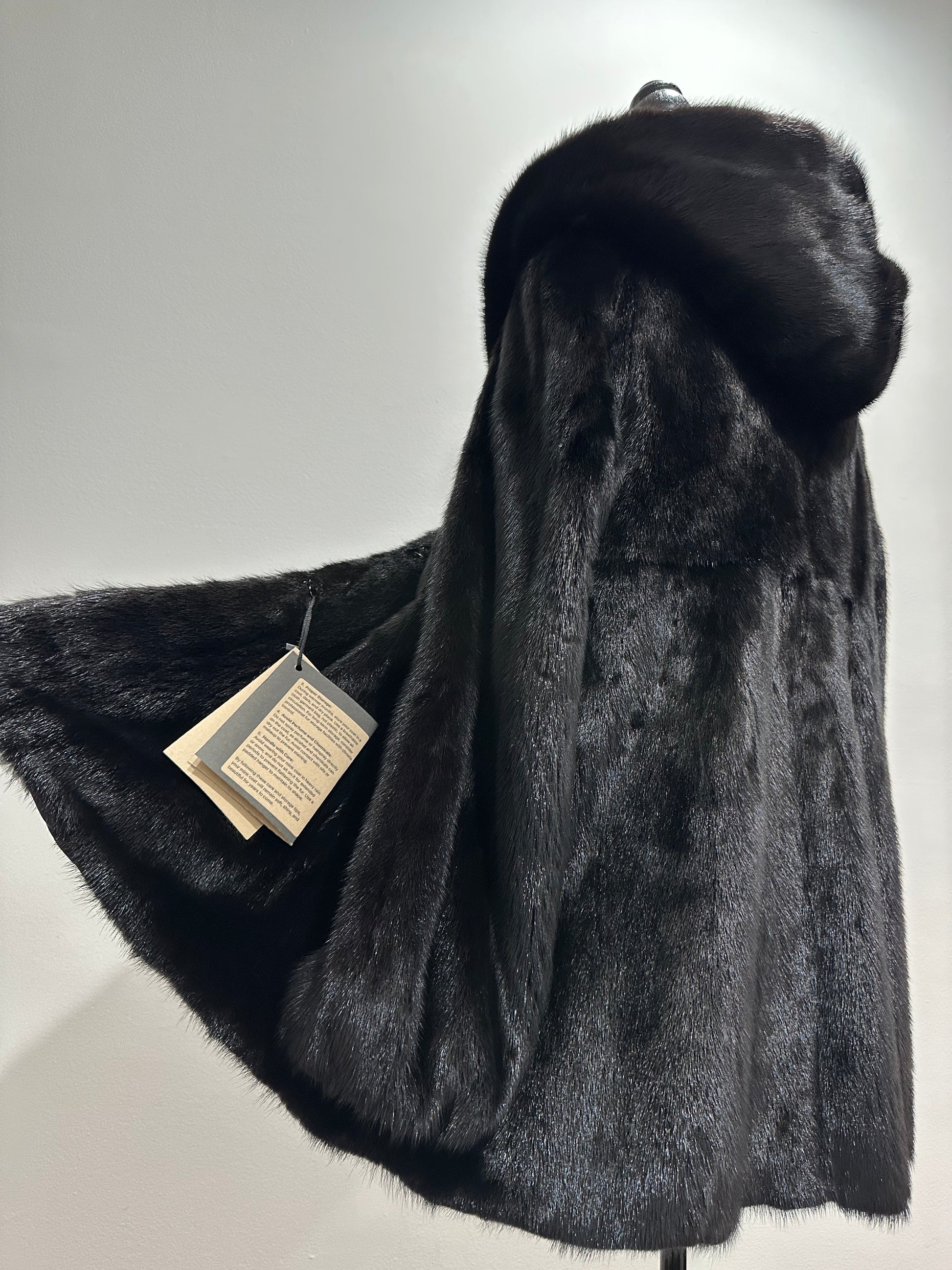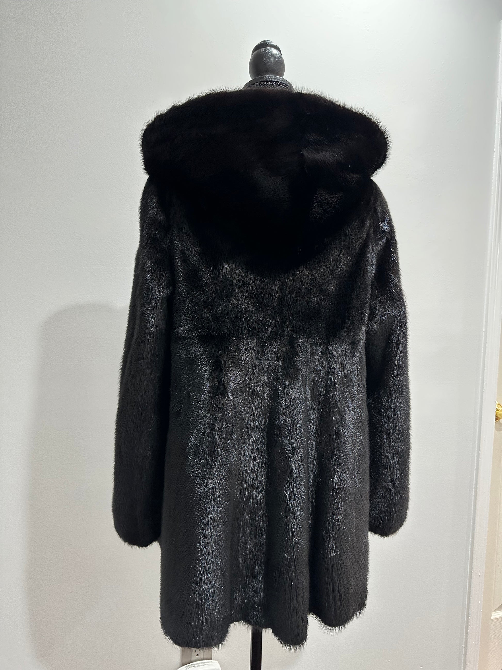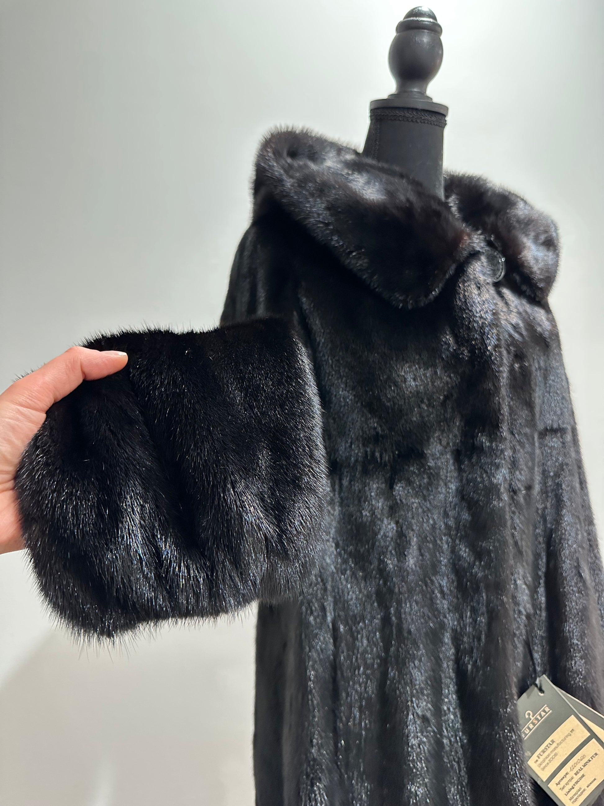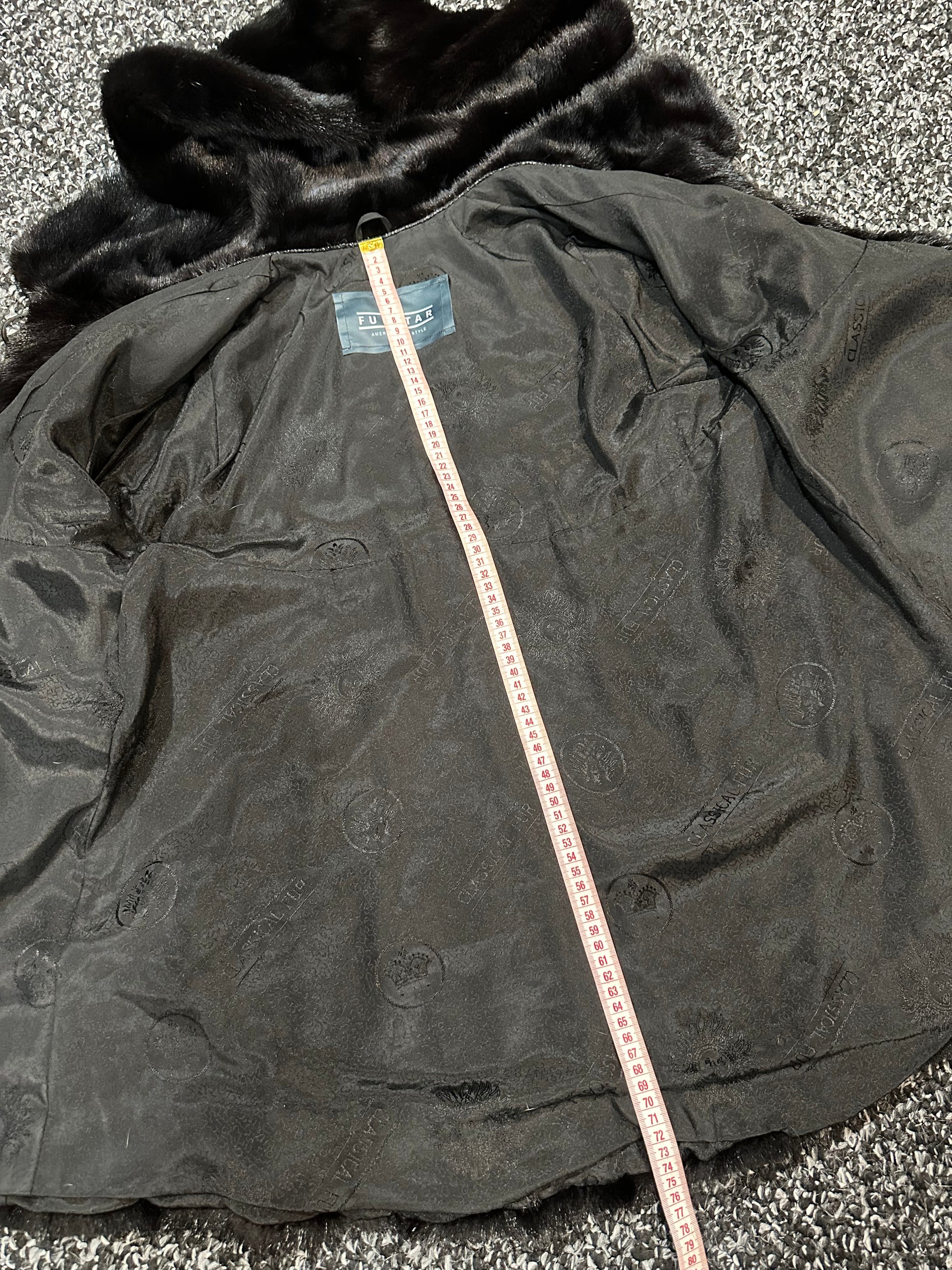 Women's mink fur coat with a hood size M. Color - deep BLACK, natural color. The sleeves are long. The fur is thick, fluffy, soft, shiny. There are 2 pockets. Fastens with hooks. Ukrainian manufacturer.