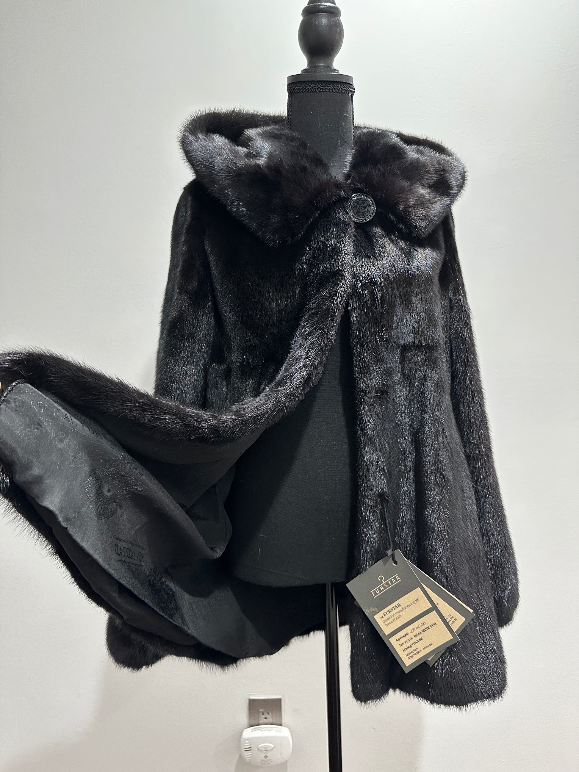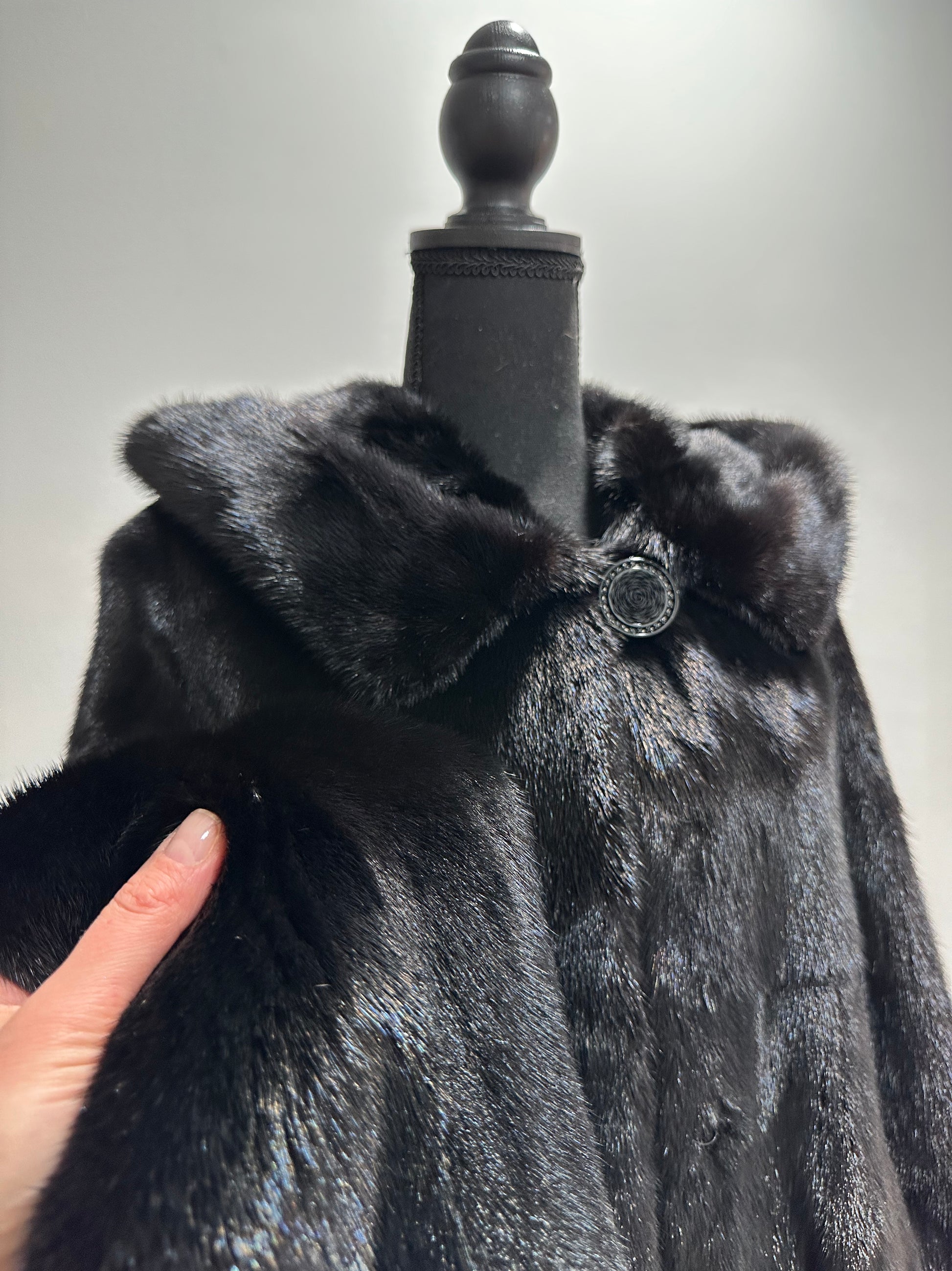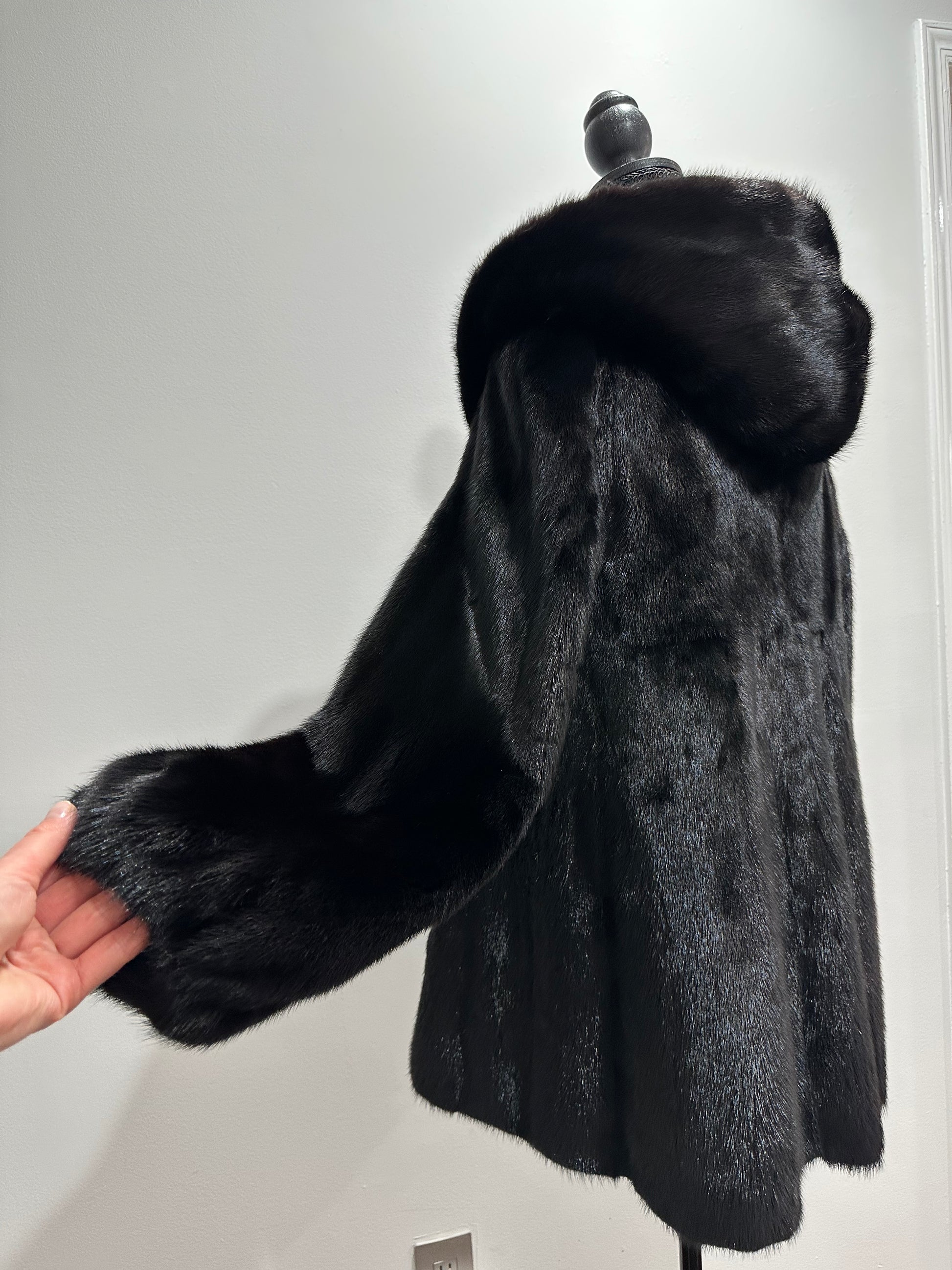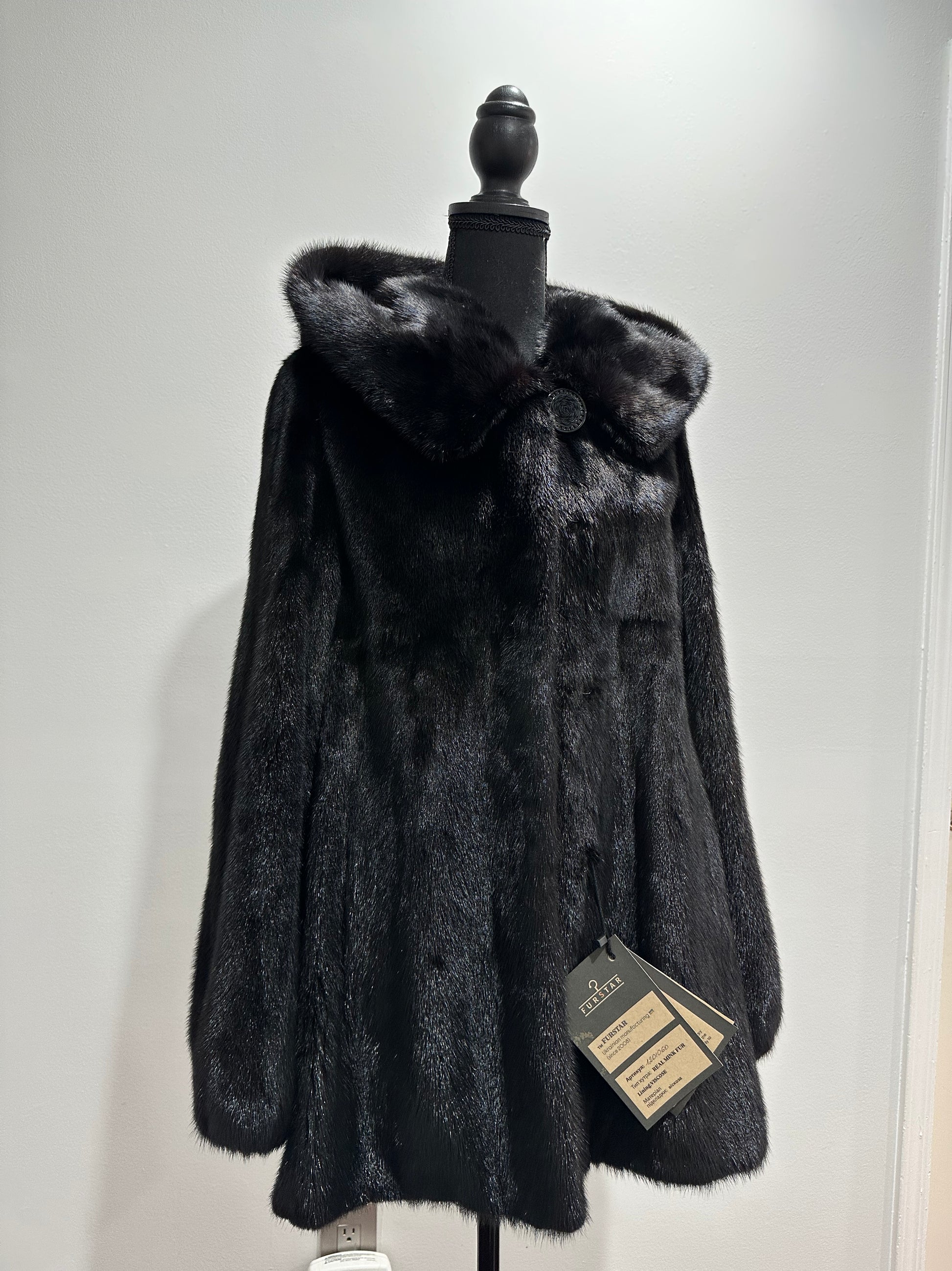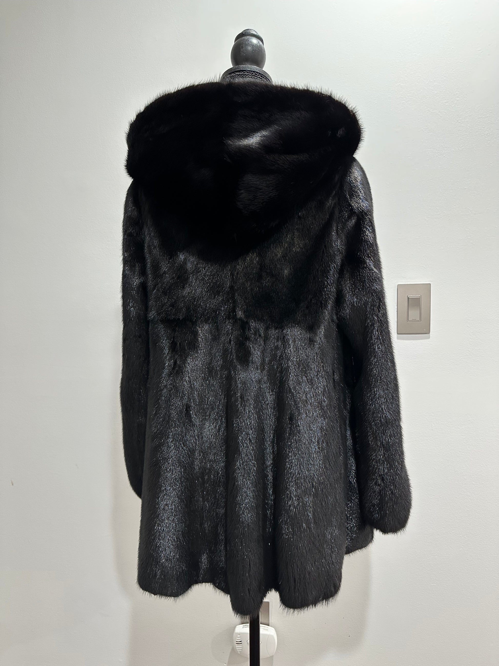 Women's mink fur coat with a hood size M. Color - deep BLACK, natural color. The sleeves are long. The fur is thick, fluffy, soft, shiny. There are 2 pockets. Fastens with hooks. Ukrainian manufacturer.