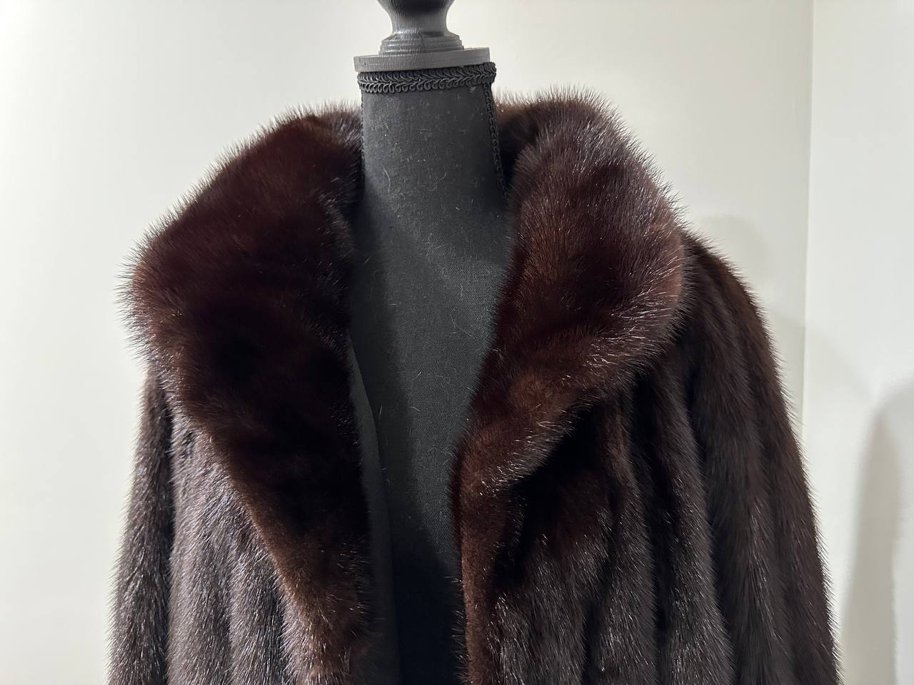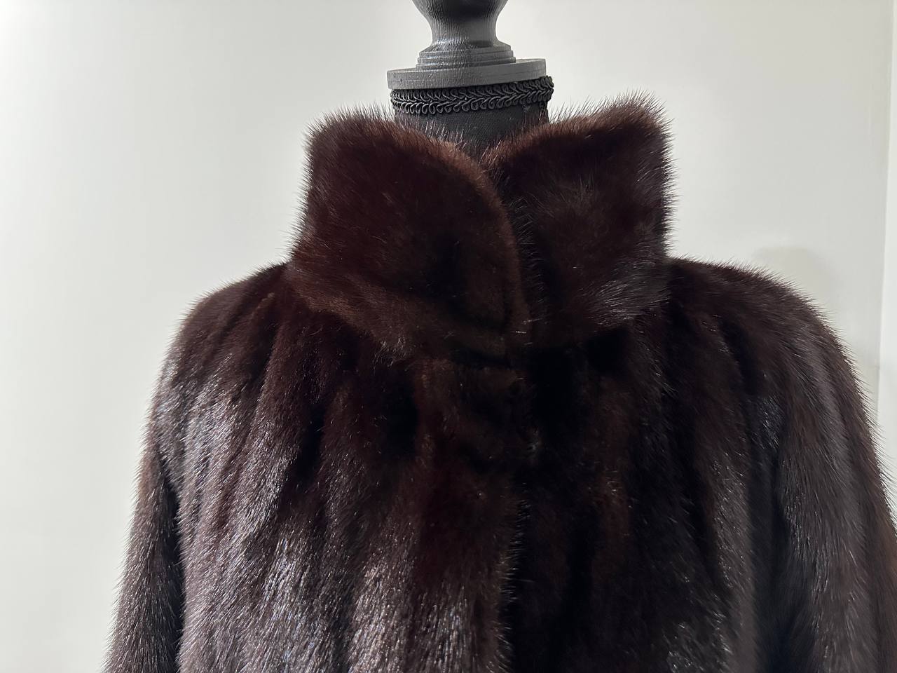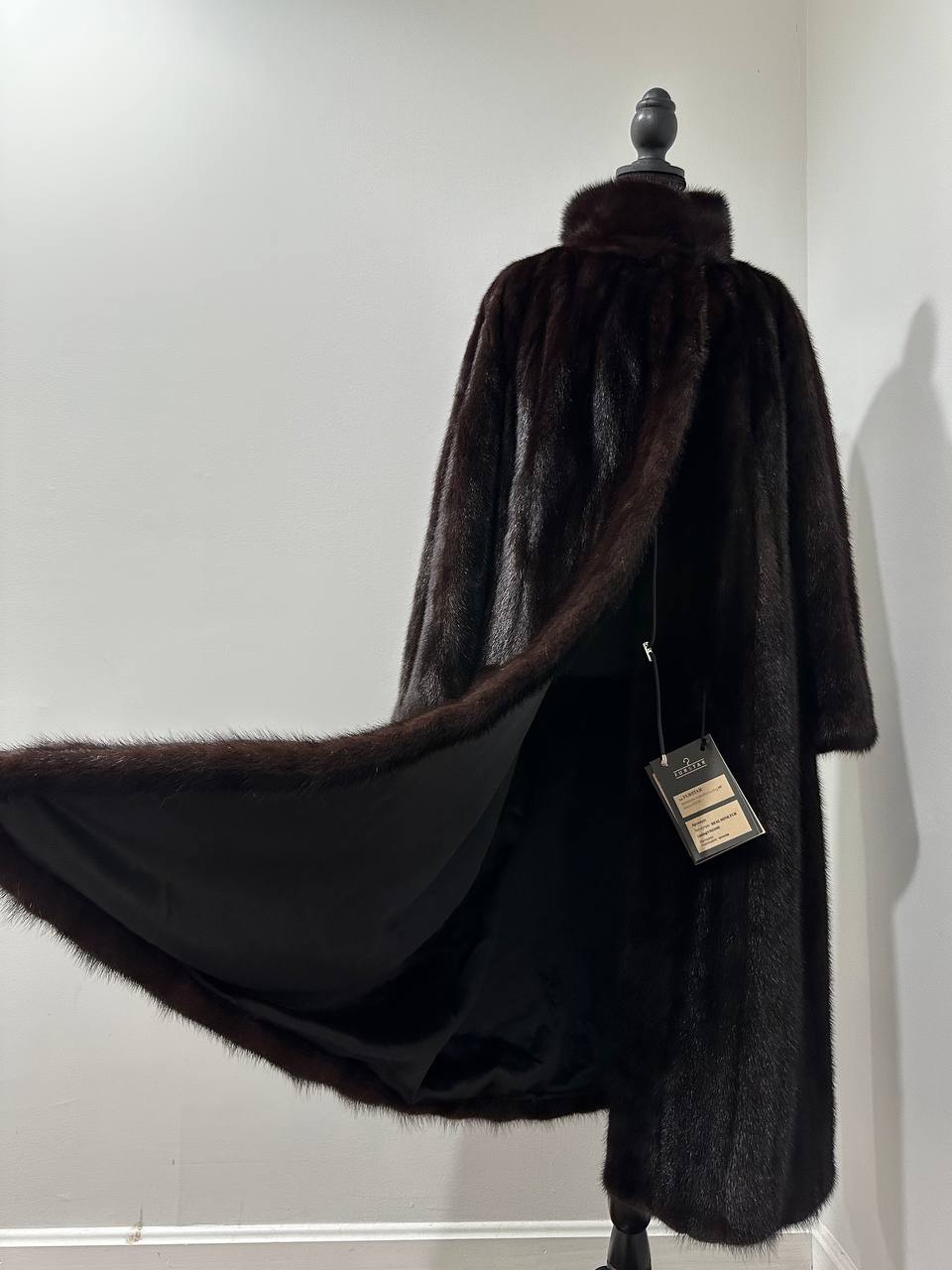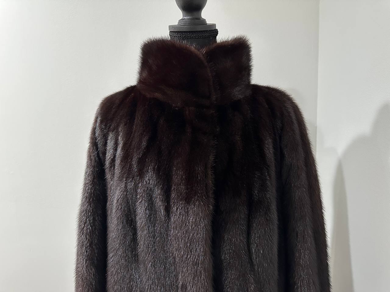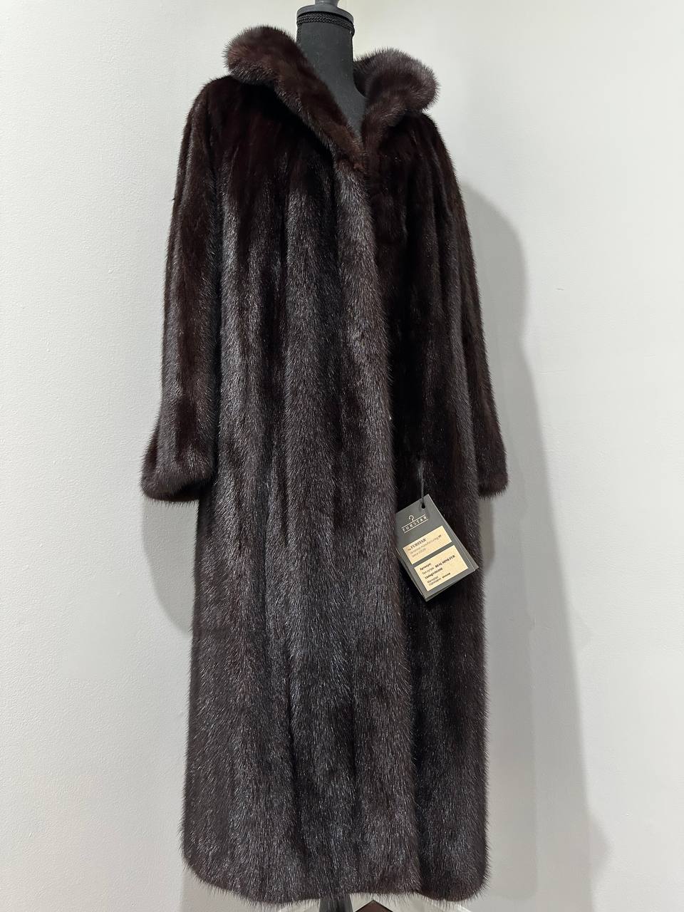 Branded women's mink coat with a stand-up collar, size 2XL. The collar can be worn as a turn-down. Mink - natural color, rich dark brown color, thick pile, fluffy soft fur, shiny. There are 2 pockets. There is a drawstring at the waist, you can fit the product. Viscose lining, hand-sewn. Fastens with hooks. Ukrainian manufacturer.