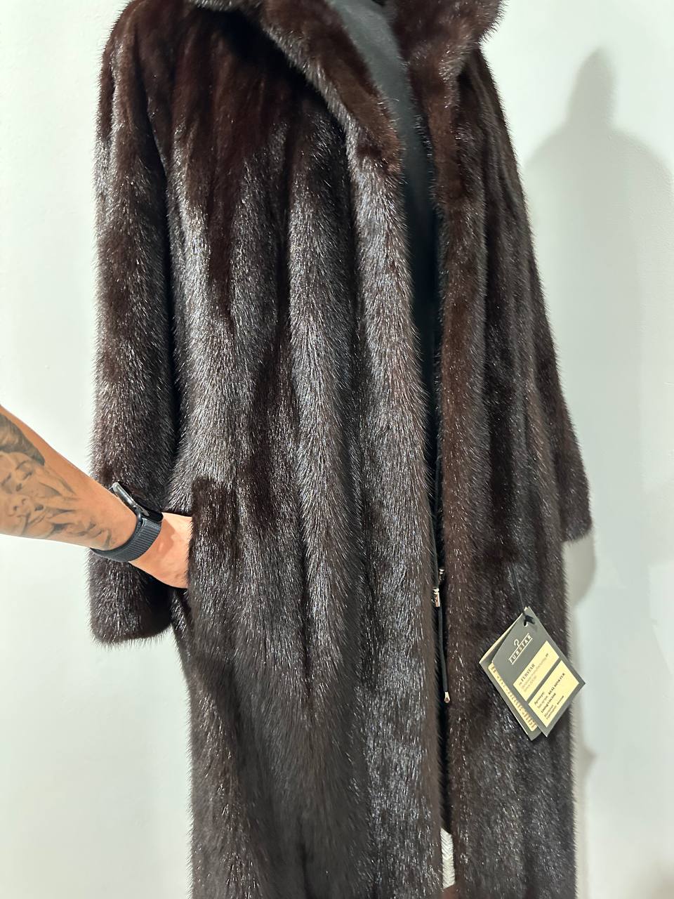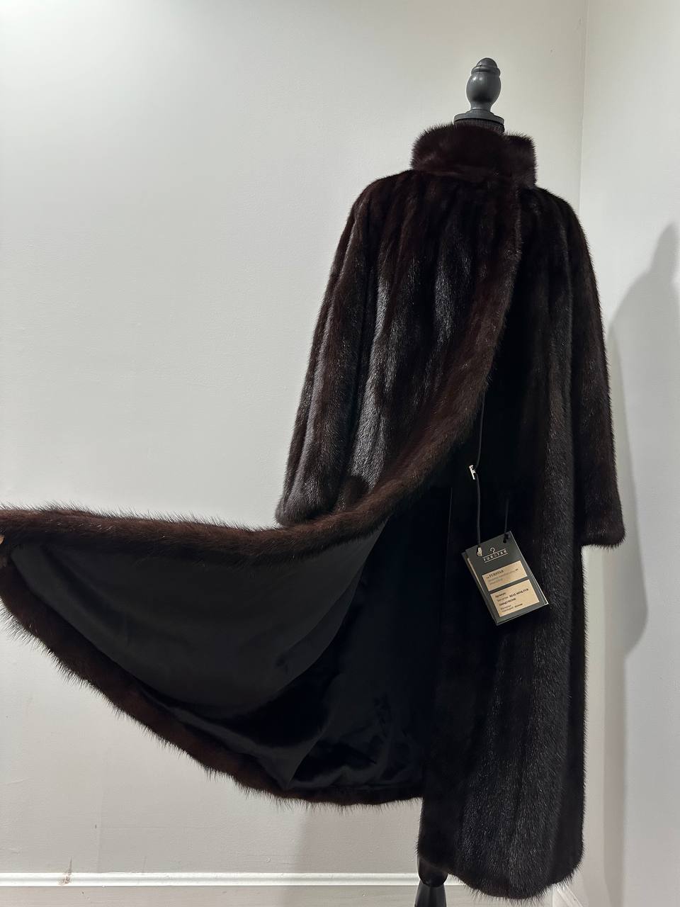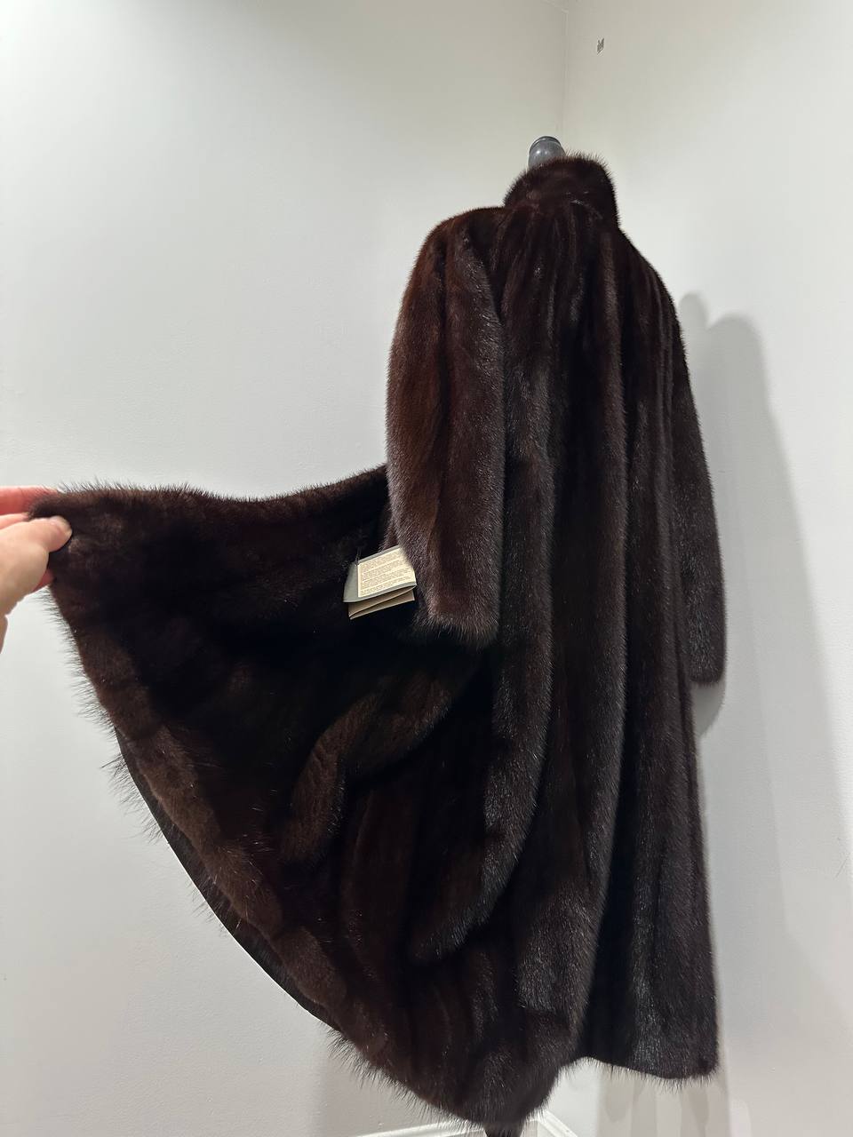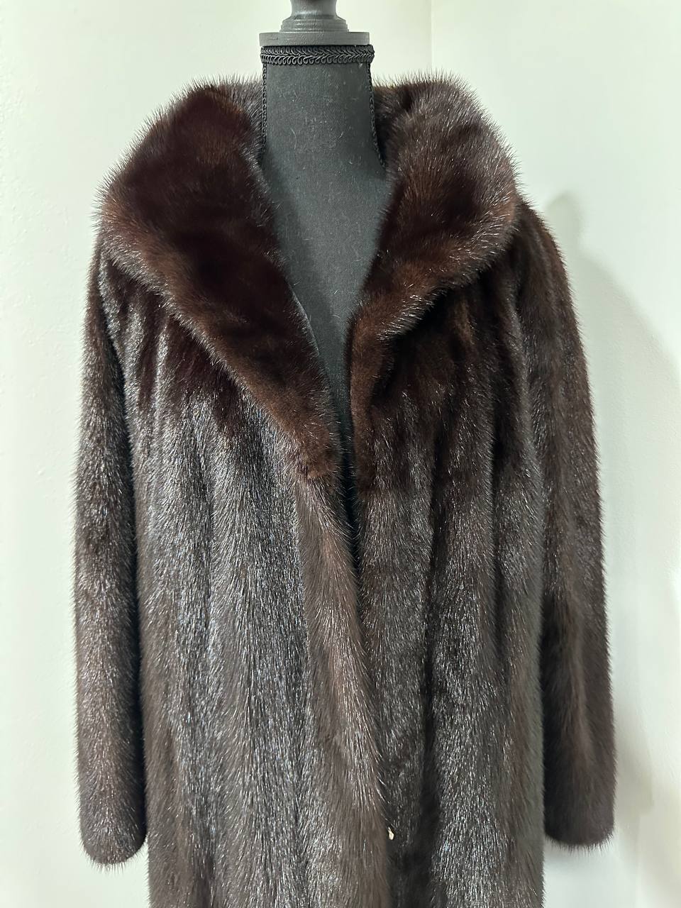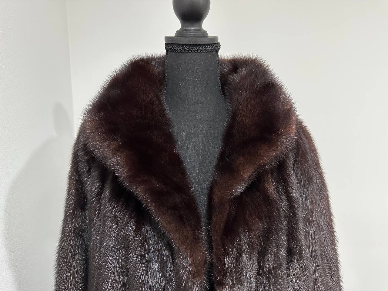 Branded women's mink coat with a stand-up collar, size 2XL. The collar can be worn as a turn-down. Mink - natural color, rich dark brown color, thick pile, fluffy soft fur, shiny. There are 2 pockets. There is a drawstring at the waist, you can fit the product. Viscose lining, hand-sewn. Fastens with hooks. Ukrainian manufacturer.