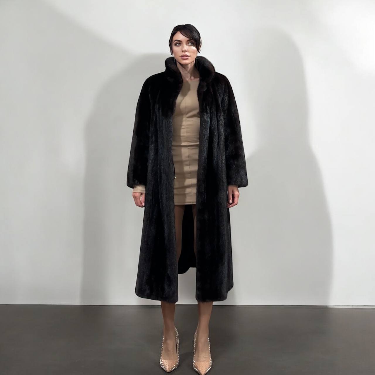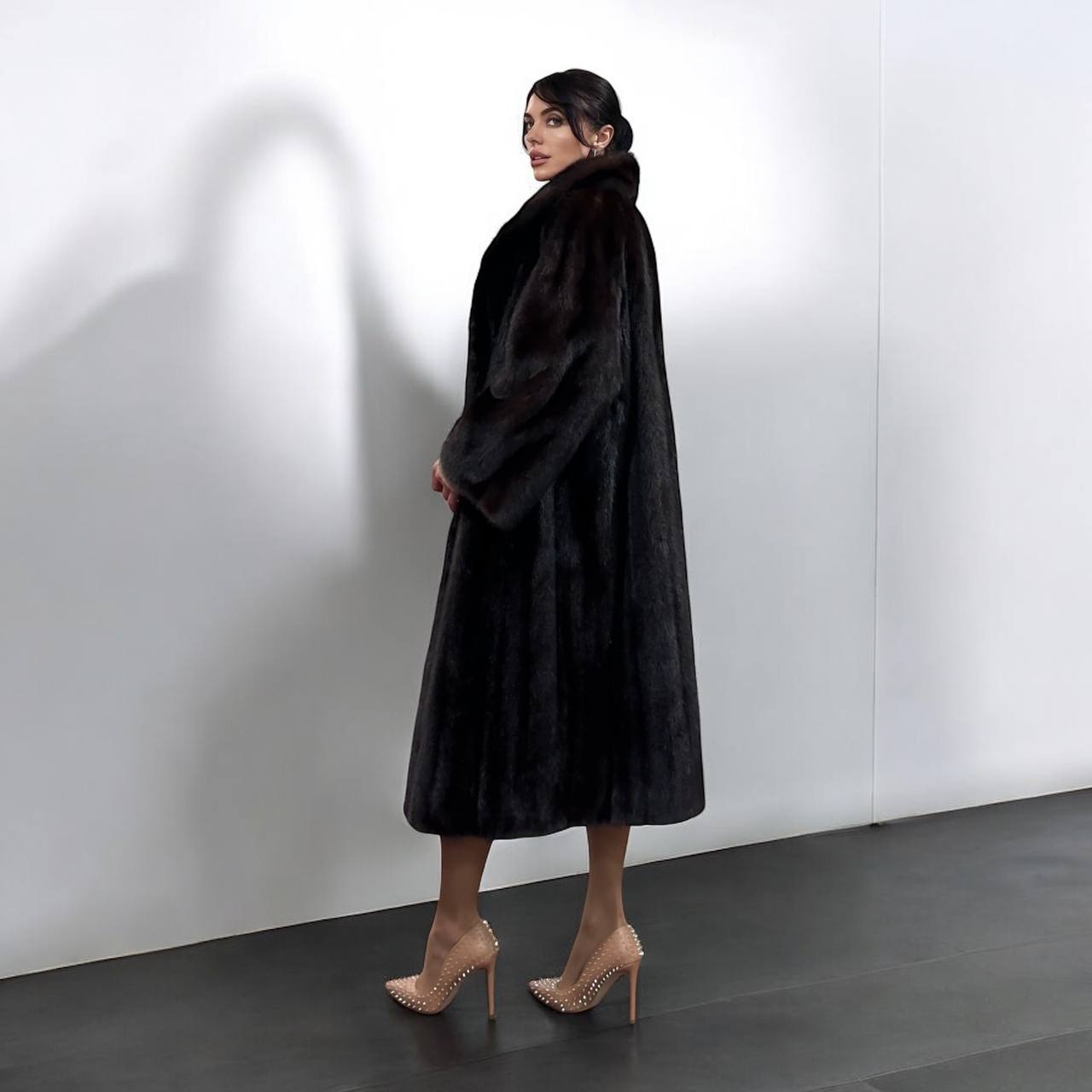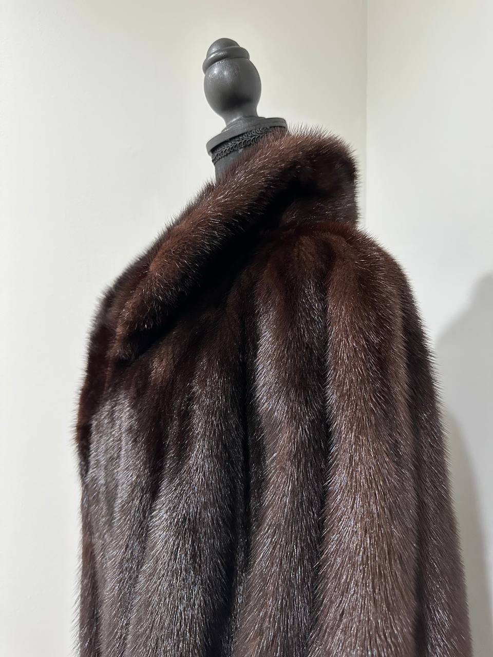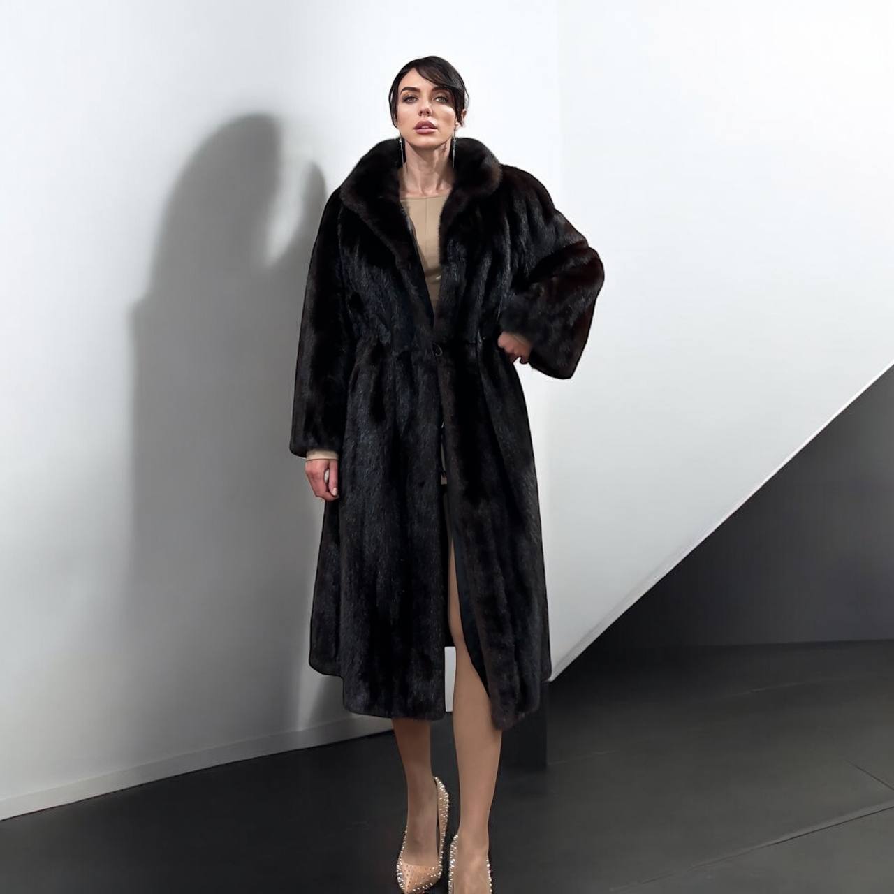 Branded women's mink coat with a stand-up collar, size 2XL. The collar can be worn as a turn-down. Mink - natural color, rich dark brown color, thick pile, fluffy soft fur, shiny. There are 2 pockets. There is a drawstring at the waist, you can fit the product. Viscose lining, hand-sewn. Fastens with hooks. Ukrainian manufacturer.