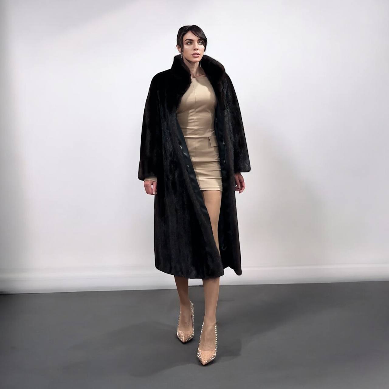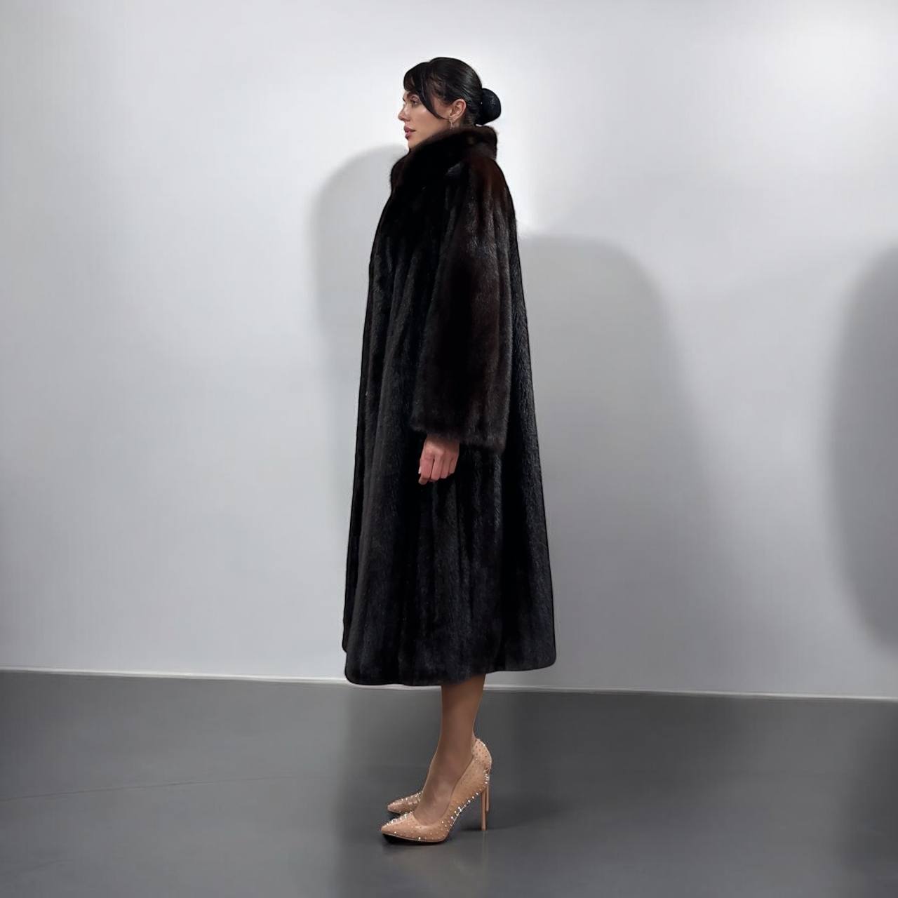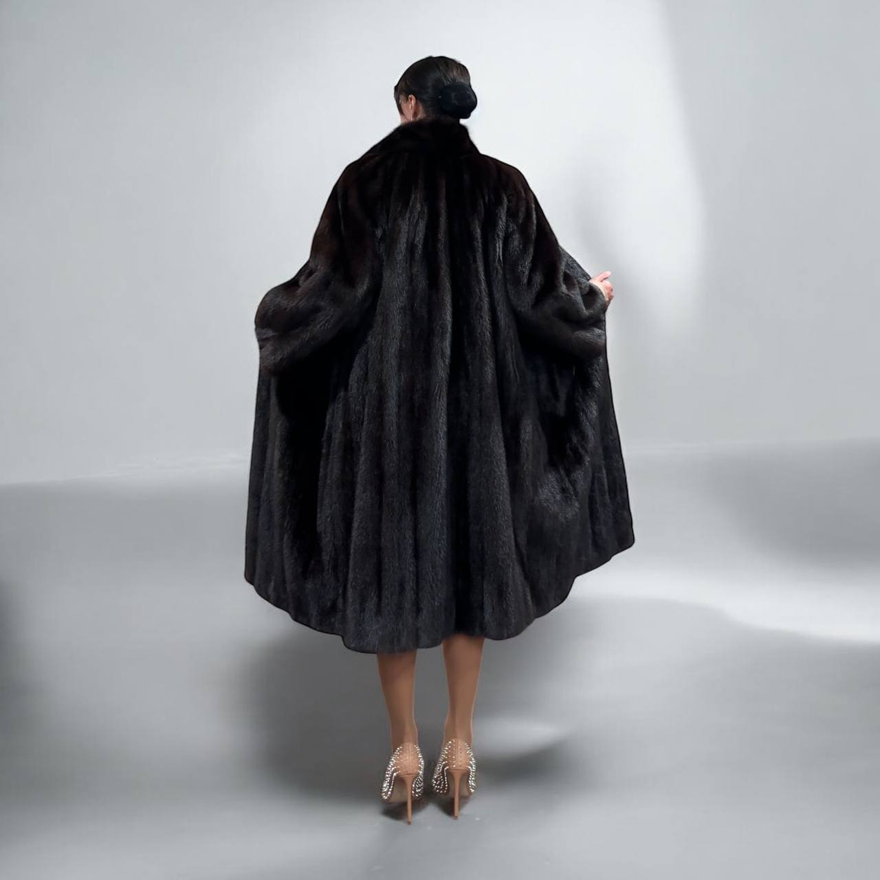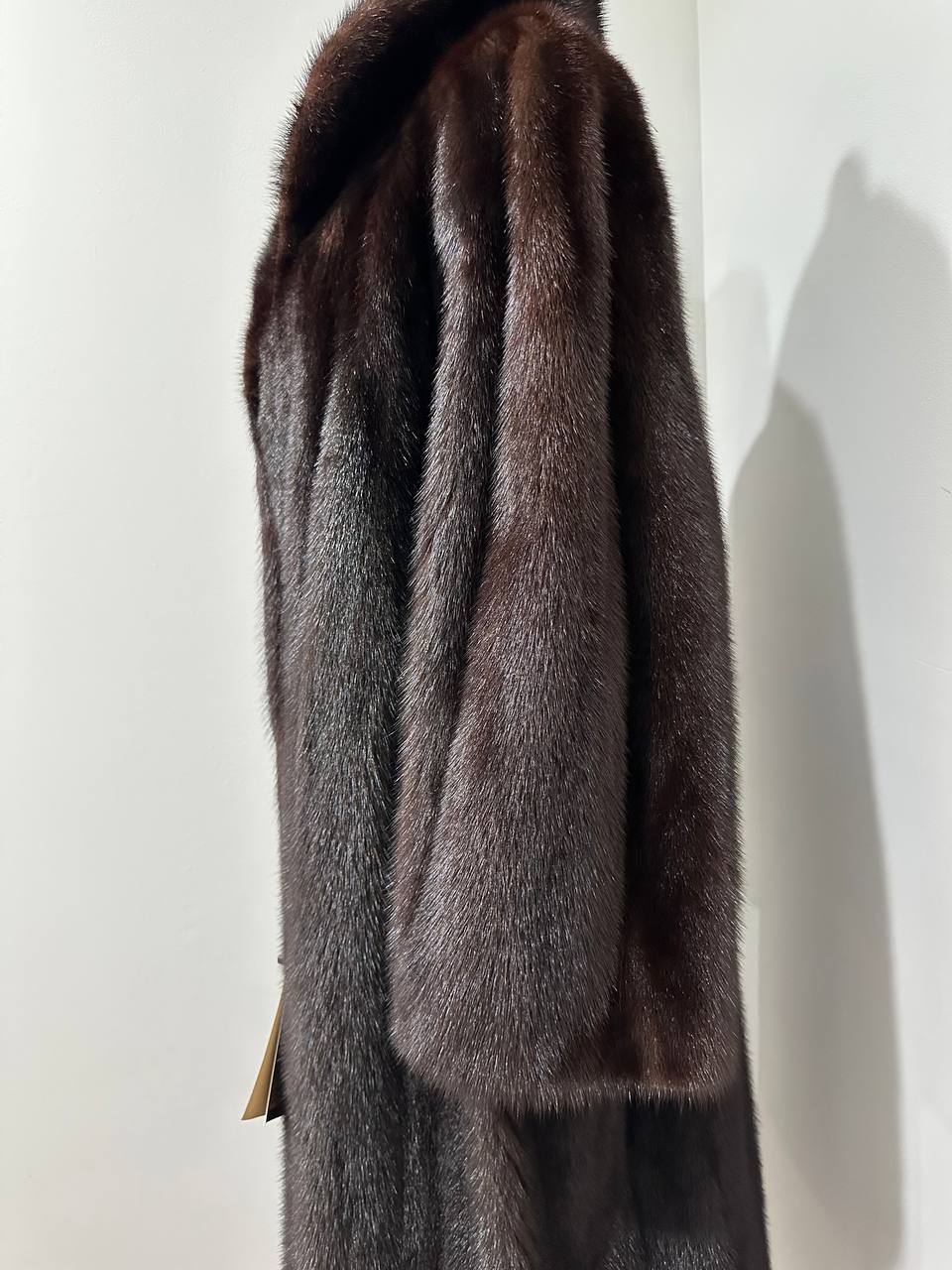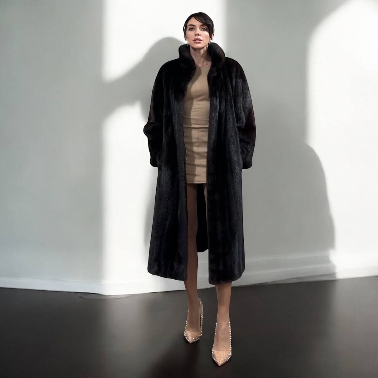 Branded women's mink coat with a stand-up collar, size 2XL. The collar can be worn as a turn-down. Mink - natural color, rich dark brown color, thick pile, fluffy soft fur, shiny. There are 2 pockets. There is a drawstring at the waist, you can fit the product. Viscose lining, hand-sewn. Fastens with hooks. Ukrainian manufacturer.
