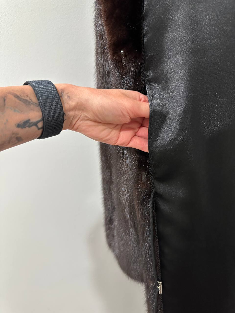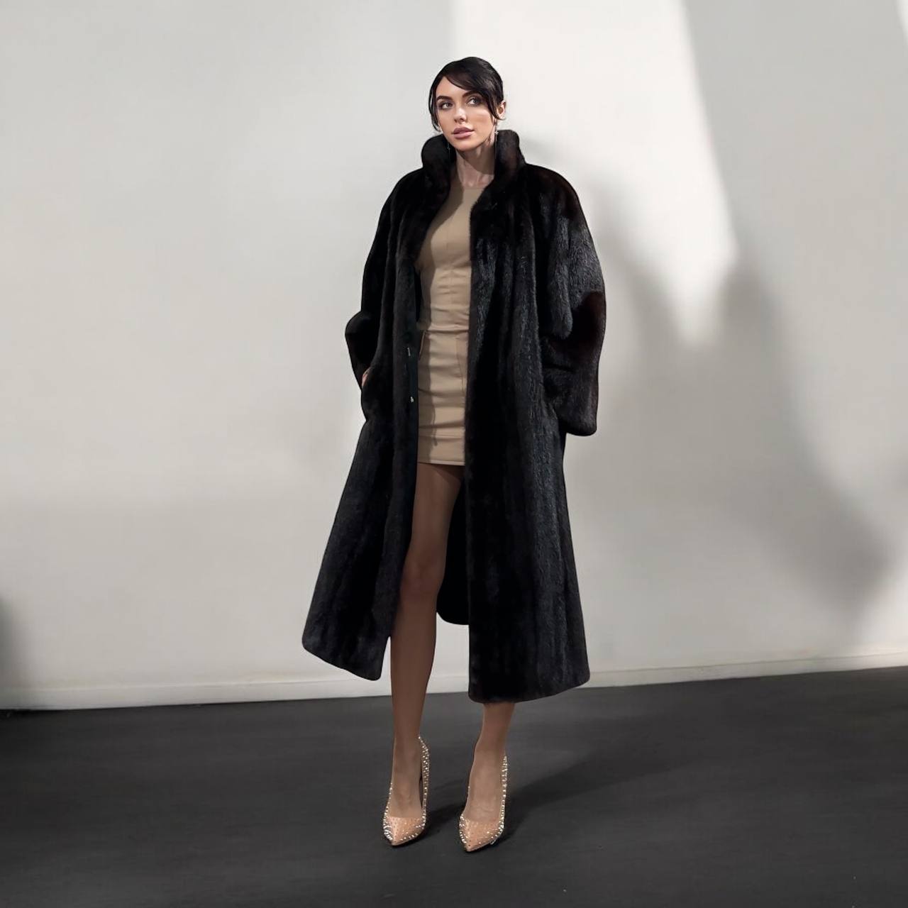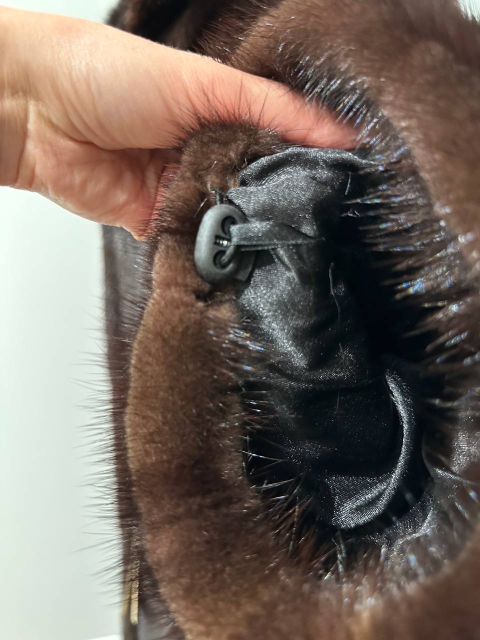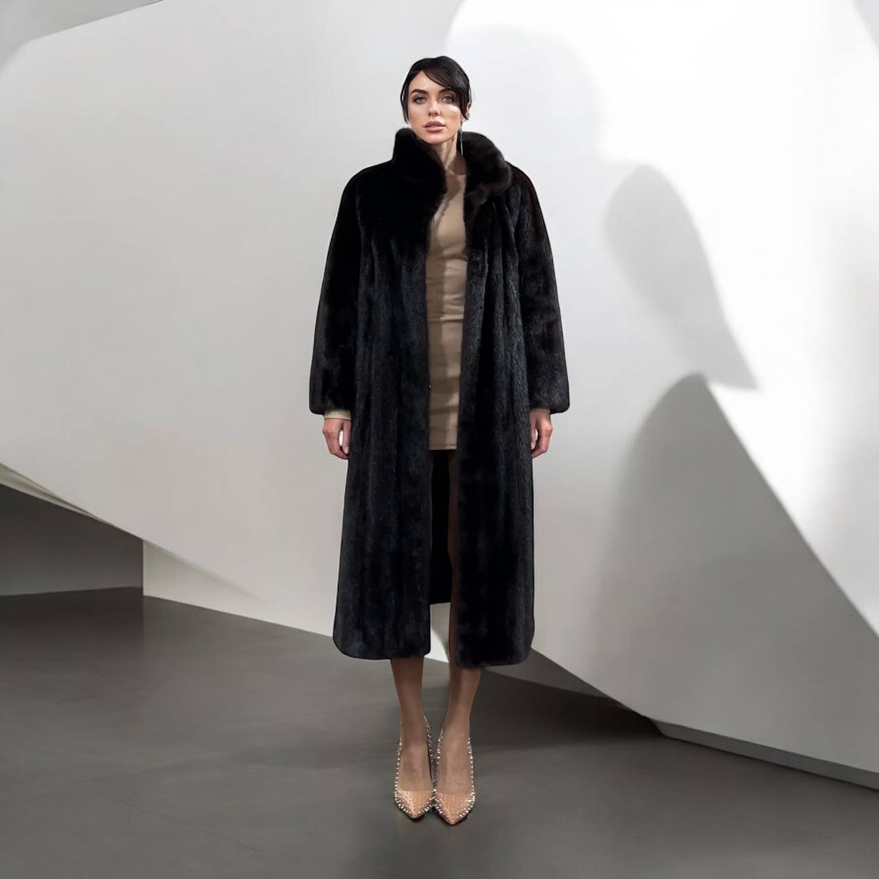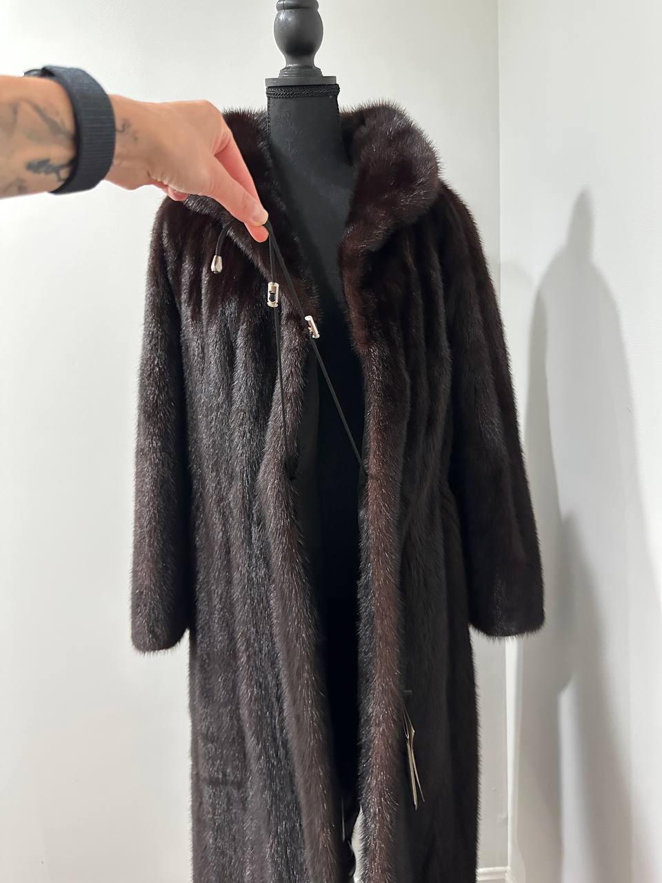 Branded women's mink coat with a stand-up collar, size 2XL. The collar can be worn as a turn-down. Mink - natural color, rich dark brown color, thick pile, fluffy soft fur, shiny. There are 2 pockets. There is a drawstring at the waist, you can fit the product. Viscose lining, hand-sewn. Fastens with hooks. Ukrainian manufacturer.