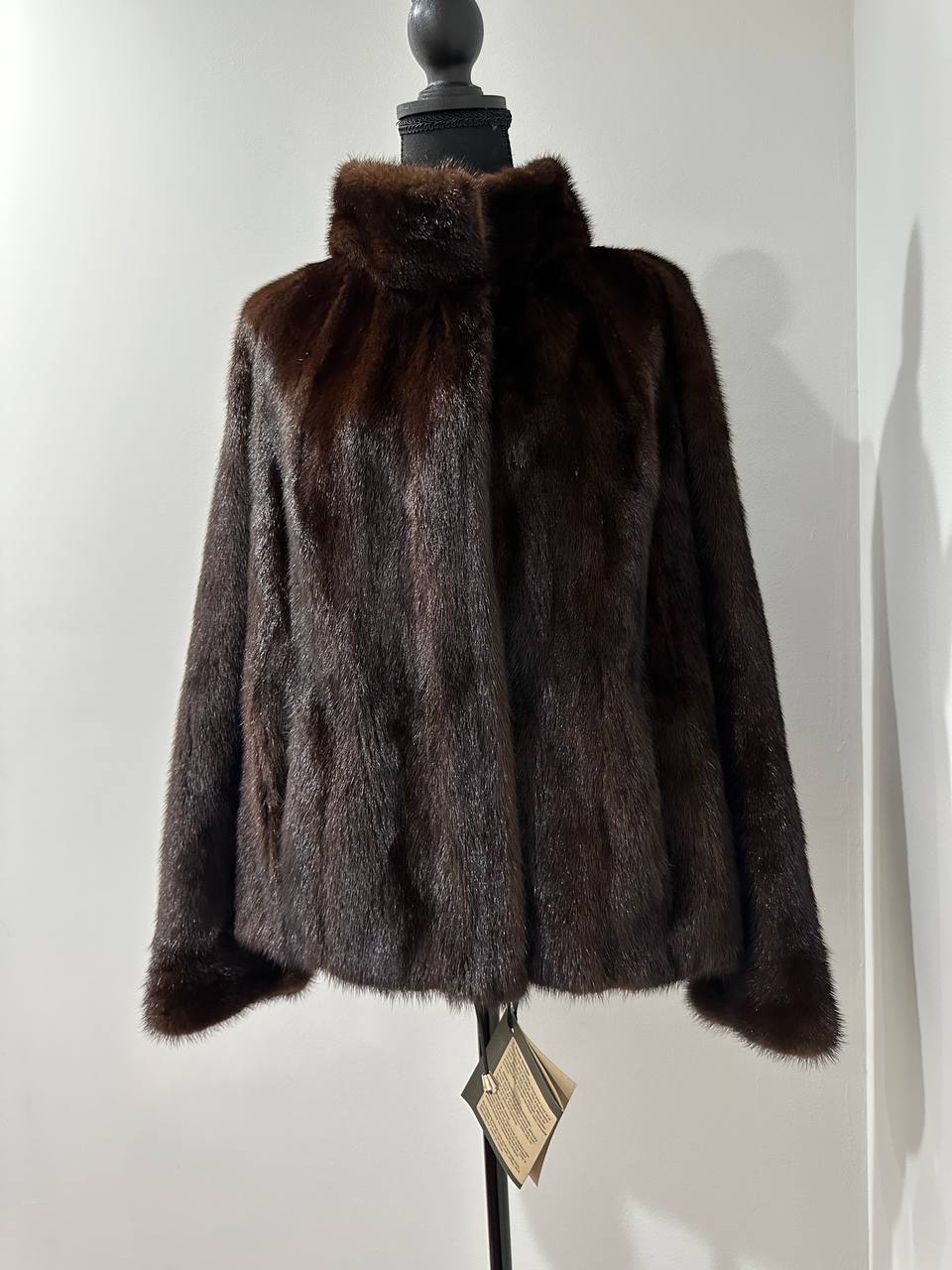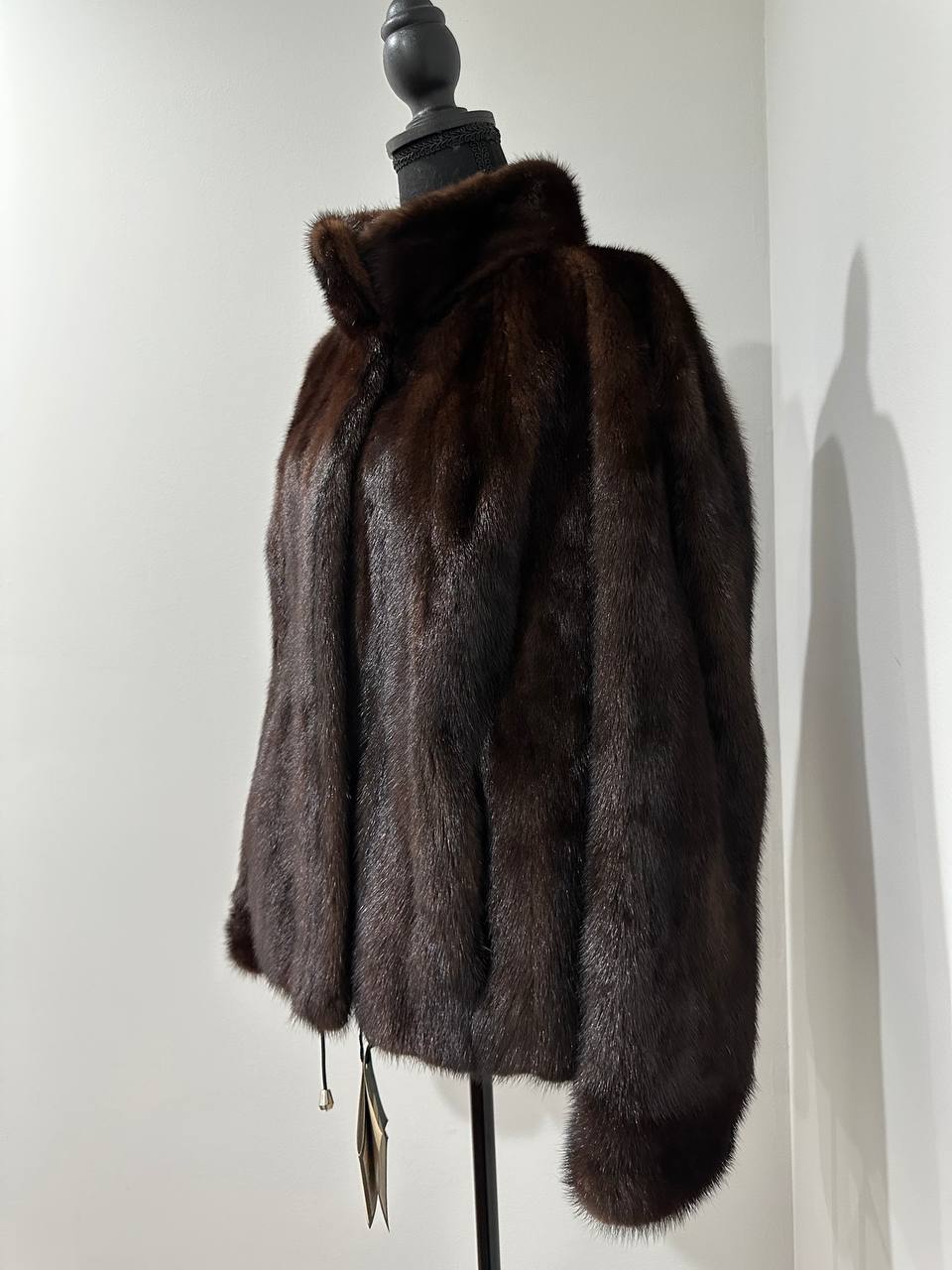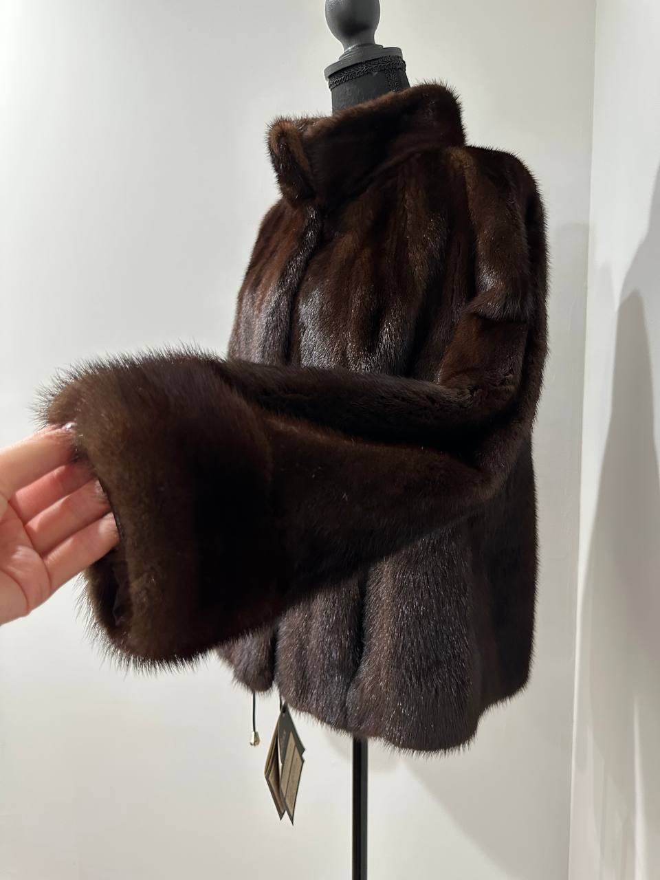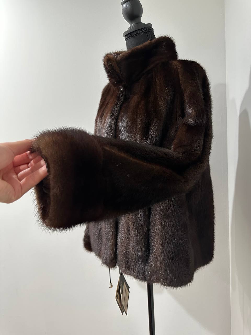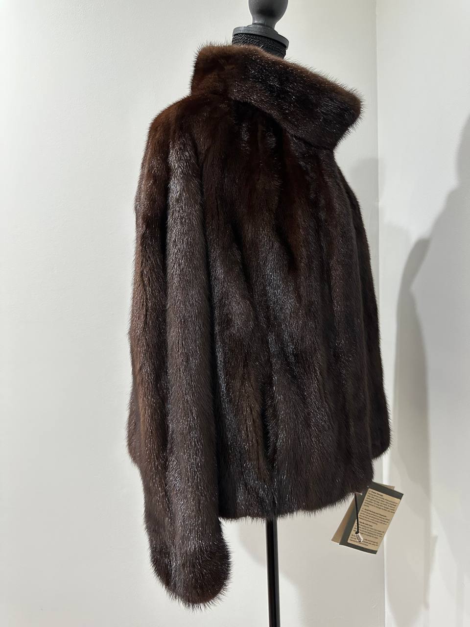 Women's stylish short fur coat 2XL size made of natural dark brown mink, natural fur color. The model is a bomber jacket, an internal drawstring is sewn on the bottom of the product. Stand collar. There are 2 pockets. The fur is thick, soft, shiny, silky. Fastens with hooks. Viscose lining, sewn on hem - handmade. Producer - Ukrainian. A variety of mink - Canadian.