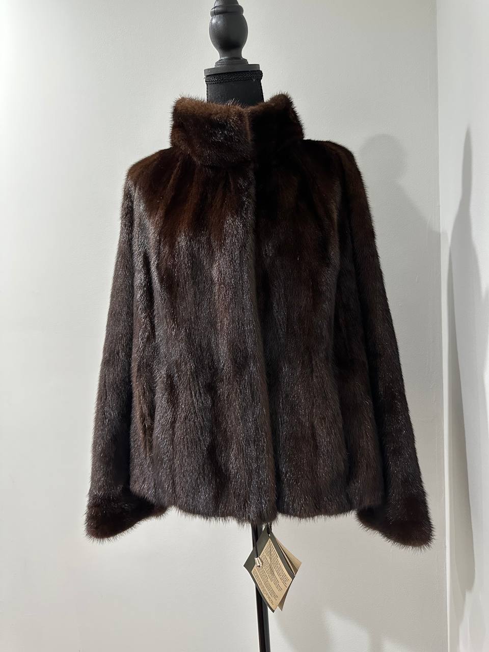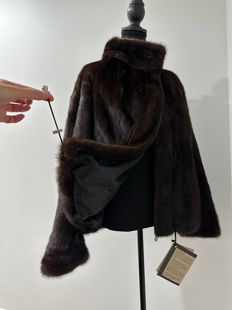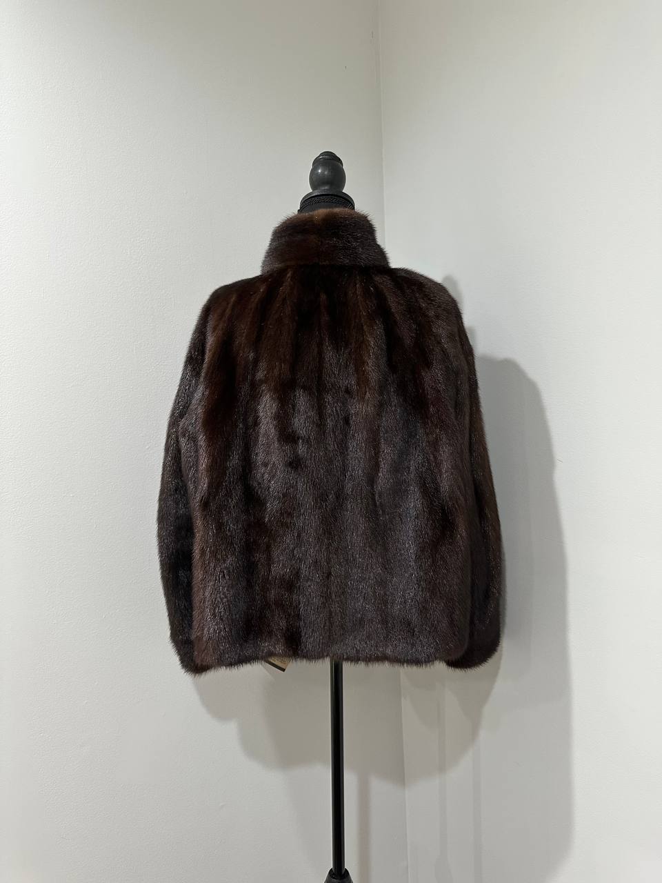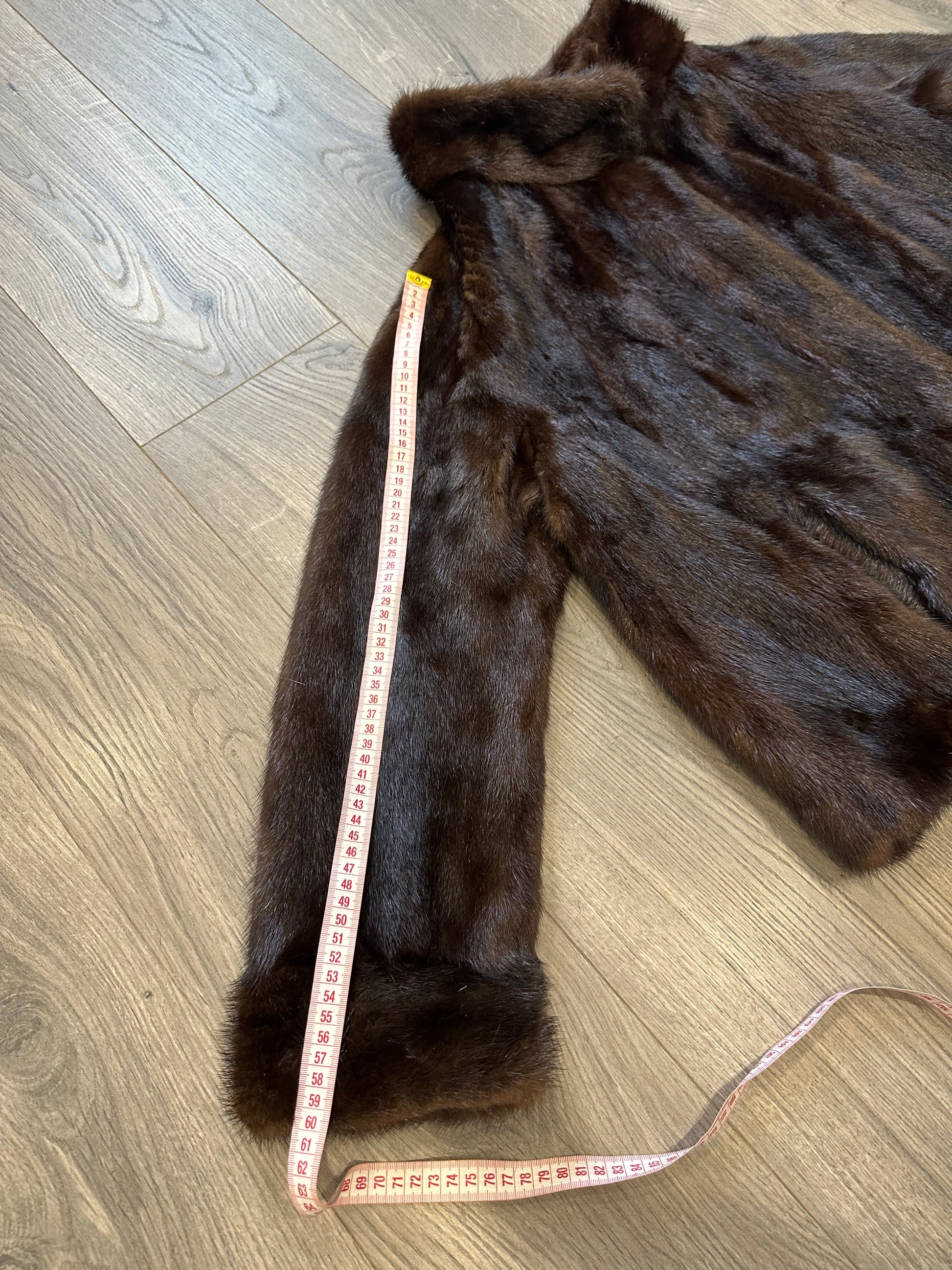 Women's stylish short fur coat 2XL size made of natural dark brown mink, natural fur color. The model is a bomber jacket, an internal drawstring is sewn on the bottom of the product. Stand collar. There are 2 pockets. The fur is thick, soft, shiny, silky. Fastens with hooks. Viscose lining, sewn on hem - handmade. Producer - Ukrainian. A variety of mink - Canadian.