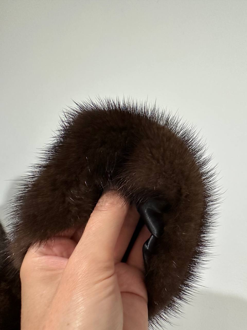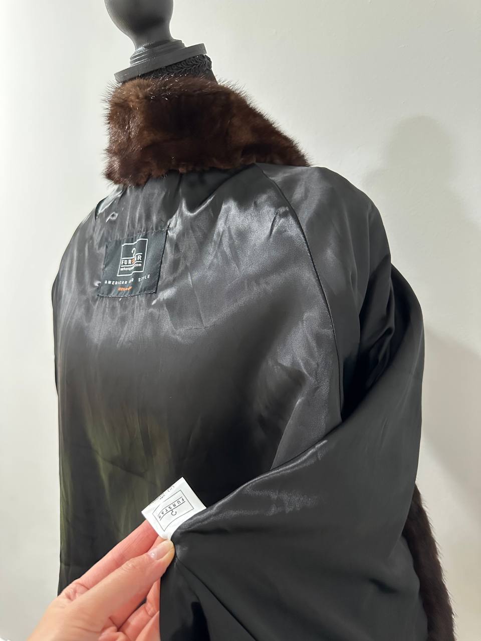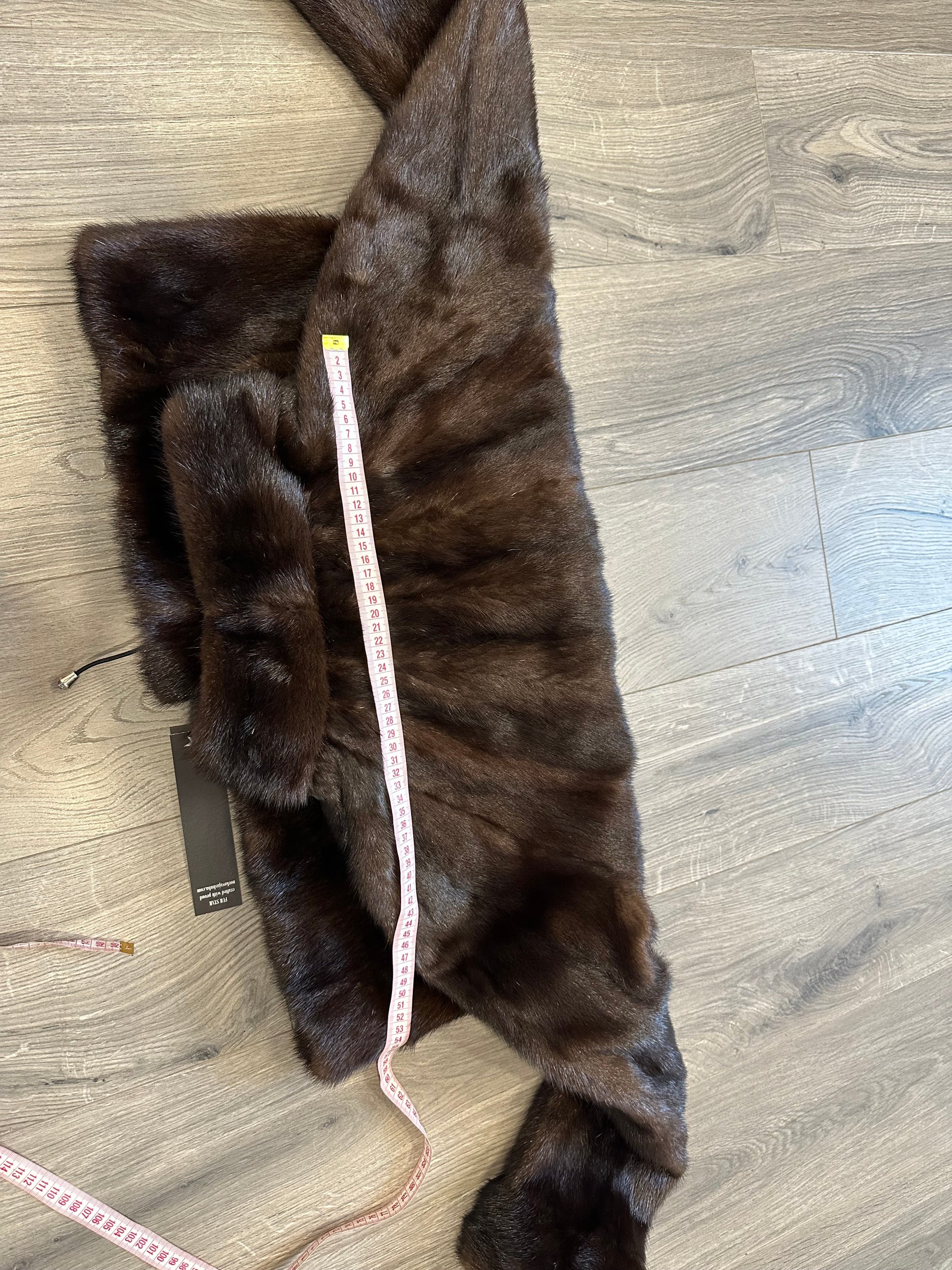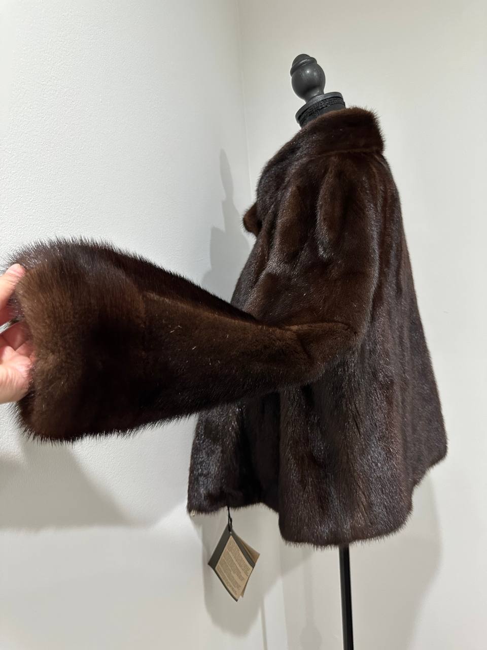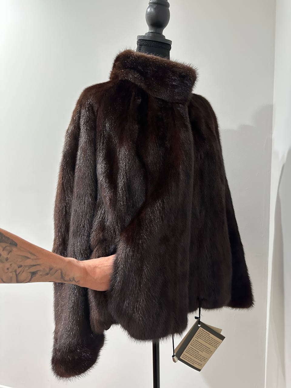 Women's stylish short fur coat 2XL size made of natural dark brown mink, natural fur color. The model is a bomber jacket, an internal drawstring is sewn on the bottom of the product. Stand collar. There are 2 pockets. The fur is thick, soft, shiny, silky. Fastens with hooks. Viscose lining, sewn on hem - handmade. Producer - Ukrainian. A variety of mink - Canadian.