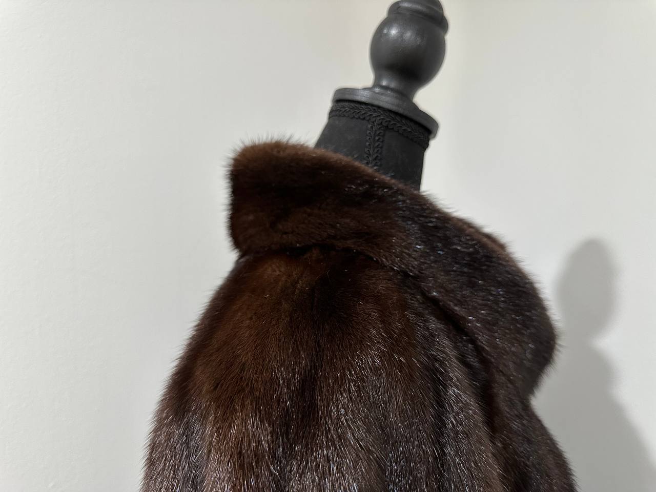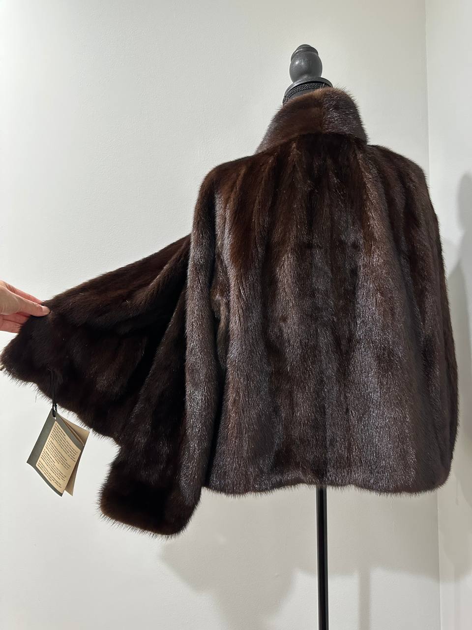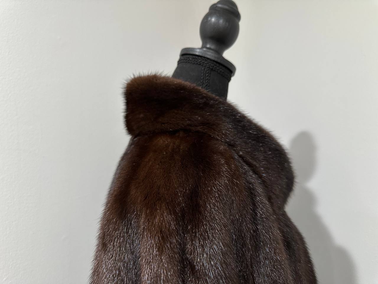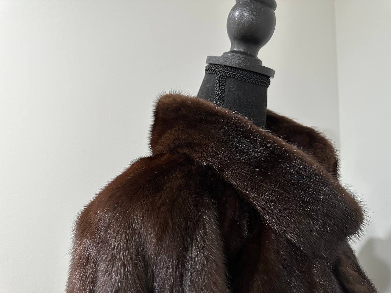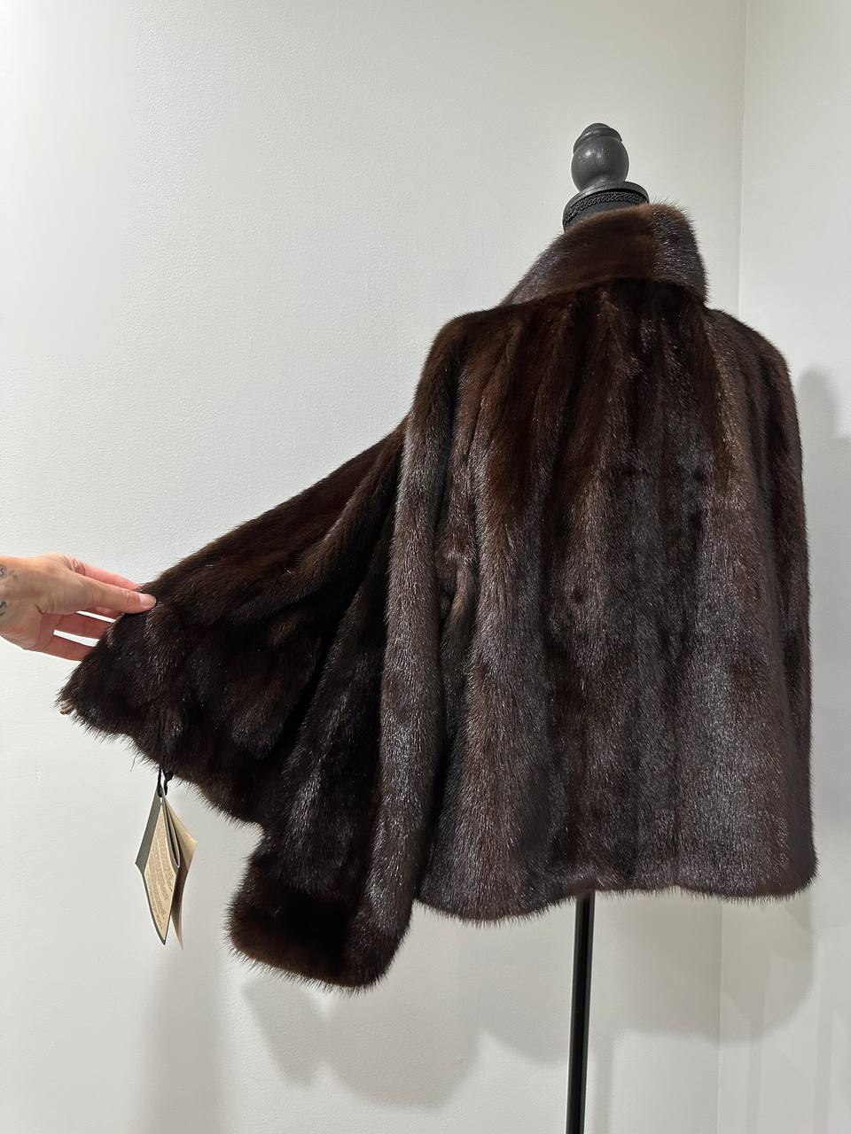 Women's stylish short fur coat 2XL size made of natural dark brown mink, natural fur color. The model is a bomber jacket, an internal drawstring is sewn on the bottom of the product. Stand collar. There are 2 pockets. The fur is thick, soft, shiny, silky. Fastens with hooks. Viscose lining, sewn on hem - handmade. Producer - Ukrainian. A variety of mink - Canadian.