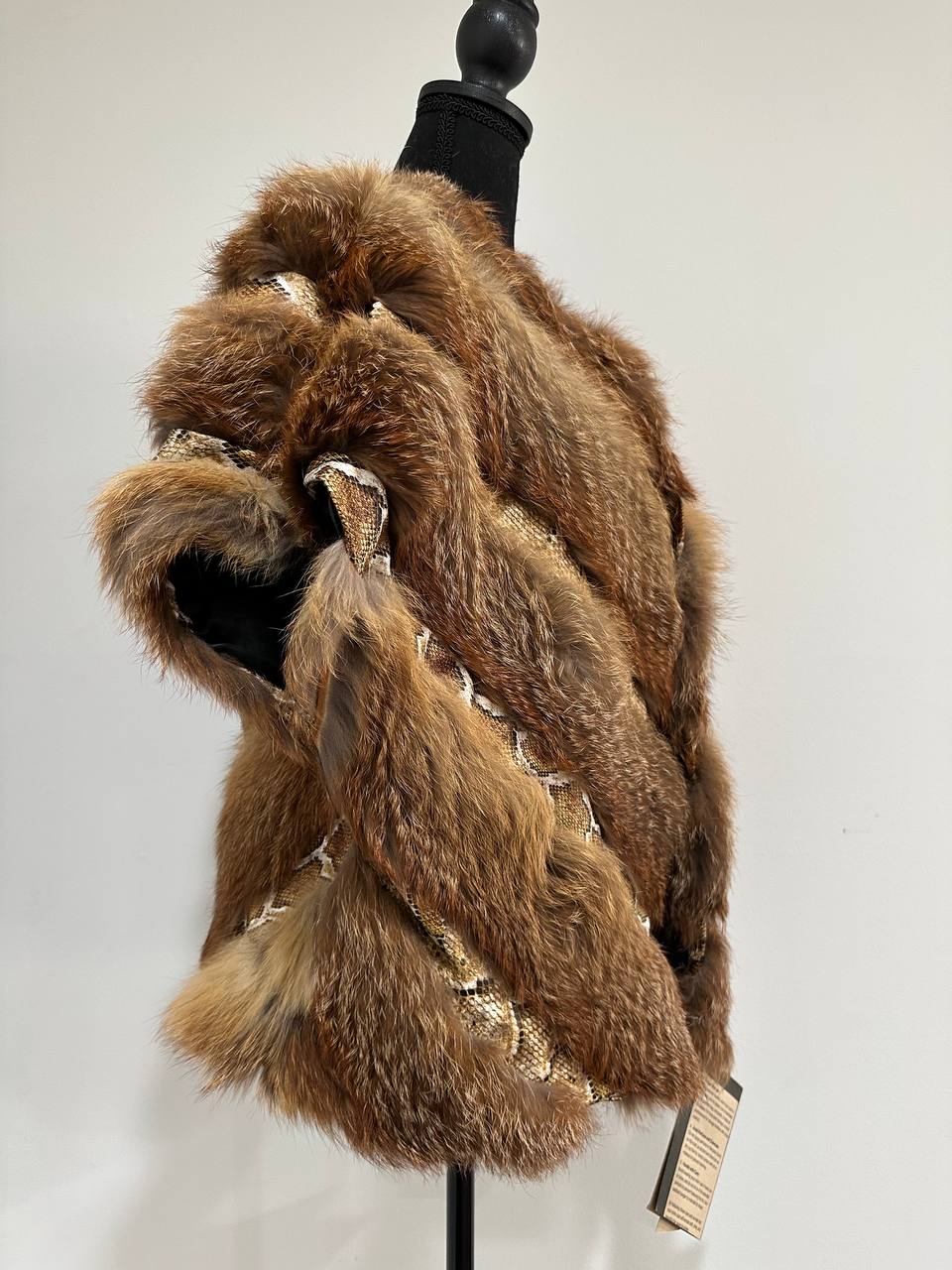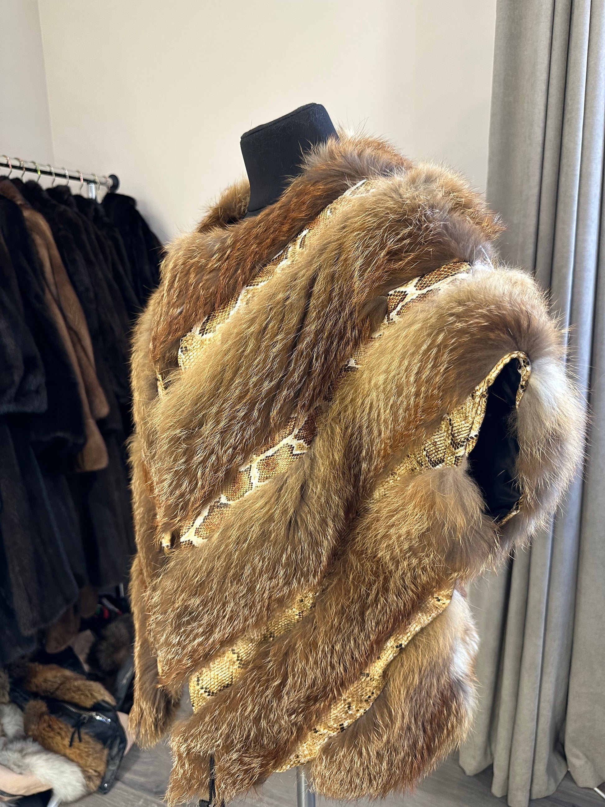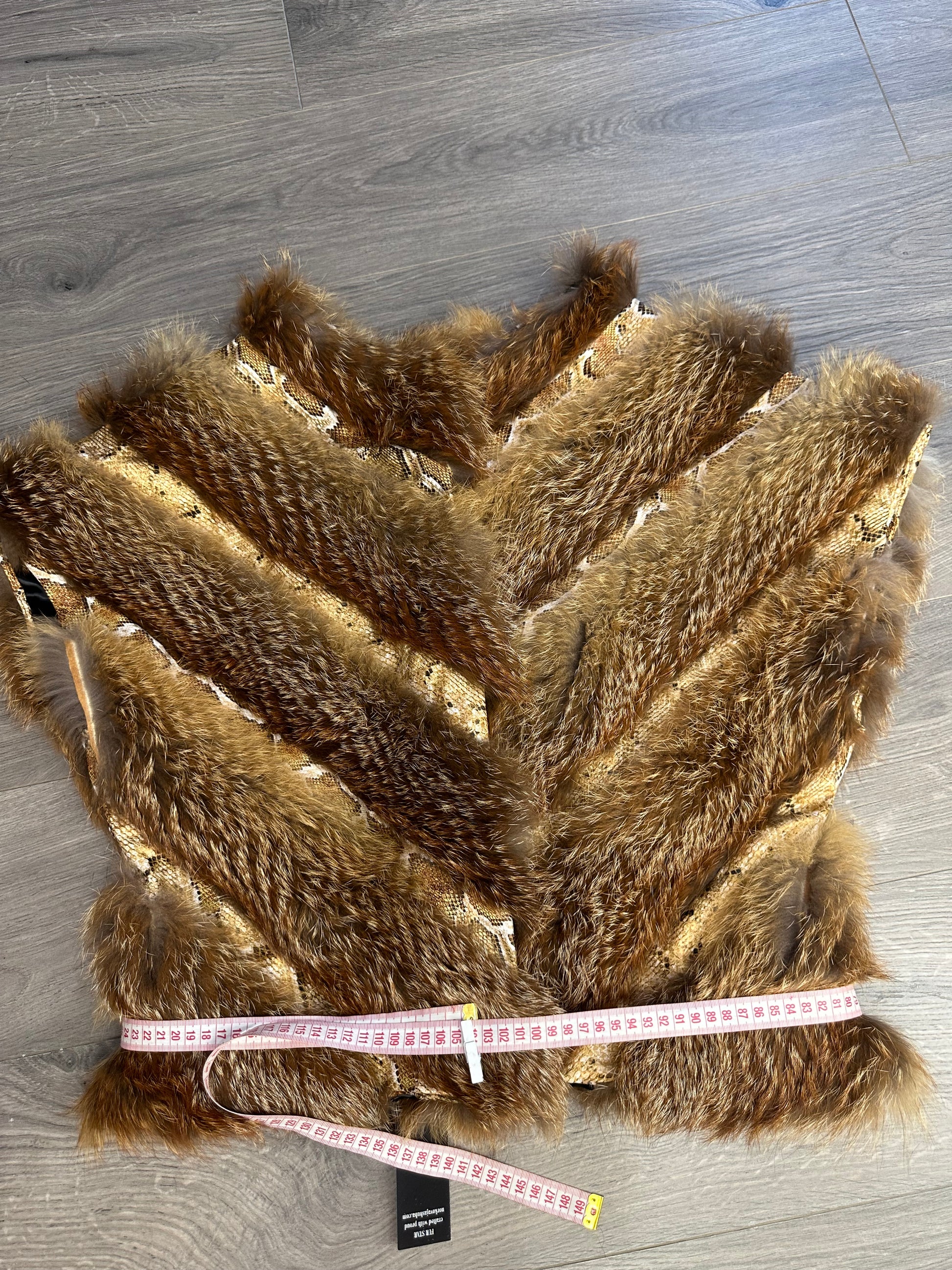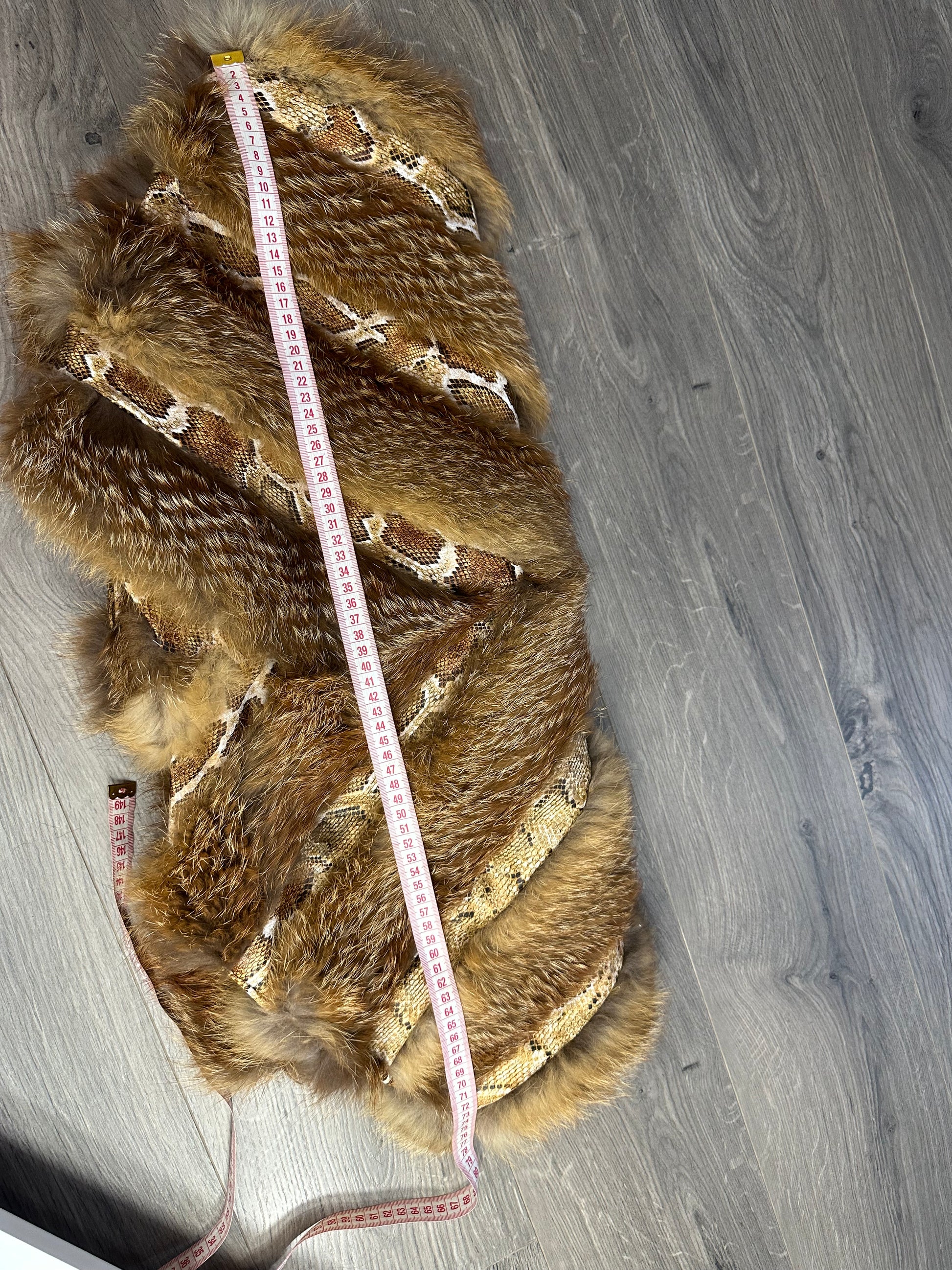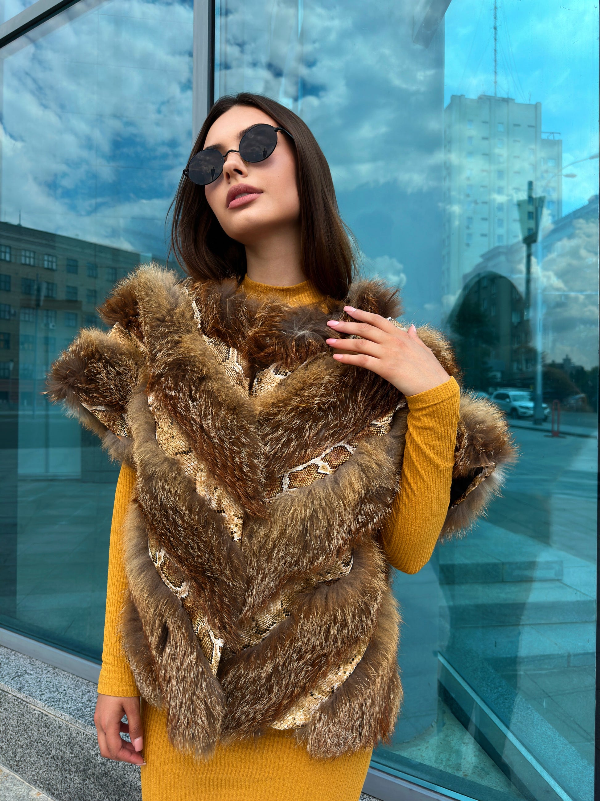 Women's vest made of natural fur of a polar fluffy fox and skin in "python" coloring Size M . An exclusive vest in which you will be irresistible and unique. Fur - fluffy, thick, warm, natural color. Model - the fur is laid with diagonal stripes, the armhole is wide, comfortable. no collar or pockets. Fastens with hooks. Viscose lining, hand-sewn. Ukrainian manufacturer.