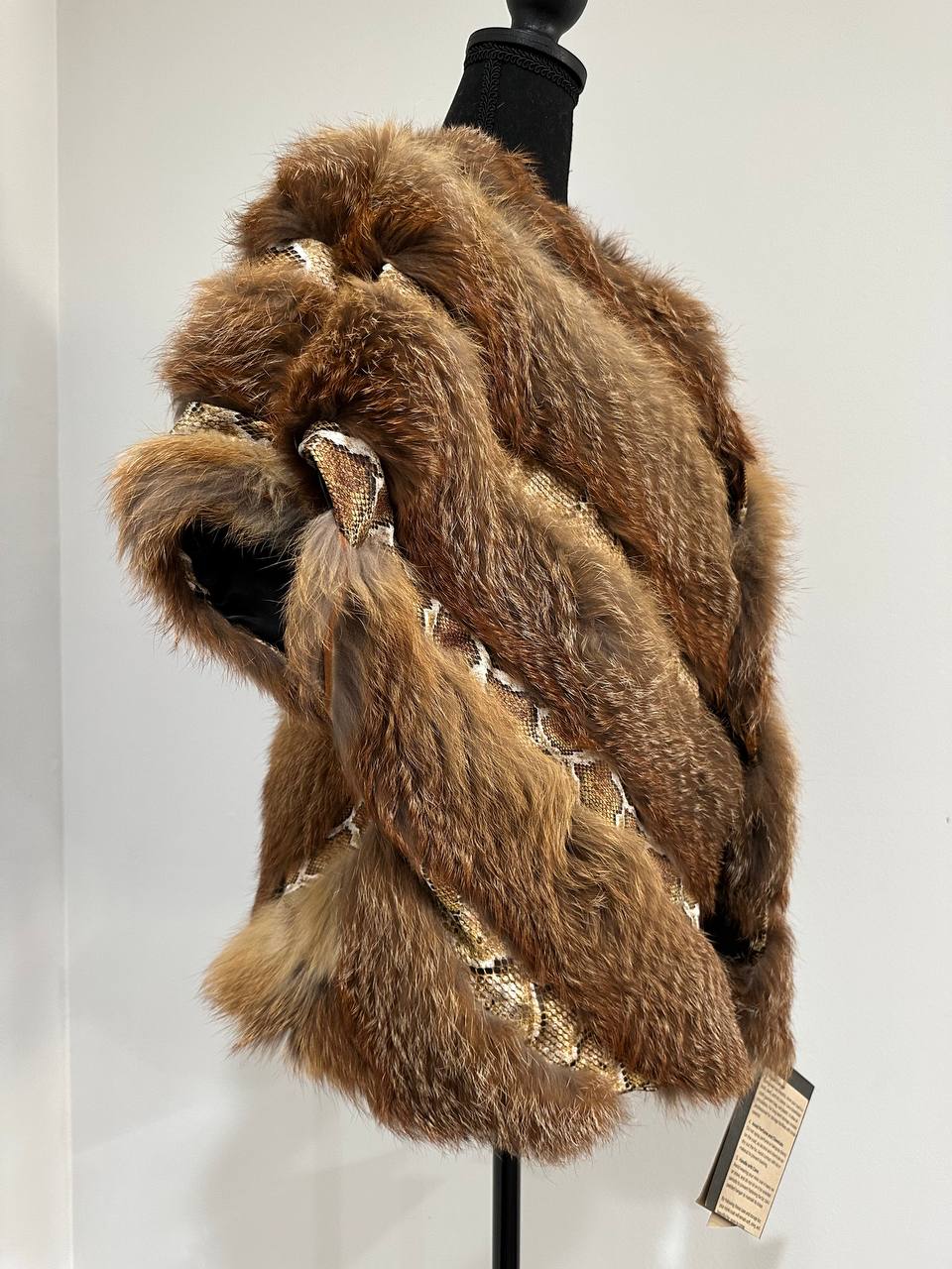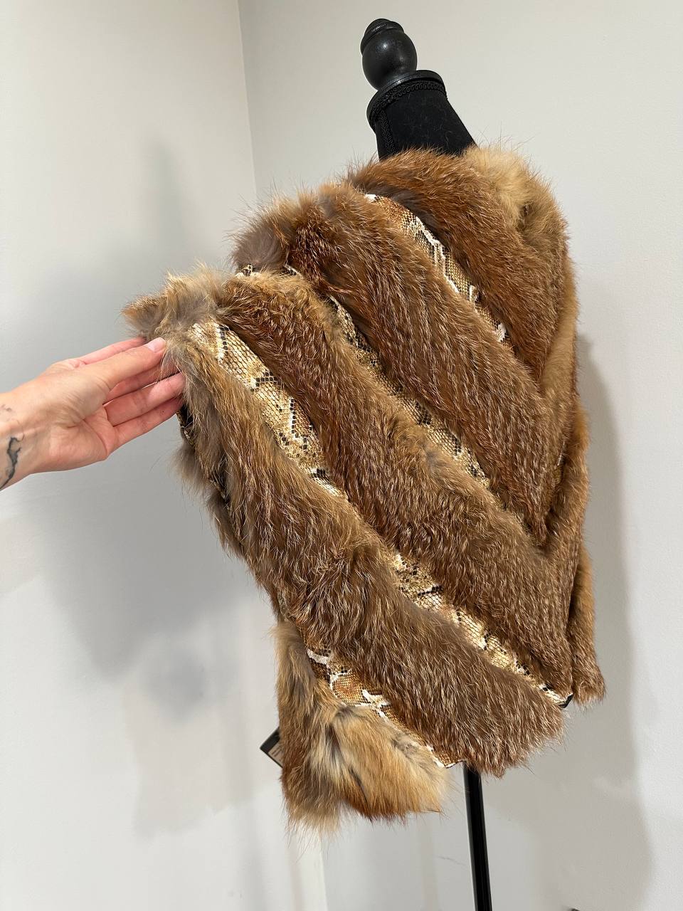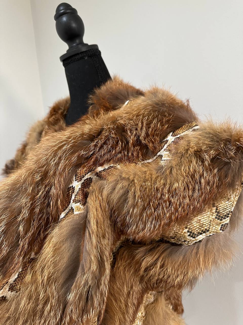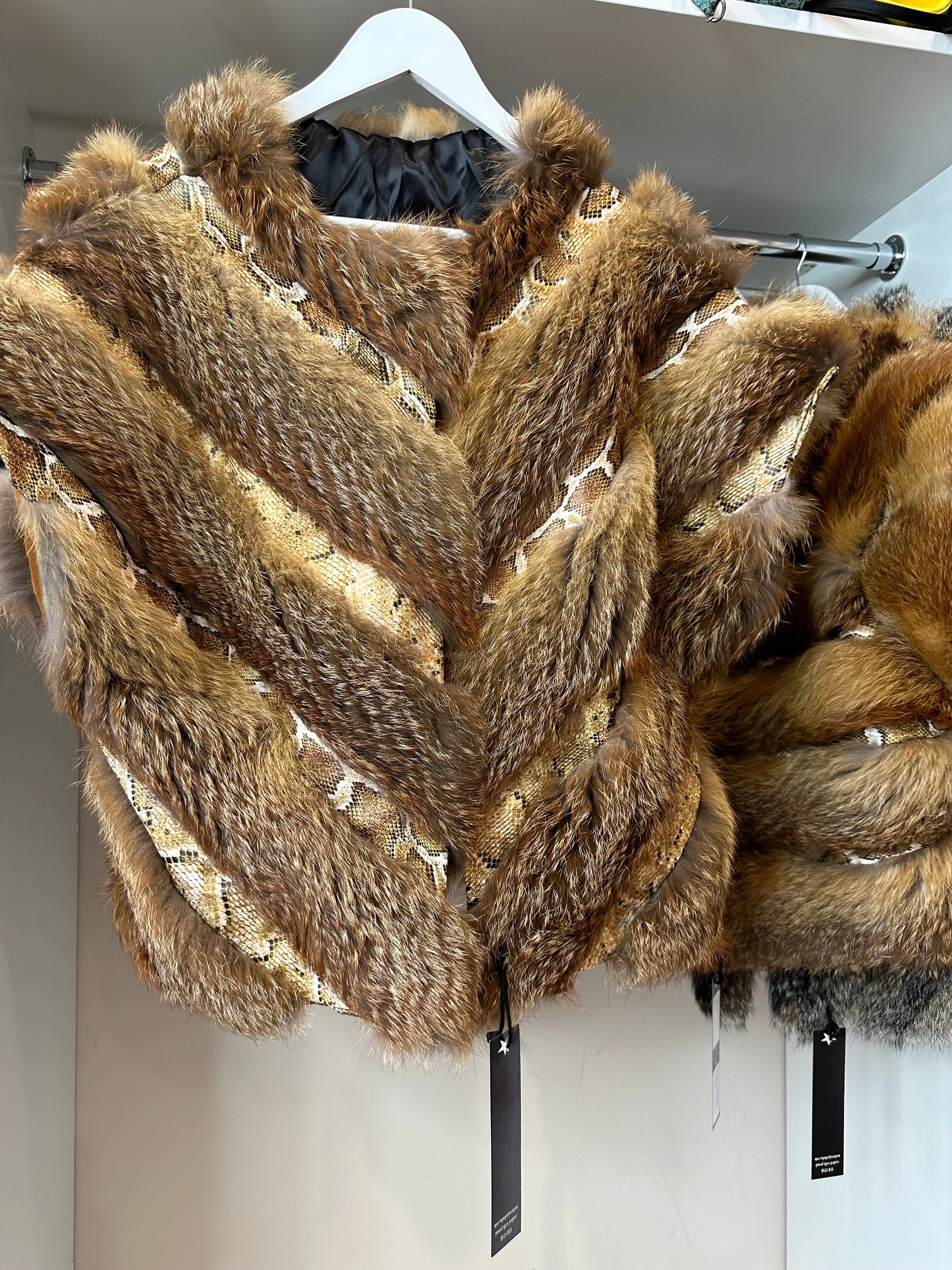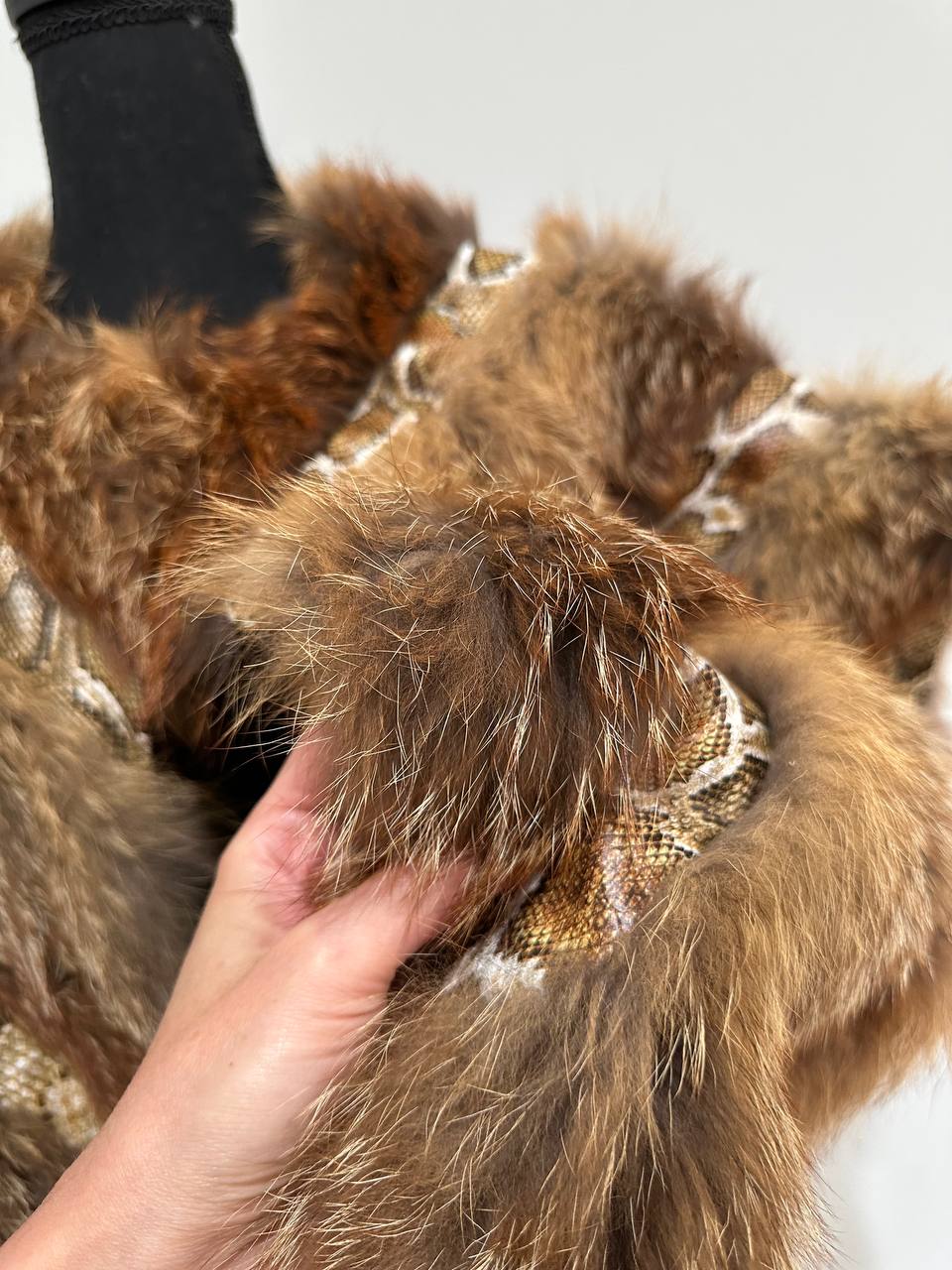 Women's vest made of natural fur of a polar fluffy fox and skin in "python" coloring Size M . An exclusive vest in which you will be irresistible and unique. Fur - fluffy, thick, warm, natural color. Model - the fur is laid with diagonal stripes, the armhole is wide, comfortable. no collar or pockets. Fastens with hooks. Viscose lining, hand-sewn. Ukrainian manufacturer.