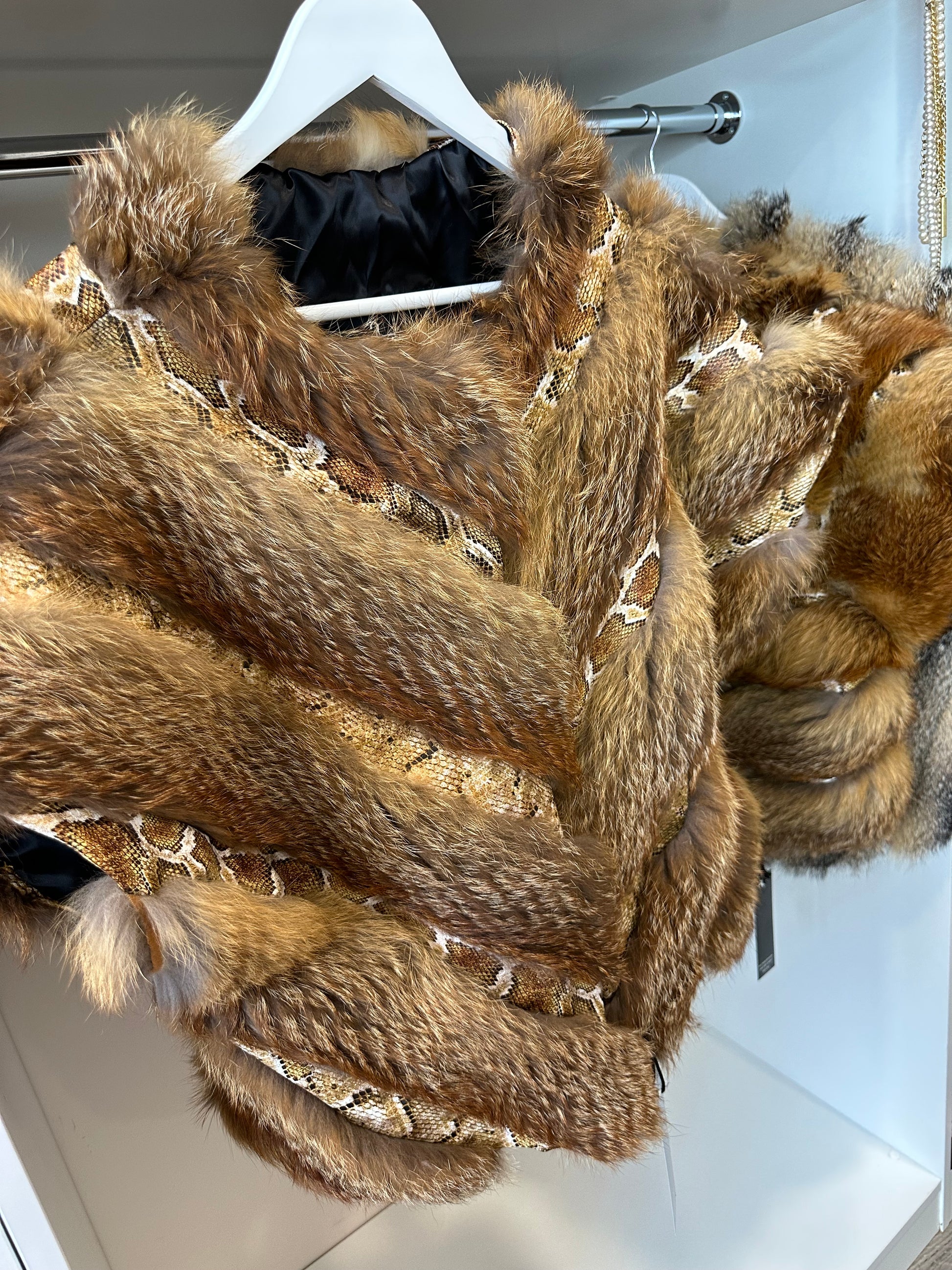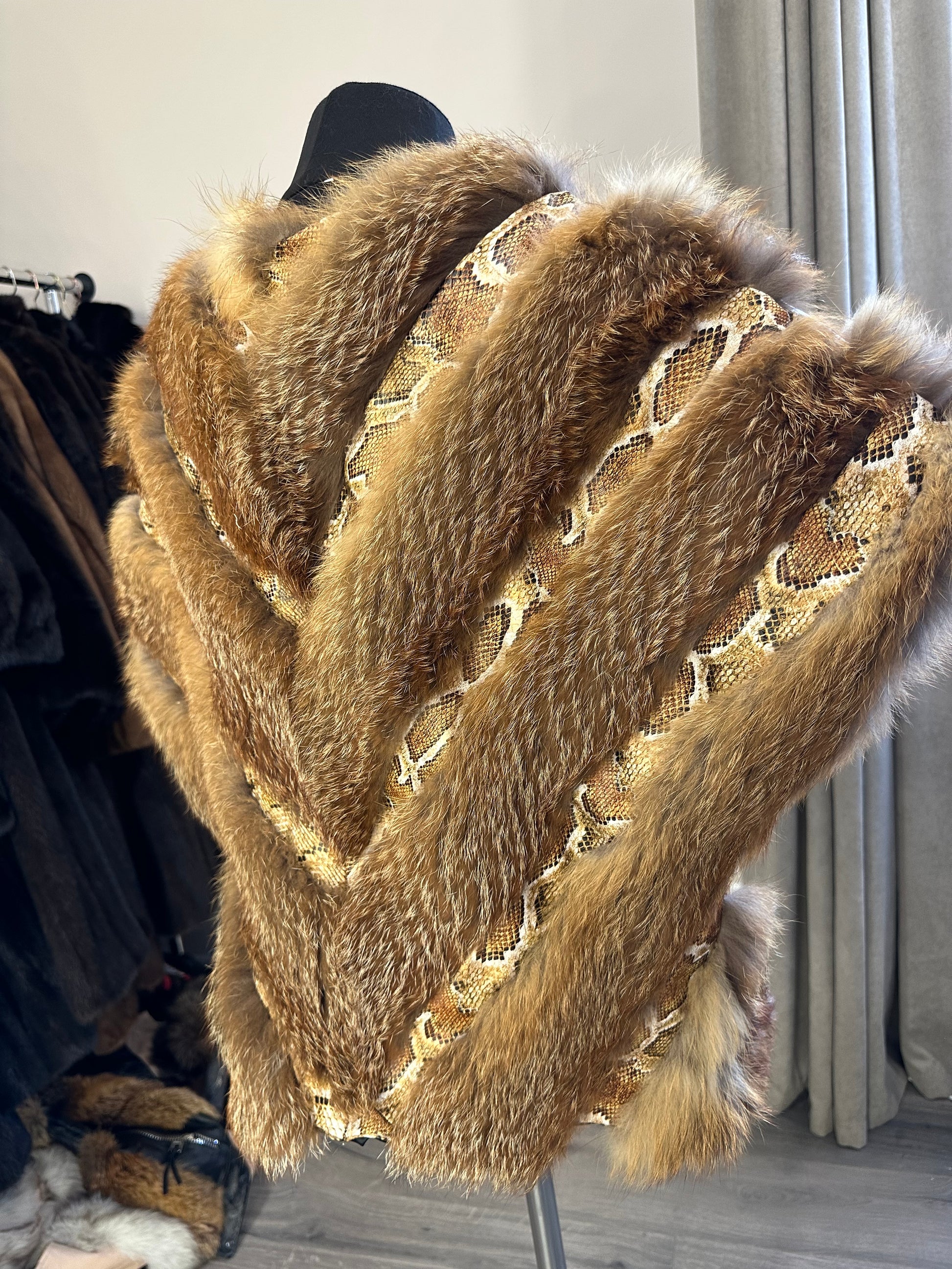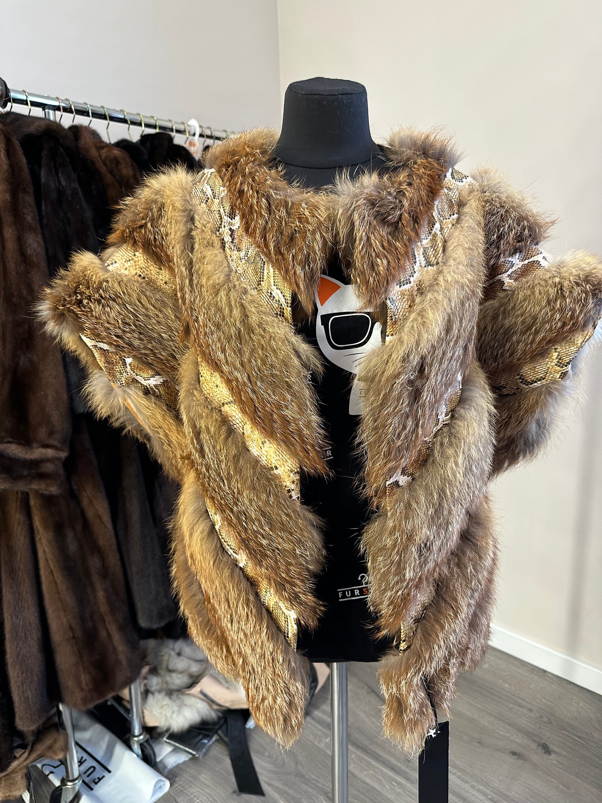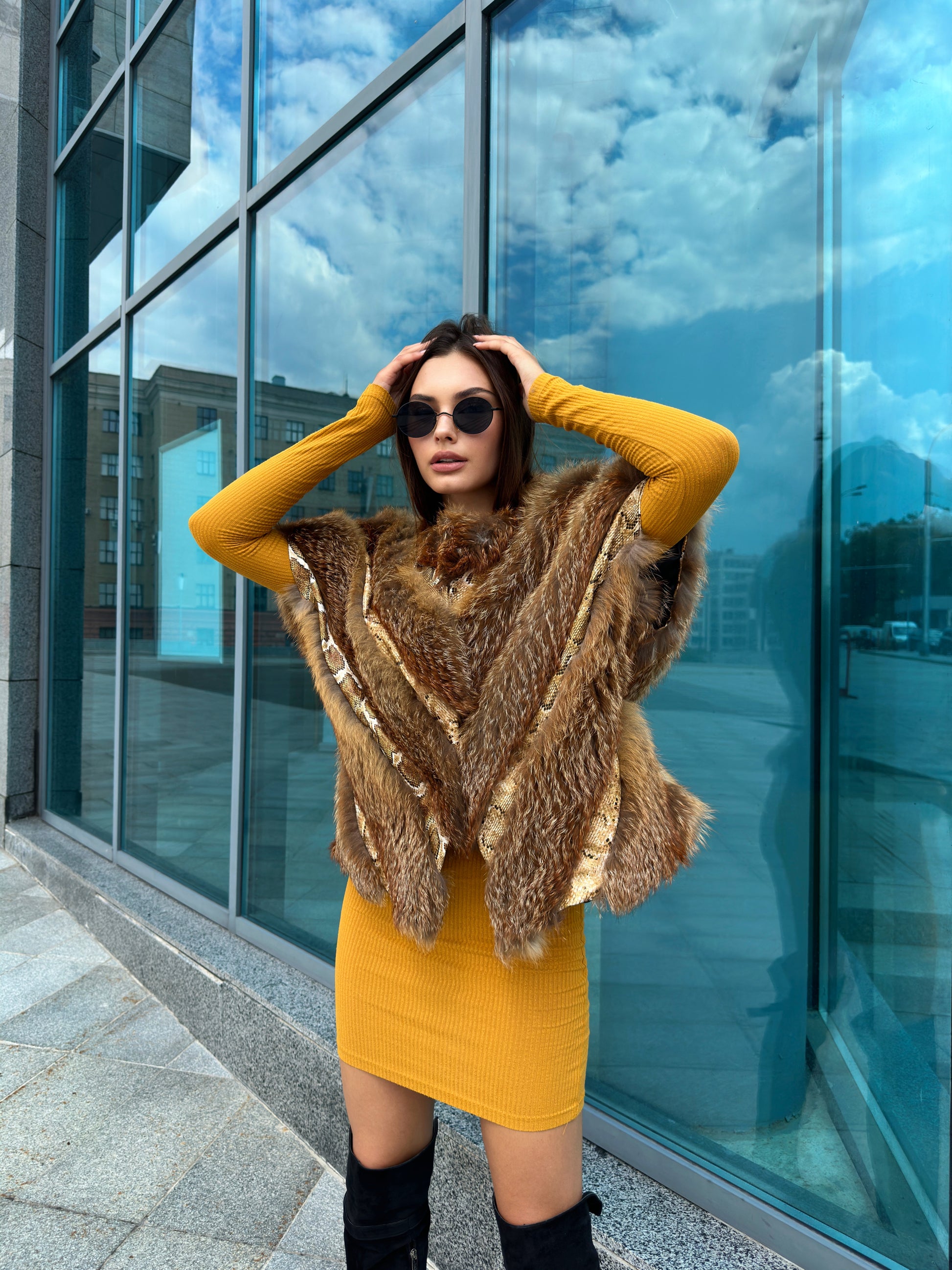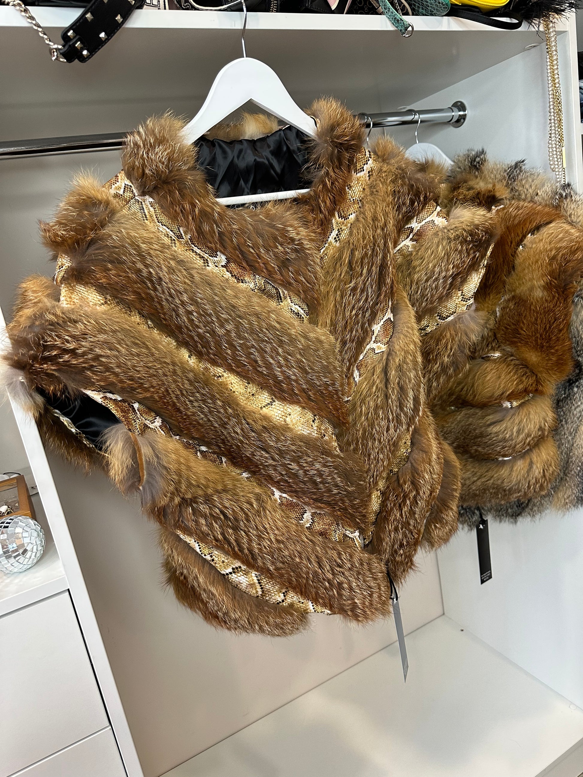 Women's vest made of natural fur of a polar fluffy fox and skin in "python" coloring Size M . An exclusive vest in which you will be irresistible and unique. Fur - fluffy, thick, warm, natural color. Model - the fur is laid with diagonal stripes, the armhole is wide, comfortable. no collar or pockets. Fastens with hooks. Viscose lining, hand-sewn. Ukrainian manufacturer.