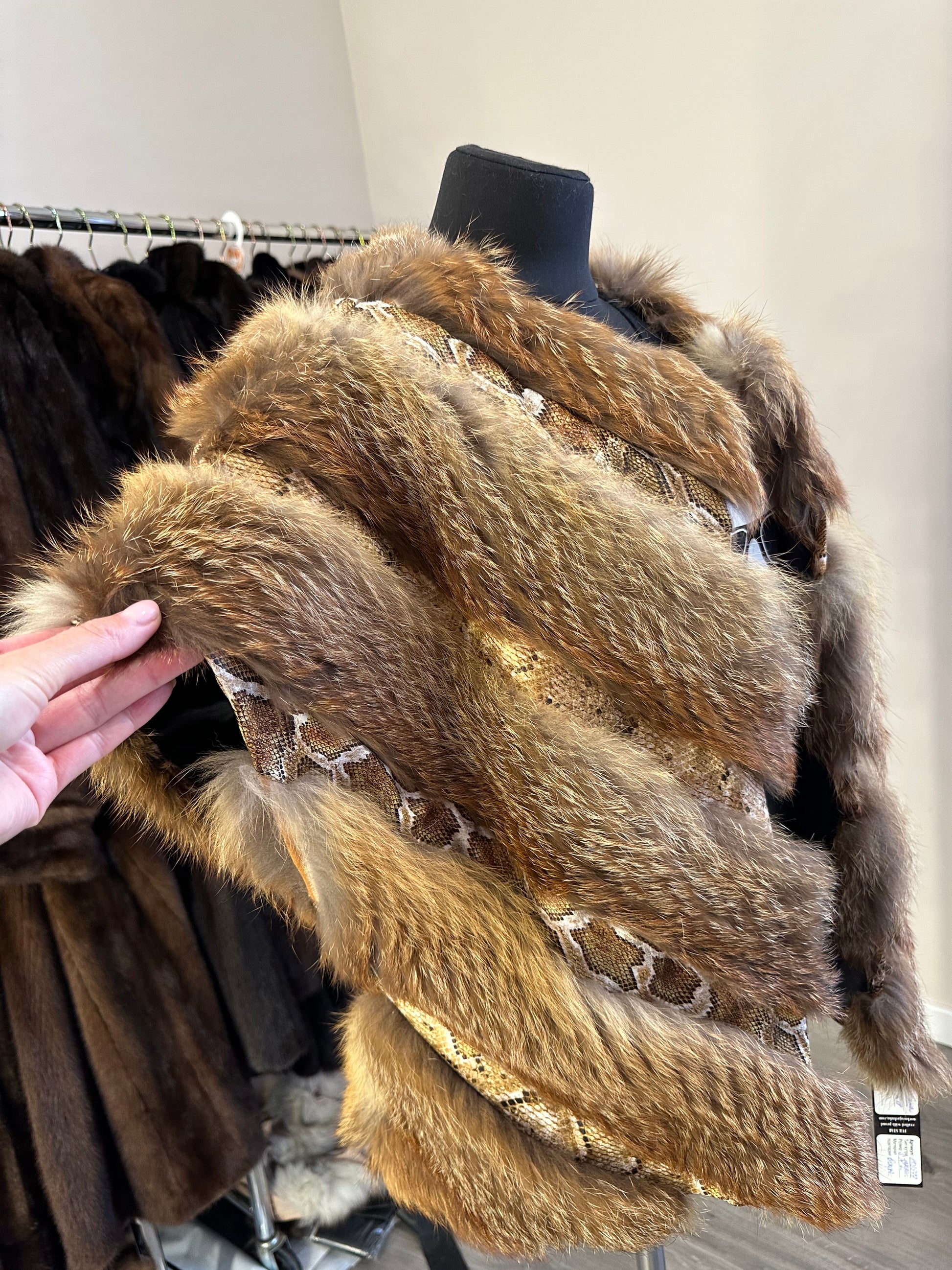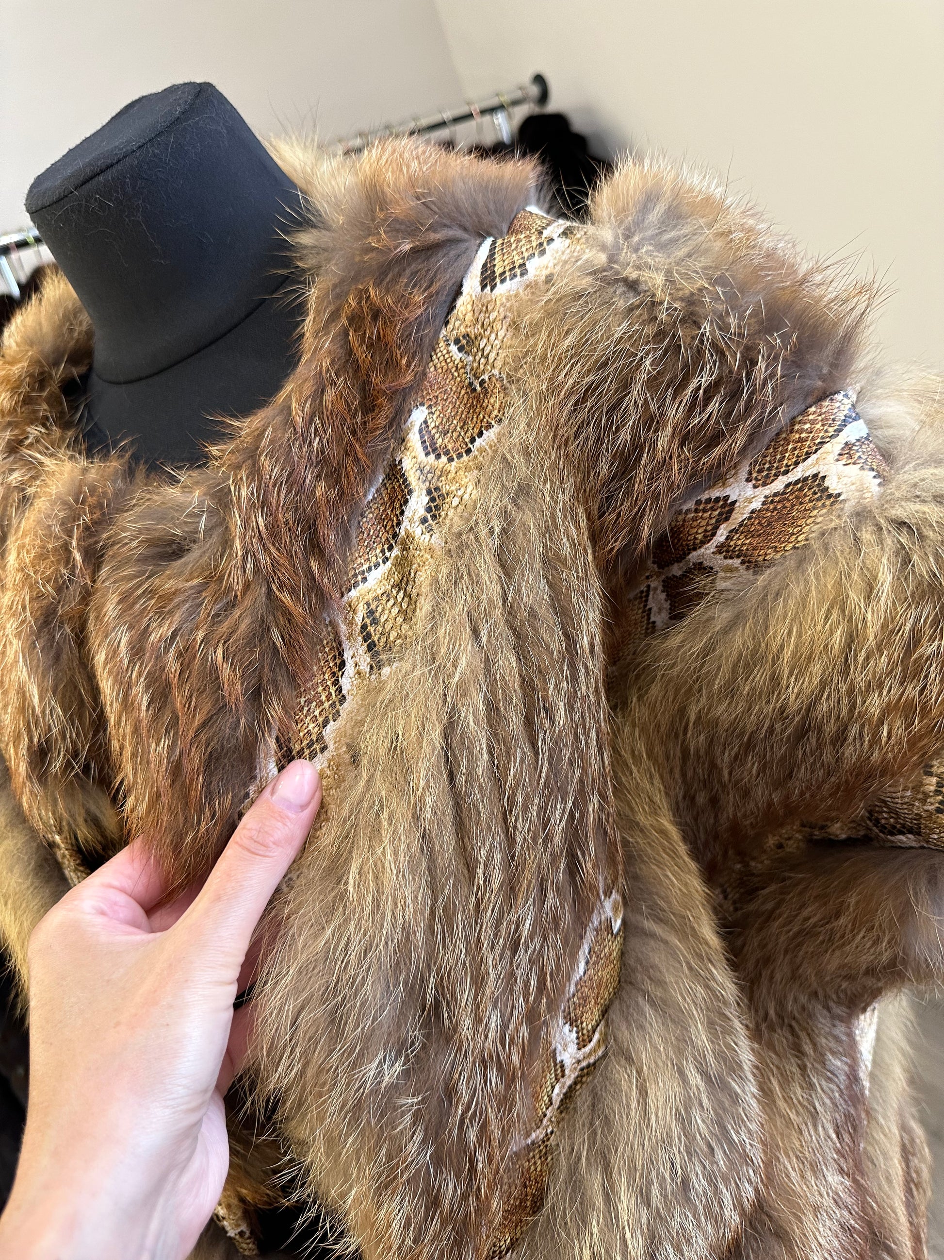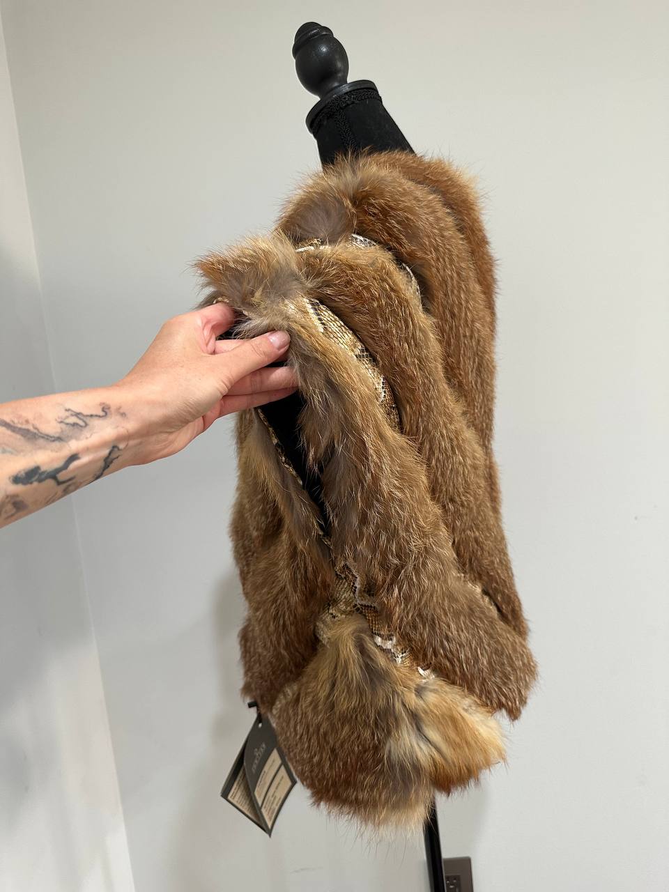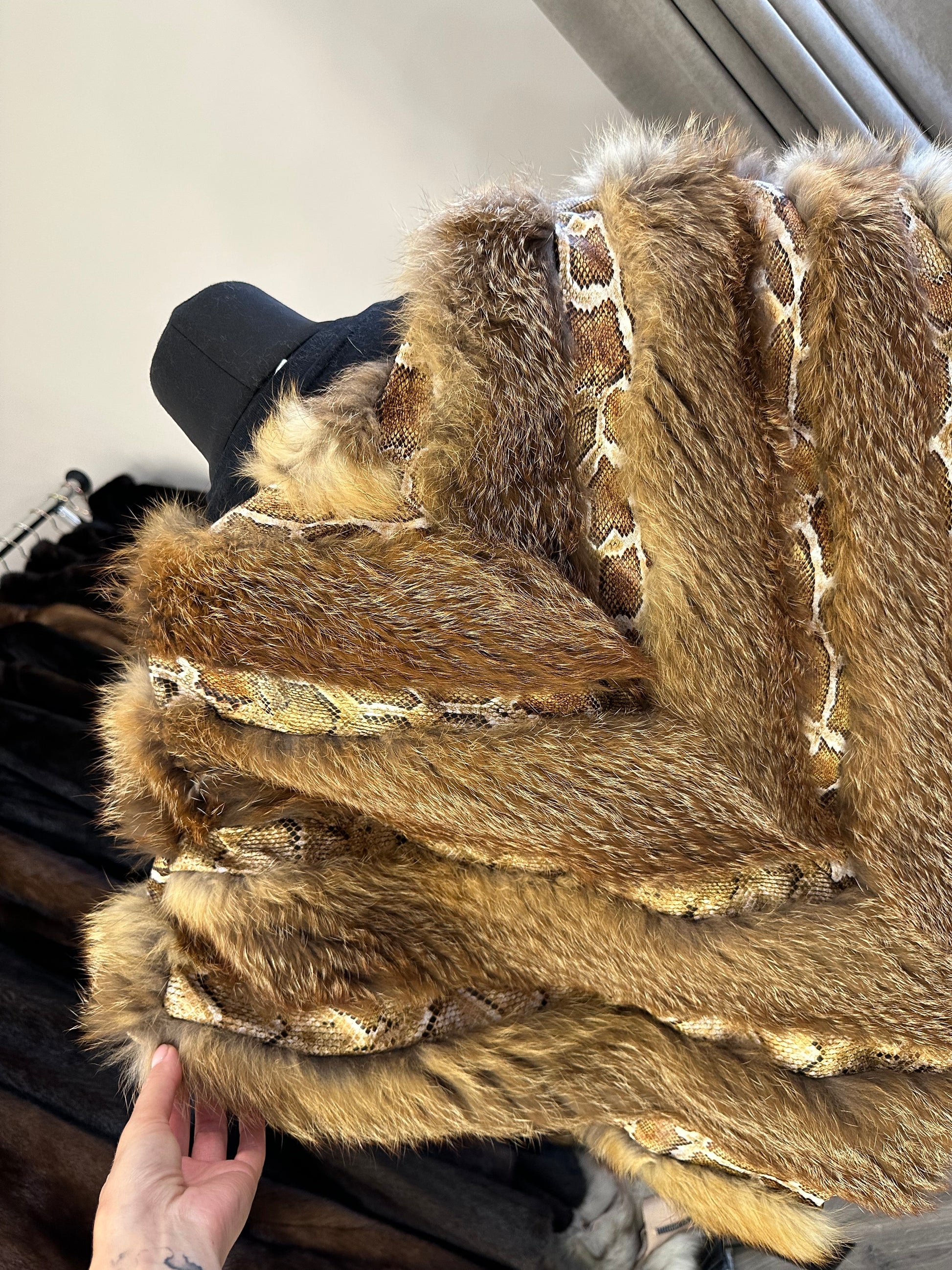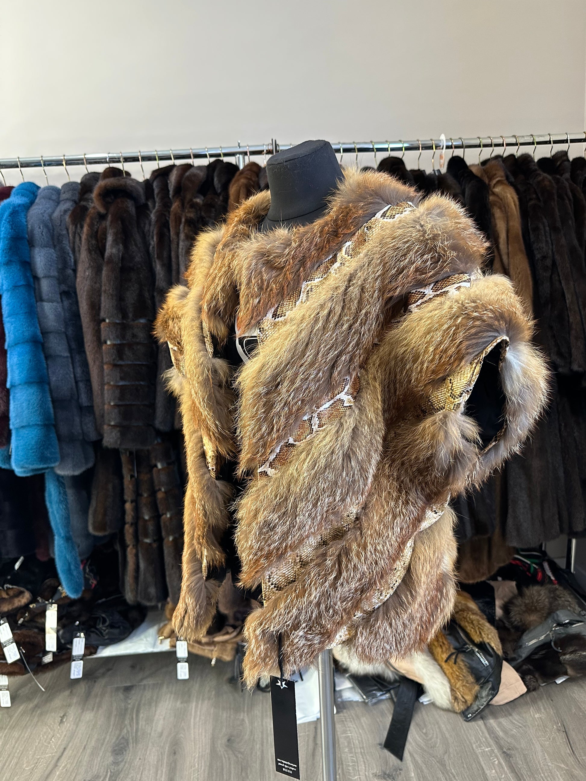 Women's vest made of natural fur of a polar fluffy fox and skin in "python" coloring Size M . An exclusive vest in which you will be irresistible and unique. Fur - fluffy, thick, warm, natural color. Model - the fur is laid with diagonal stripes, the armhole is wide, comfortable. no collar or pockets. Fastens with hooks. Viscose lining, hand-sewn. Ukrainian manufacturer.