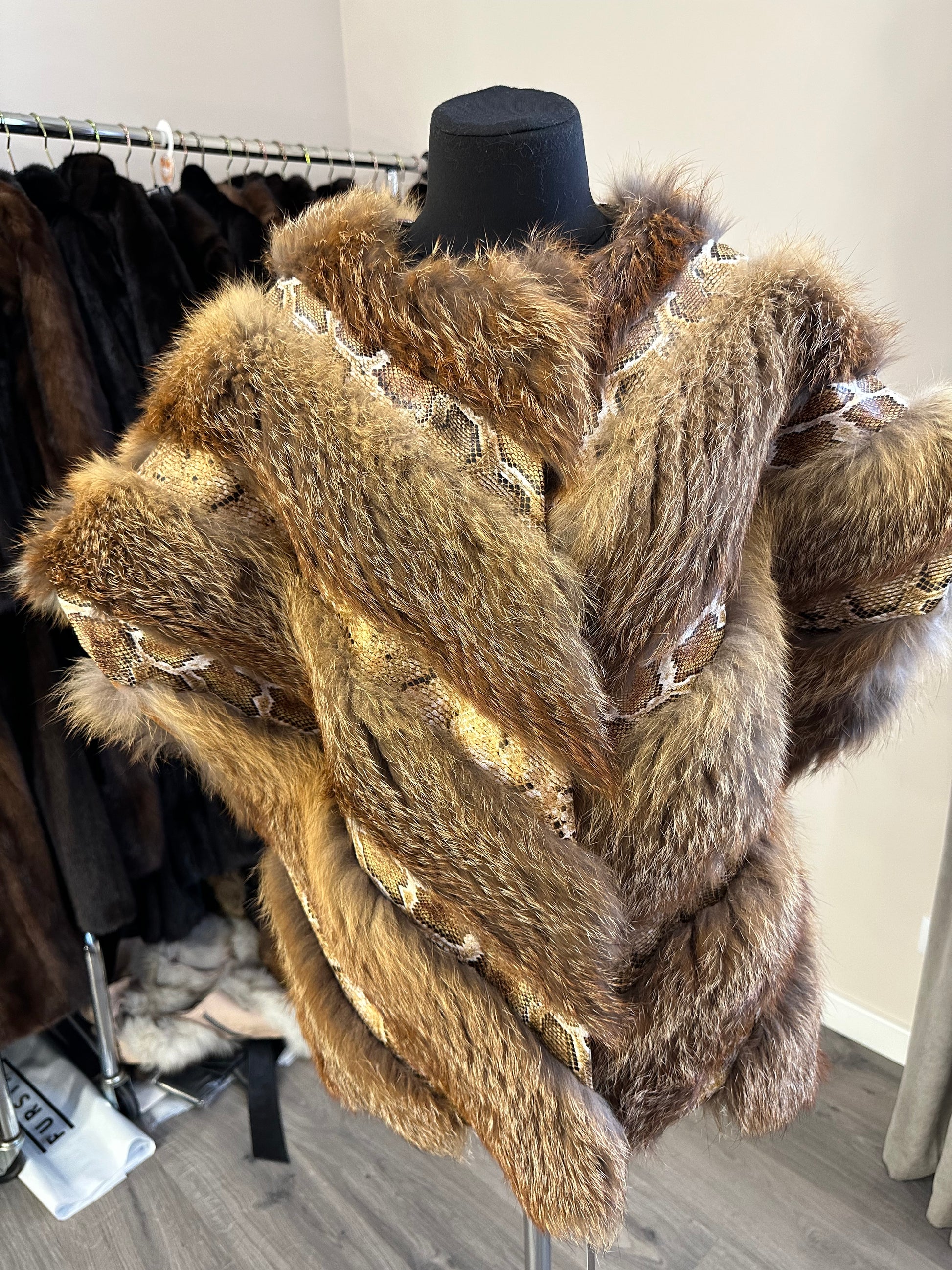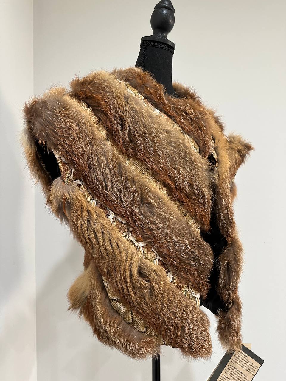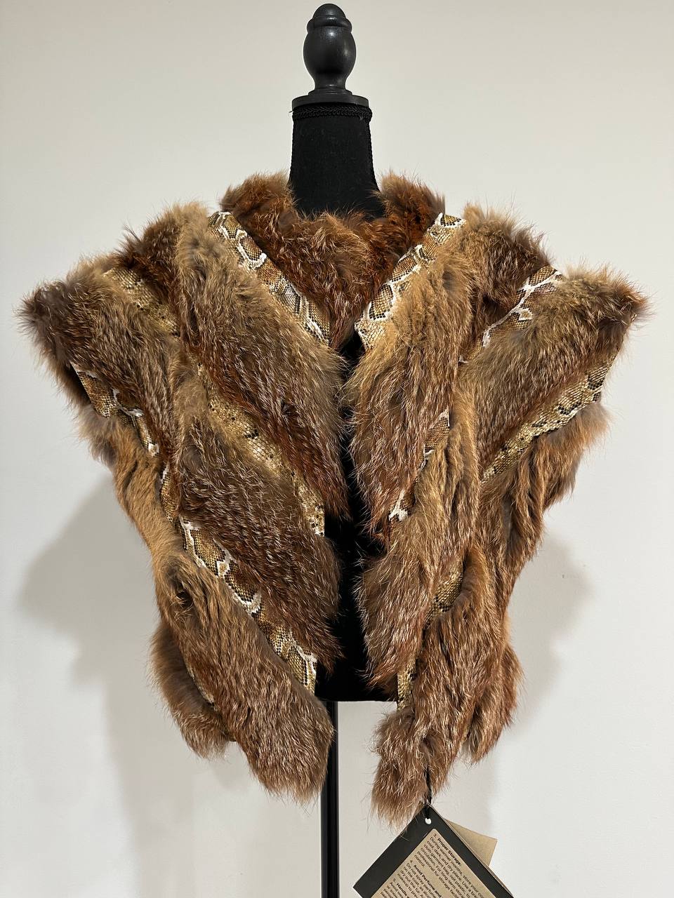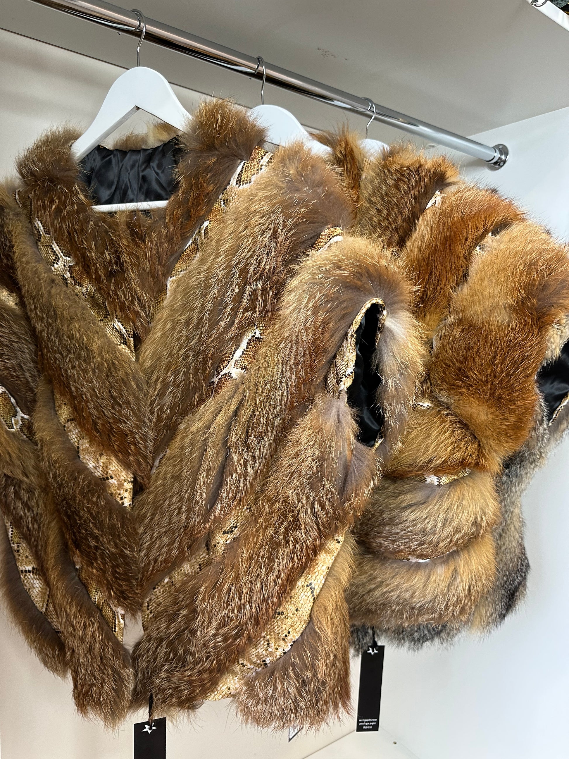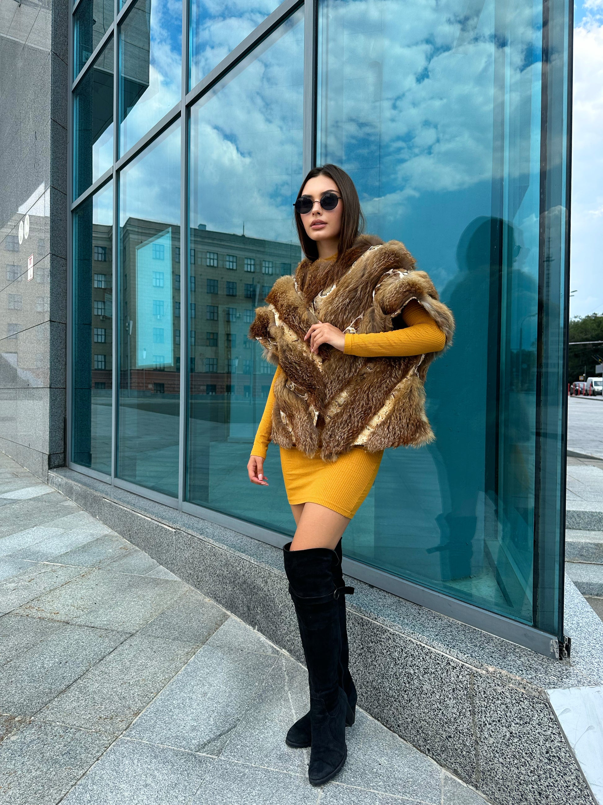 Women's vest made of natural fur of a polar fluffy fox and skin in "python" coloring Size M . An exclusive vest in which you will be irresistible and unique. Fur - fluffy, thick, warm, natural color. Model - the fur is laid with diagonal stripes, the armhole is wide, comfortable. no collar or pockets. Fastens with hooks. Viscose lining, hand-sewn. Ukrainian manufacturer.