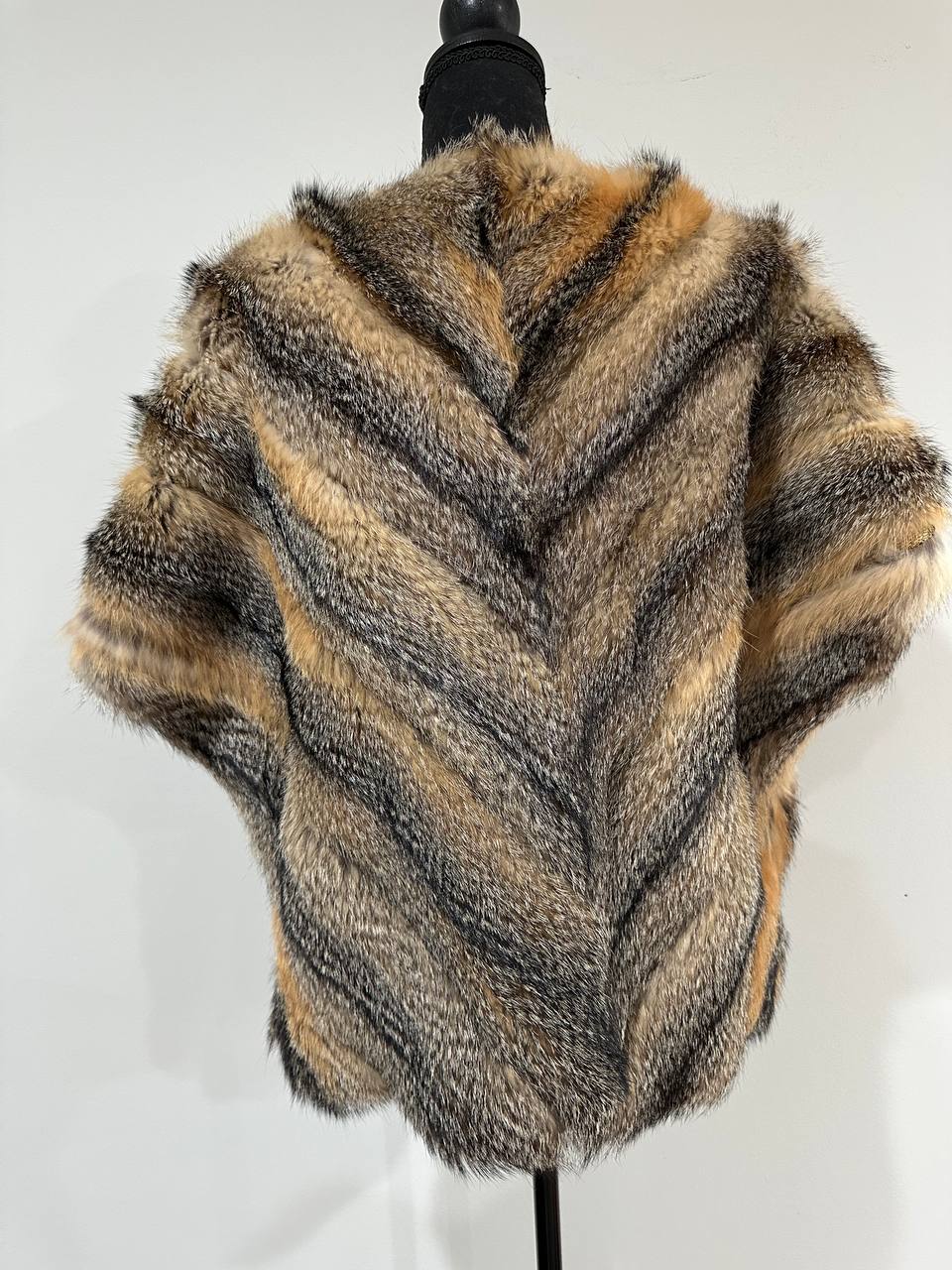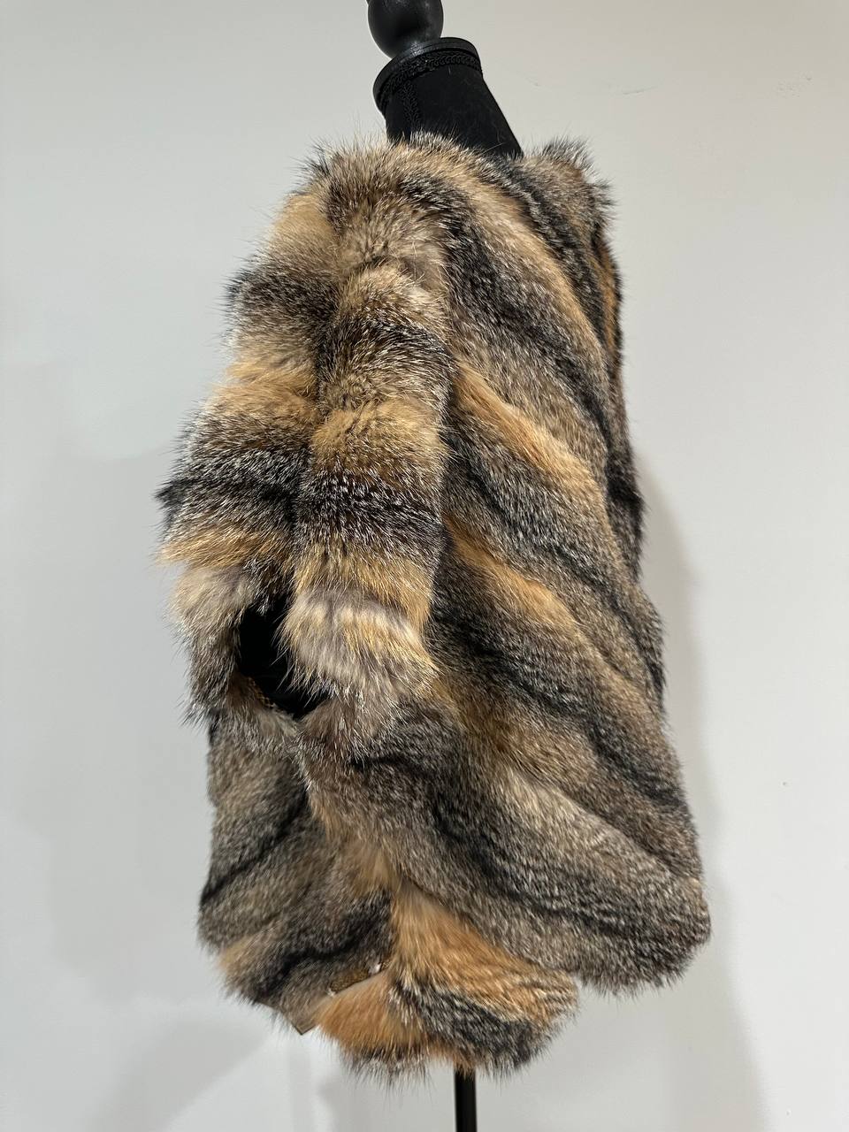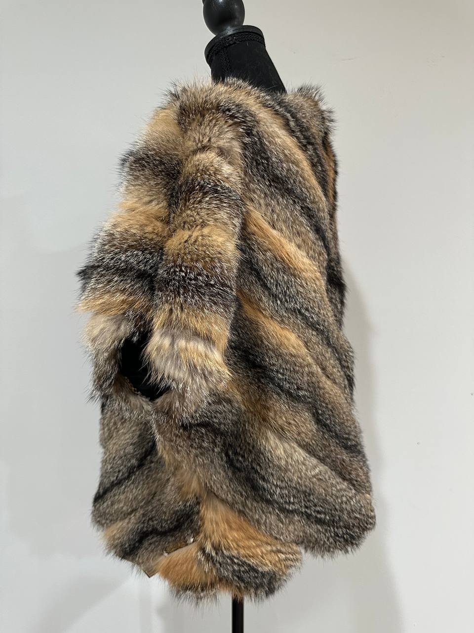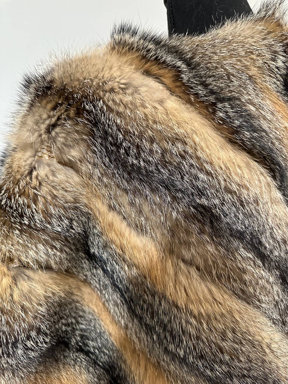 Women's vest in genuine coyote fur and python leather, size L. An exclusive vest in which you will be irresistible and unique. Fur - fluffy, thick, warm, natural color. The model is straight, the fur is laid with diagonal stripes. no collar or pockets. Fastens with hooks. Viscose lining, hand-sewn. Ukrainian manufacturer.