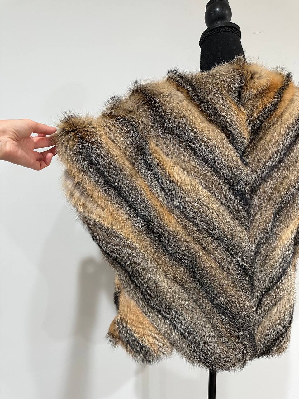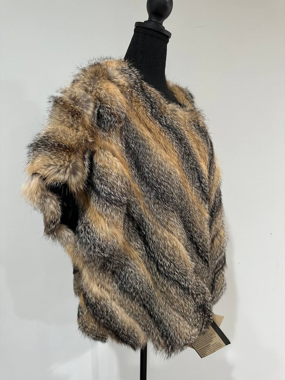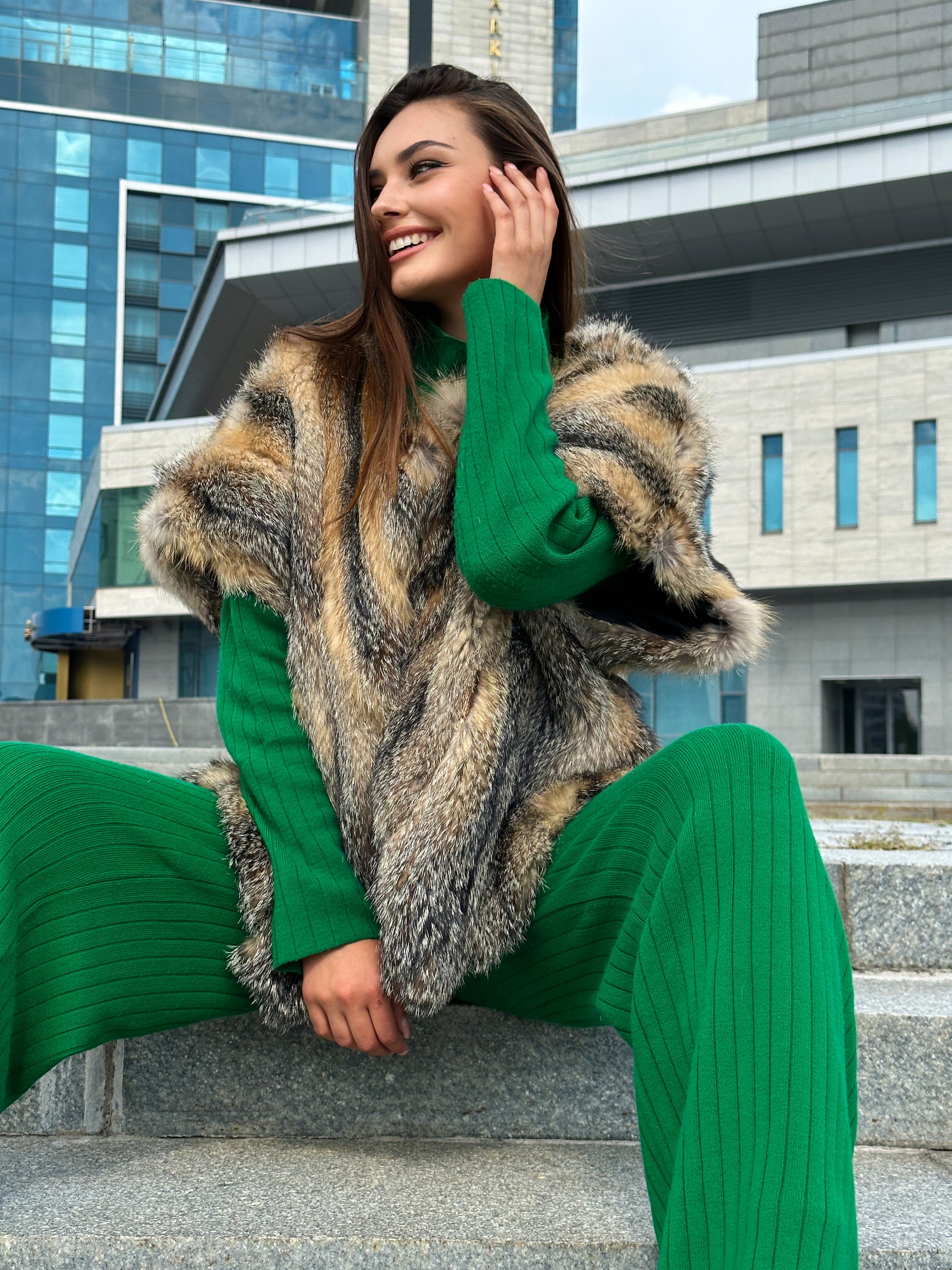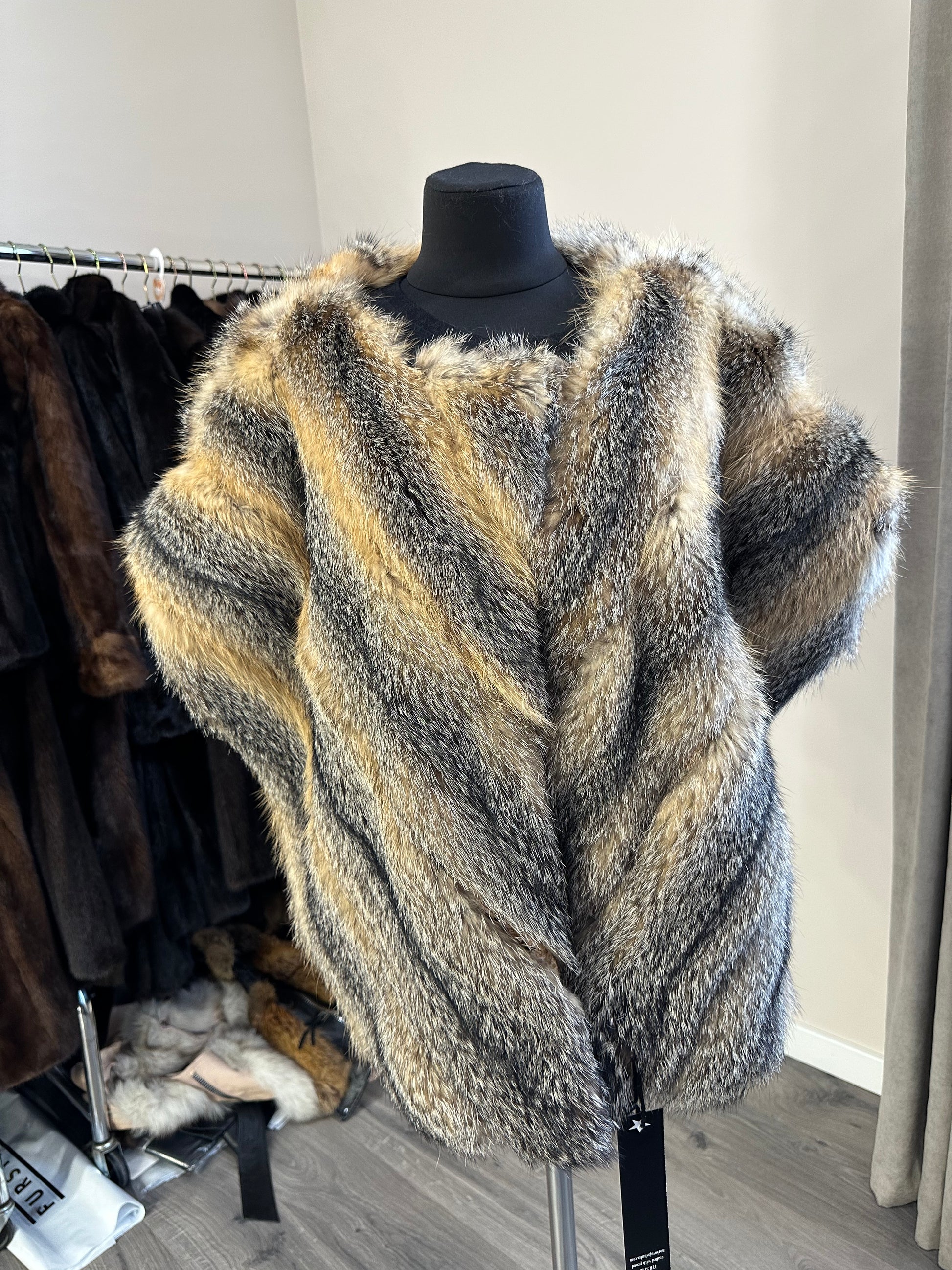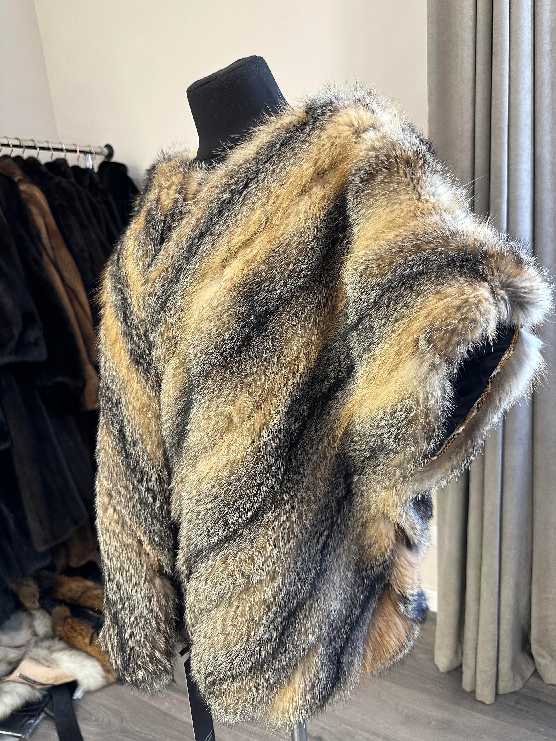 Women's vest in genuine coyote fur and python leather, size L. An exclusive vest in which you will be irresistible and unique. Fur - fluffy, thick, warm, natural color. The model is straight, the fur is laid with diagonal stripes. no collar or pockets. Fastens with hooks. Viscose lining, hand-sewn. Ukrainian manufacturer.