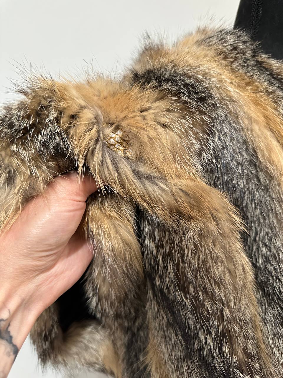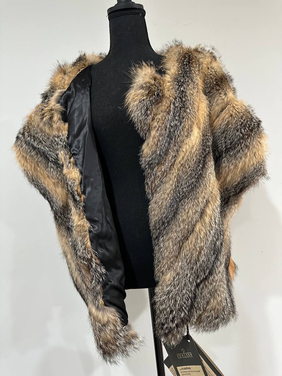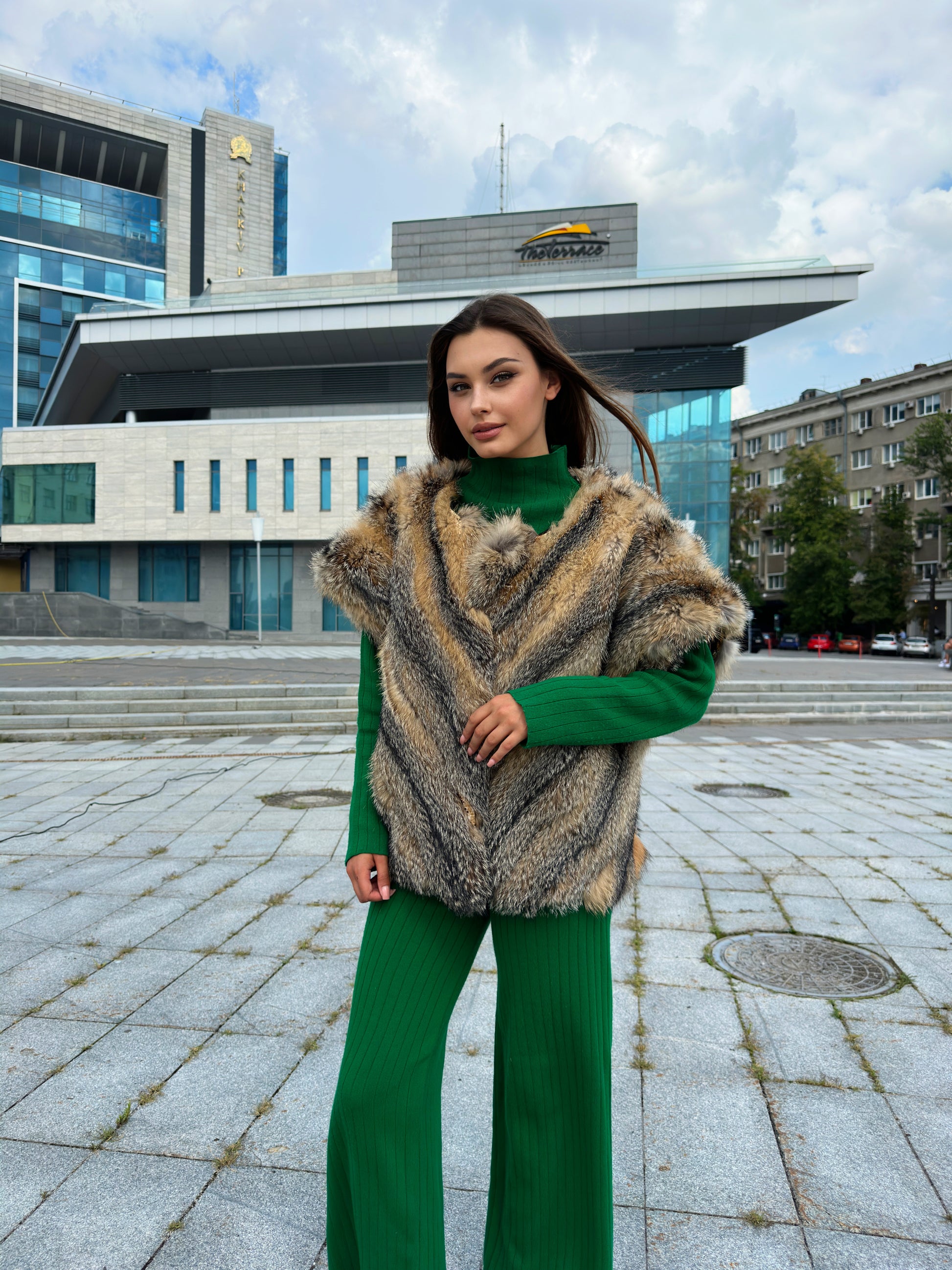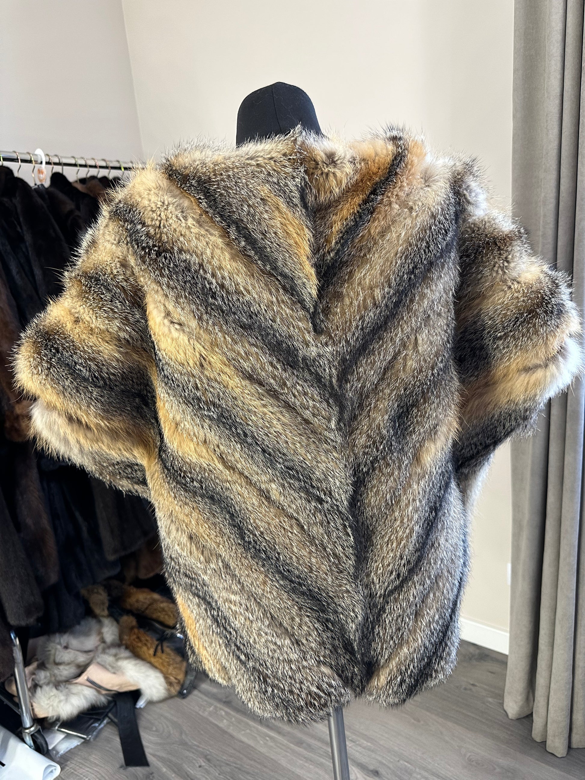 Women's vest in genuine coyote fur and python leather, size L. An exclusive vest in which you will be irresistible and unique. Fur - fluffy, thick, warm, natural color. The model is straight, the fur is laid with diagonal stripes. no collar or pockets. Fastens with hooks. Viscose lining, hand-sewn. Ukrainian manufacturer.
