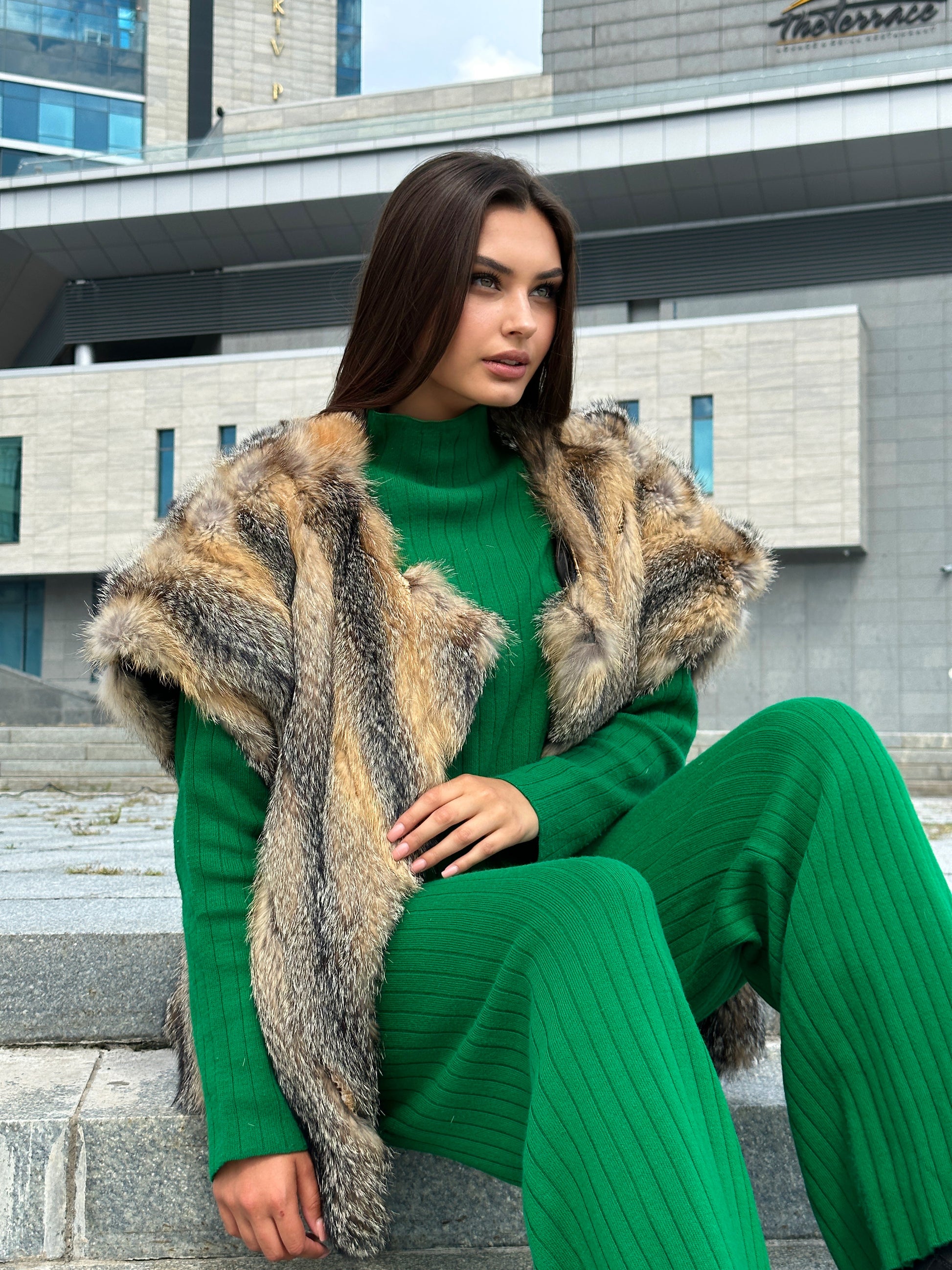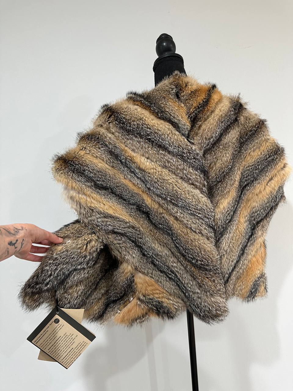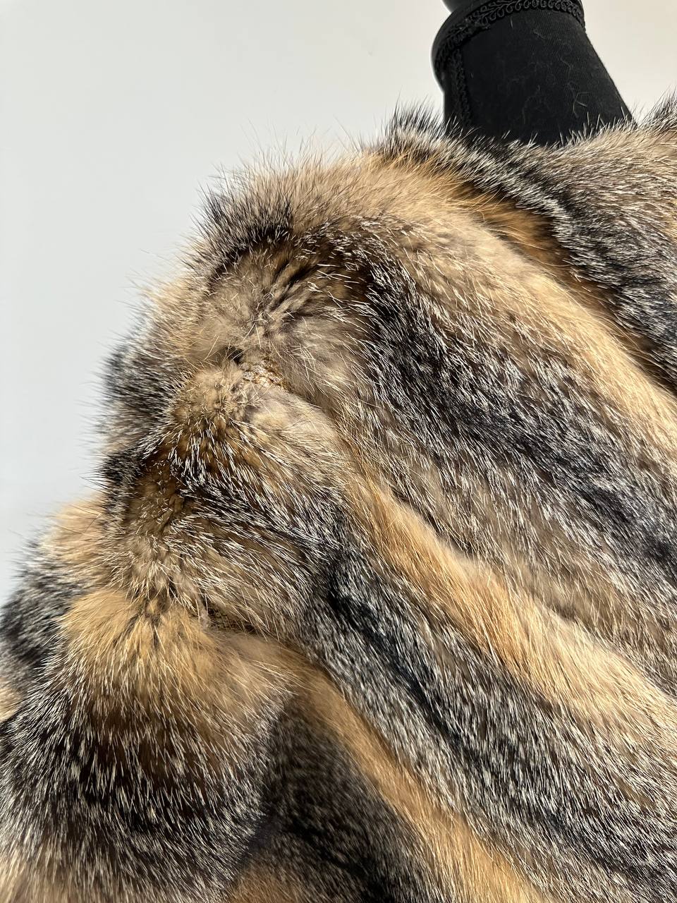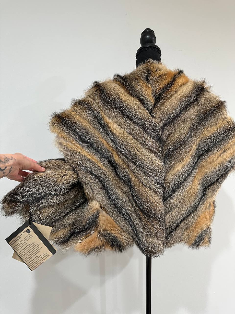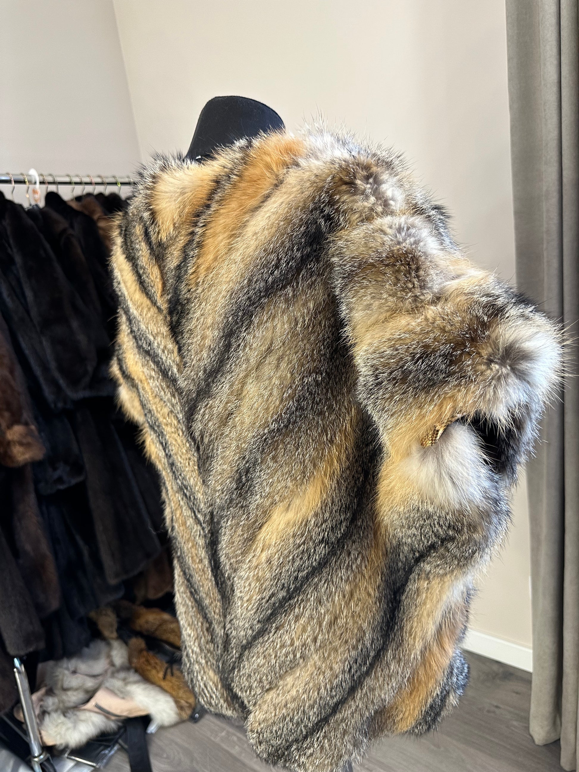 Women's vest in genuine coyote fur and python leather, size L. An exclusive vest in which you will be irresistible and unique. Fur - fluffy, thick, warm, natural color. The model is straight, the fur is laid with diagonal stripes. no collar or pockets. Fastens with hooks. Viscose lining, hand-sewn. Ukrainian manufacturer.