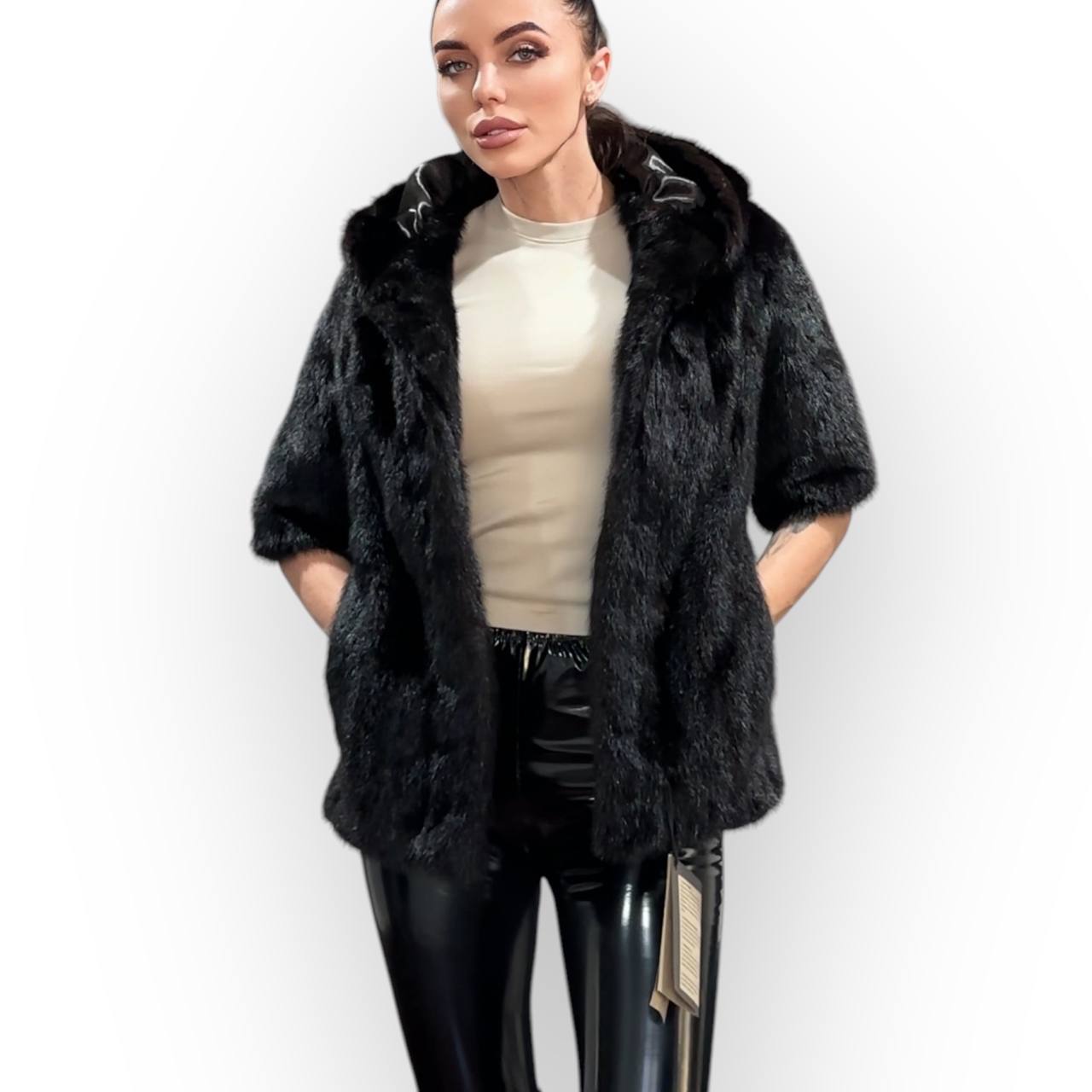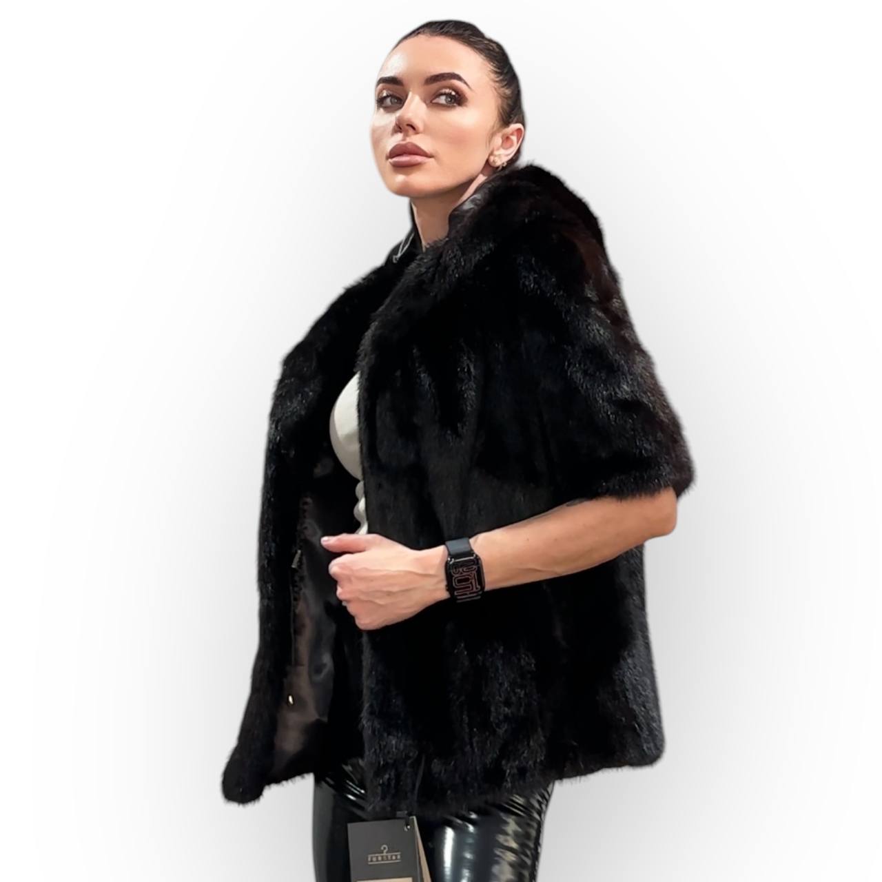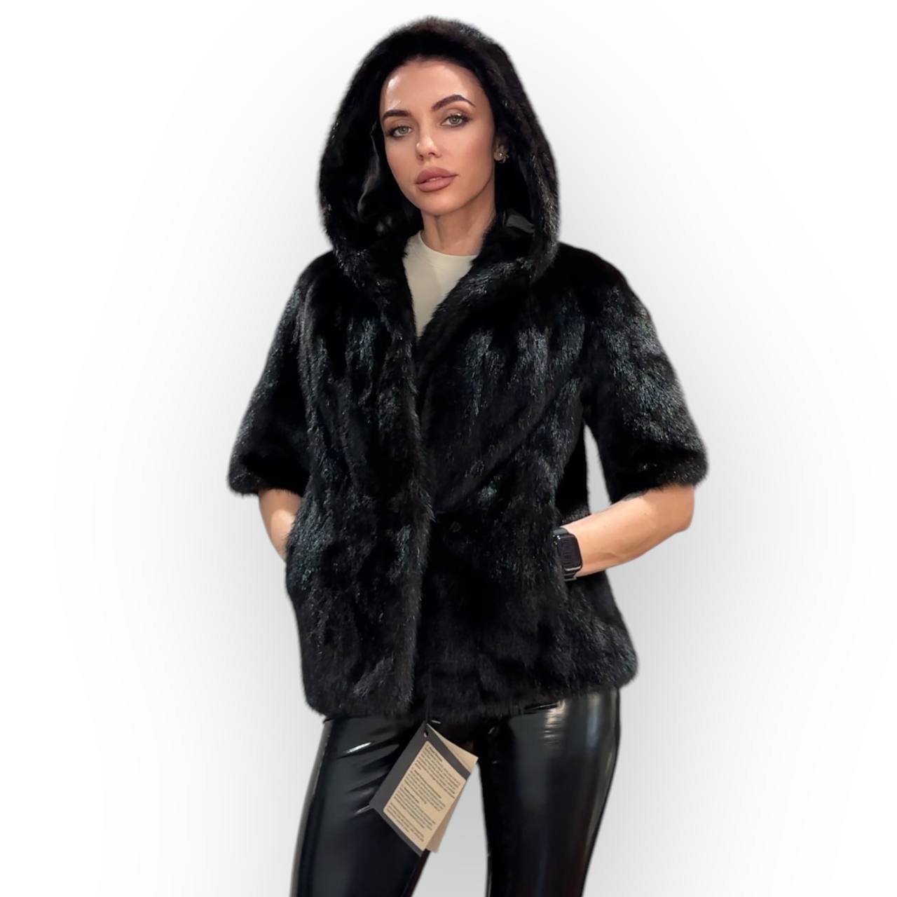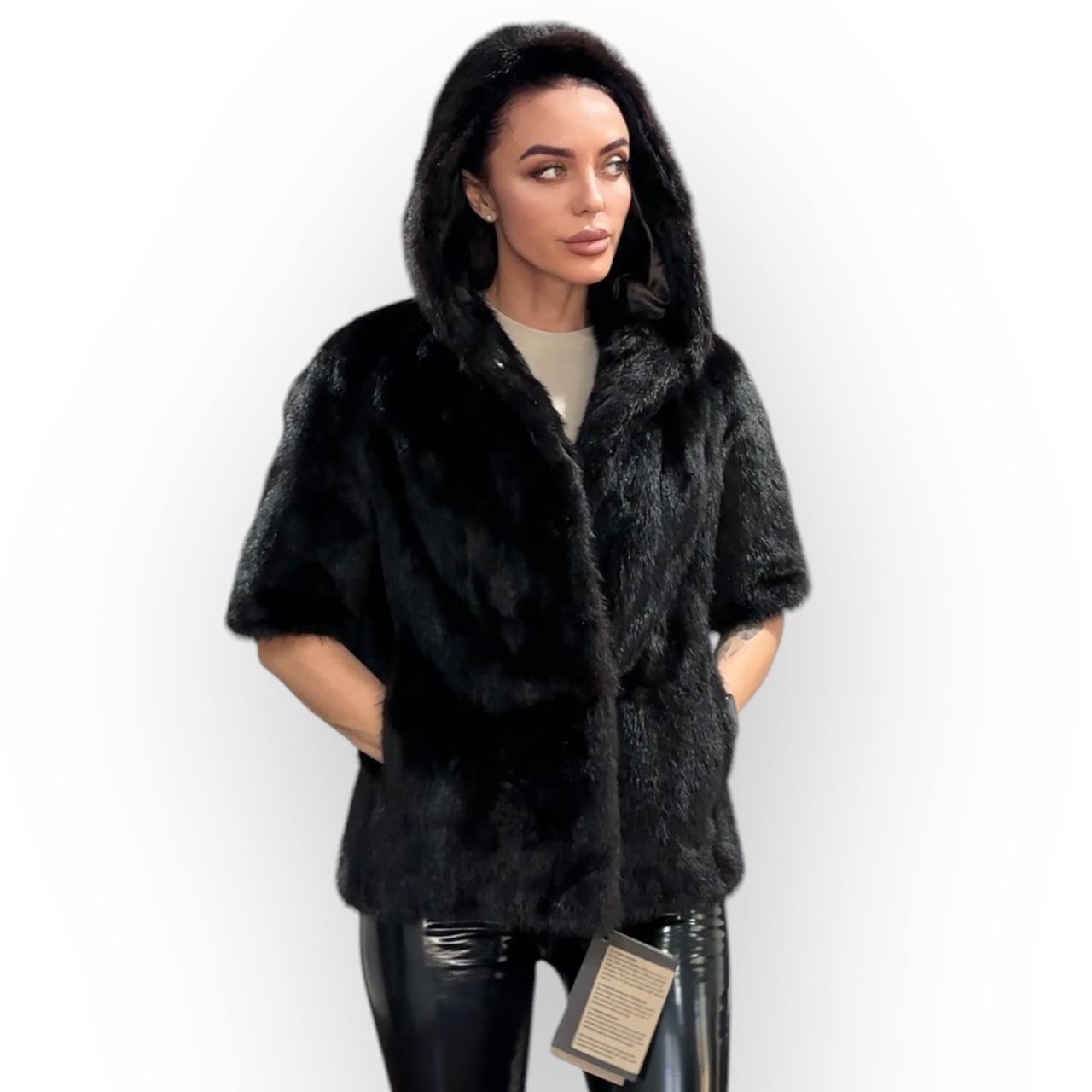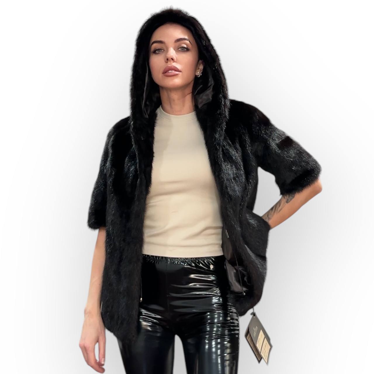 Women's mink fur coat VEST with a hood size S model bomber. Color - BLACK, natural color. A drawstring is sewn at the bottom of the product . The sleeves are SHORT. There are 2 pockets and 1 inside. Fastens with hooks. Ukrainian manufacturer trade mark FURSTAR - SiNCE 2008. Mink - soft, shiny pile, fluffy, beautiful shade. Hand-sewn viscose lining.