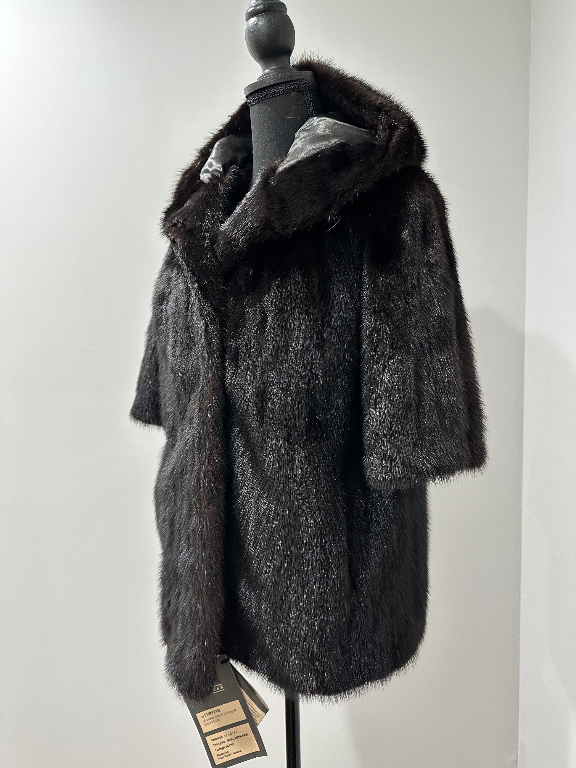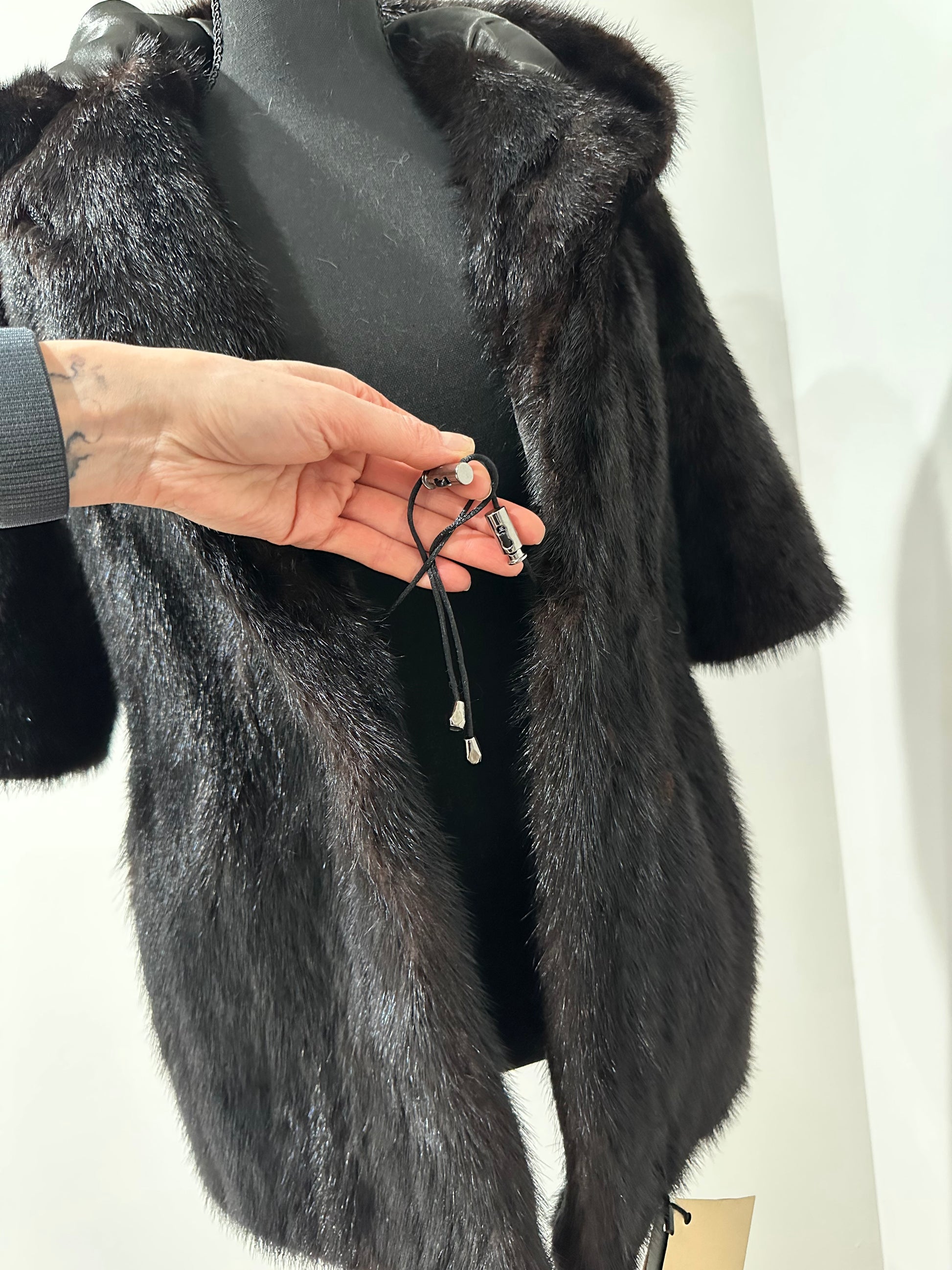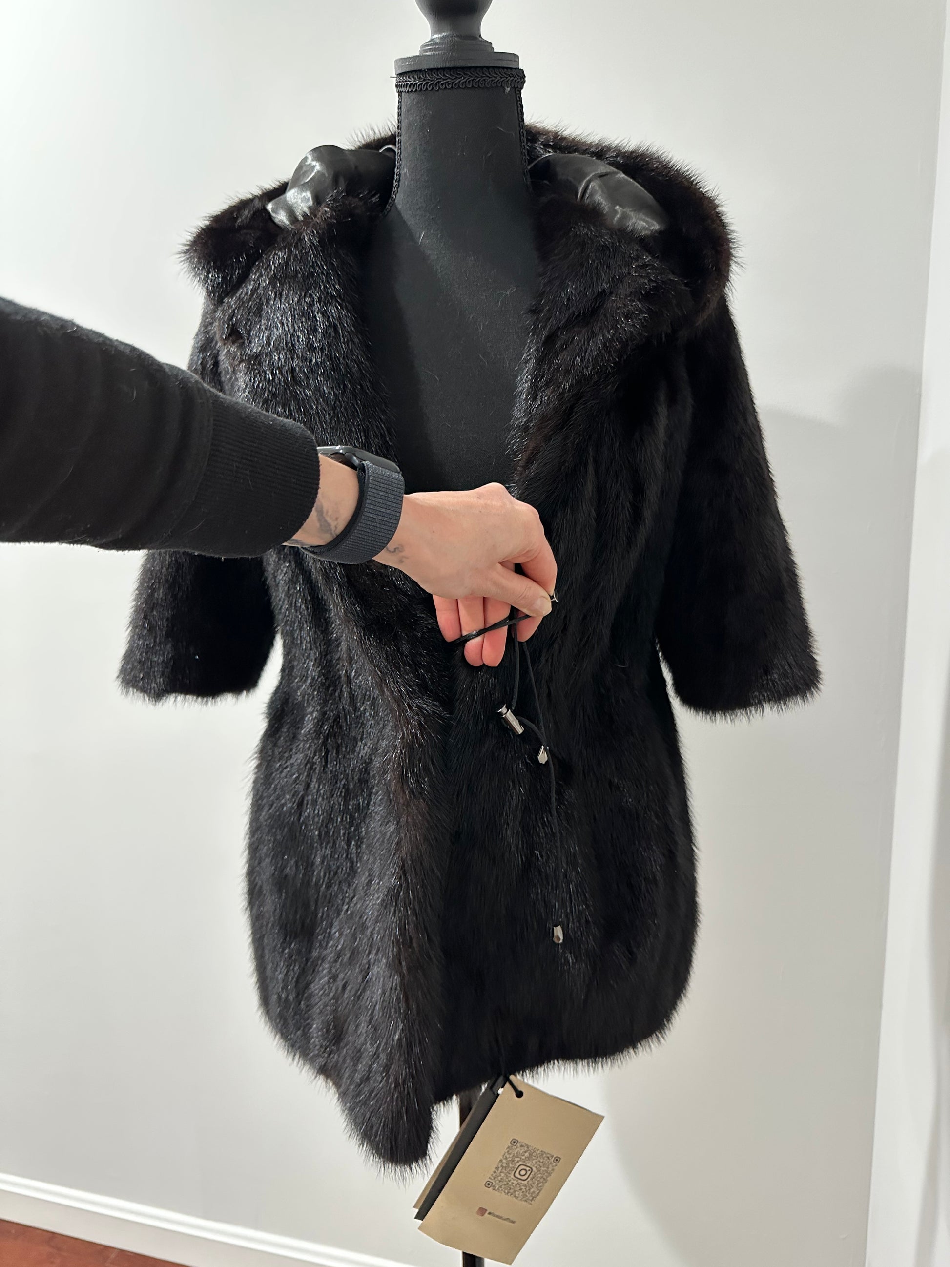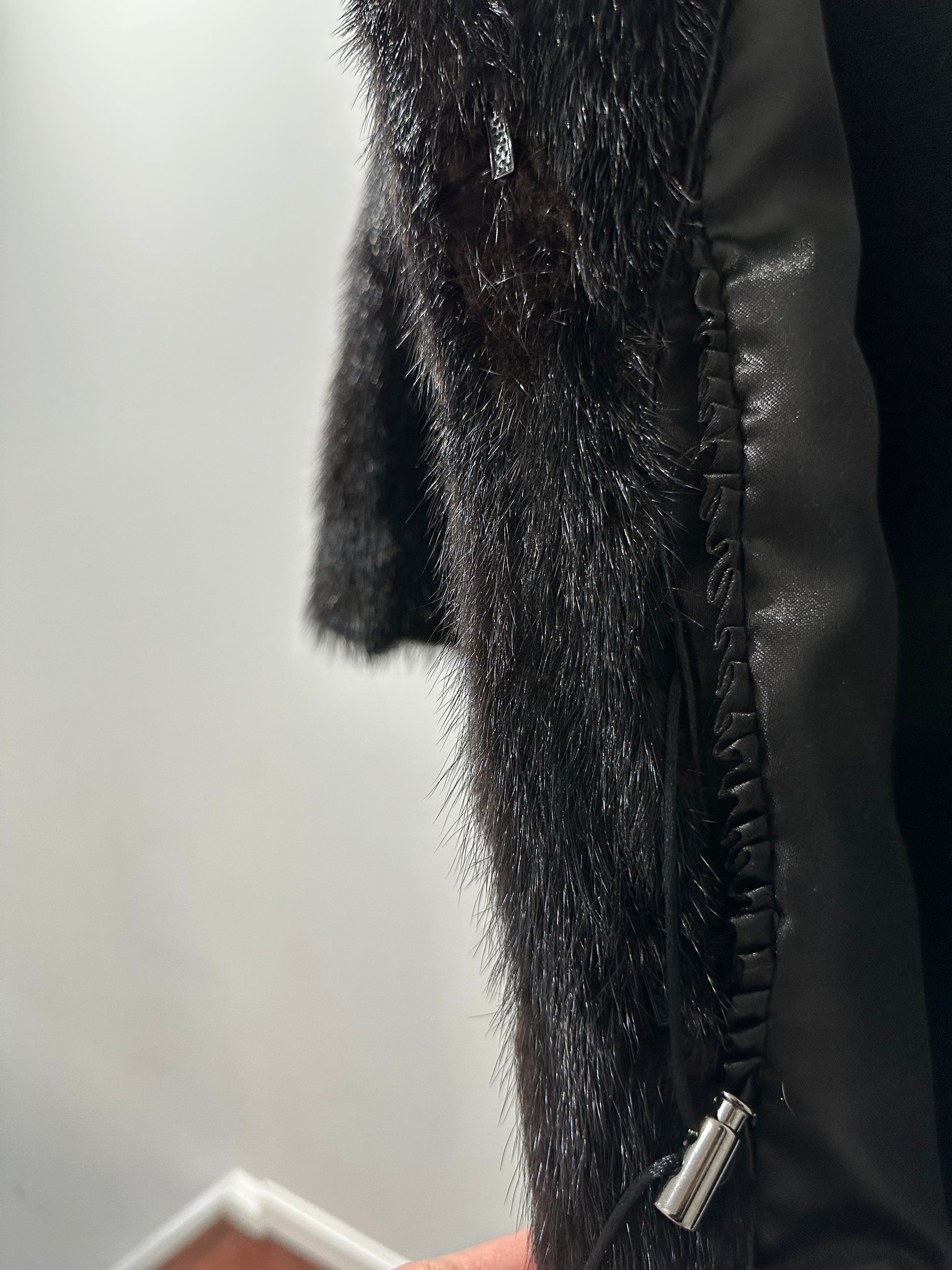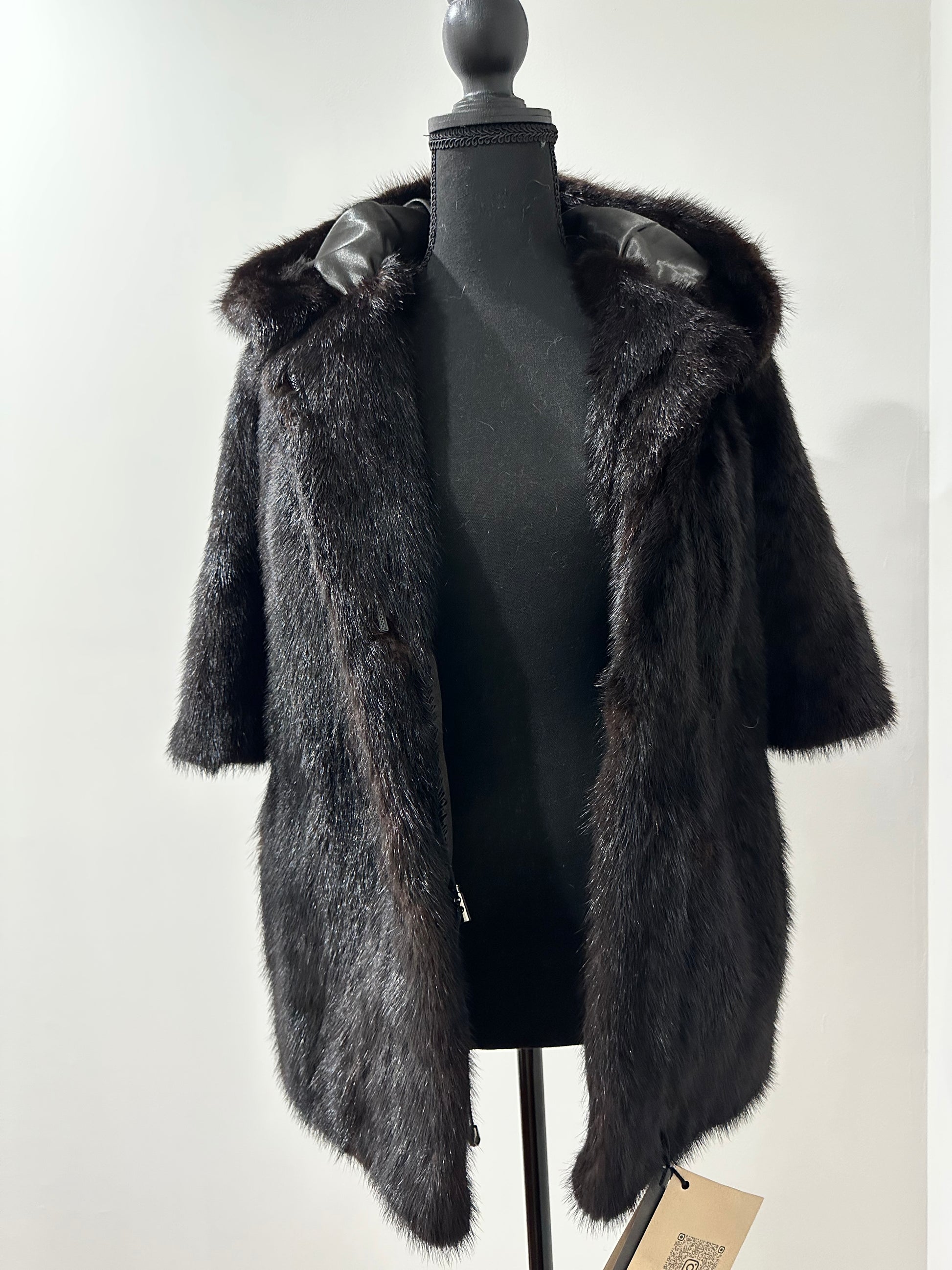 Women's mink fur coat VEST with a hood size S model bomber. Color - BLACK, natural color. A drawstring is sewn at the bottom of the product . The sleeves are SHORT. There are 2 pockets and 1 inside. Fastens with hooks. Ukrainian manufacturer trade mark FURSTAR - SiNCE 2008. Mink - soft, shiny pile, fluffy, beautiful shade. Hand-sewn viscose lining.
