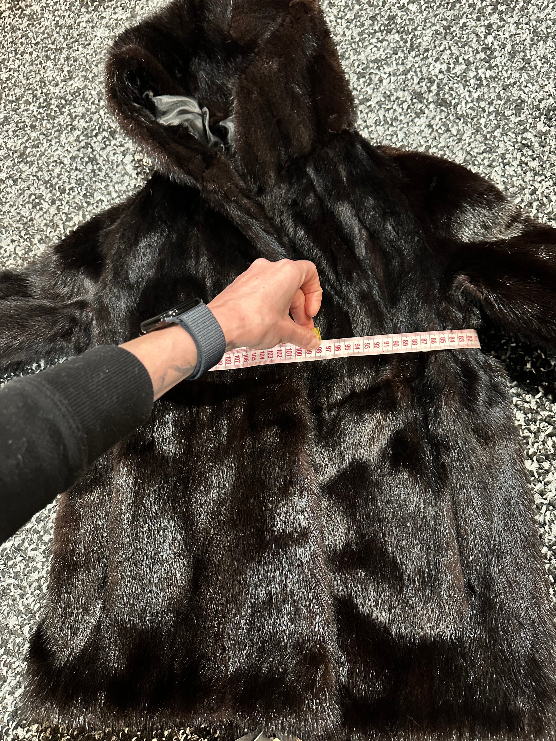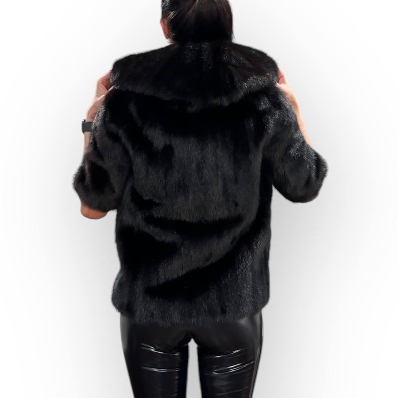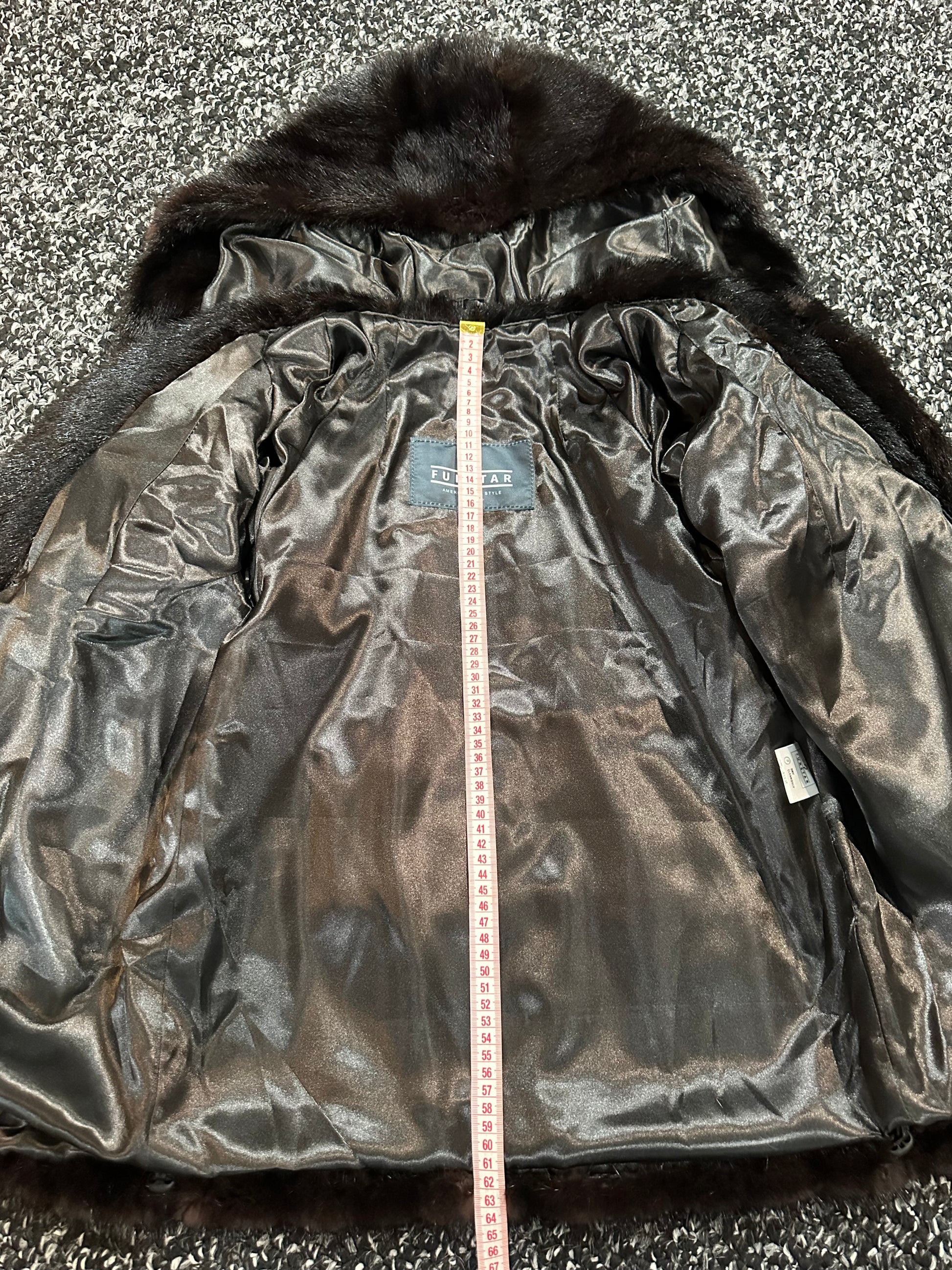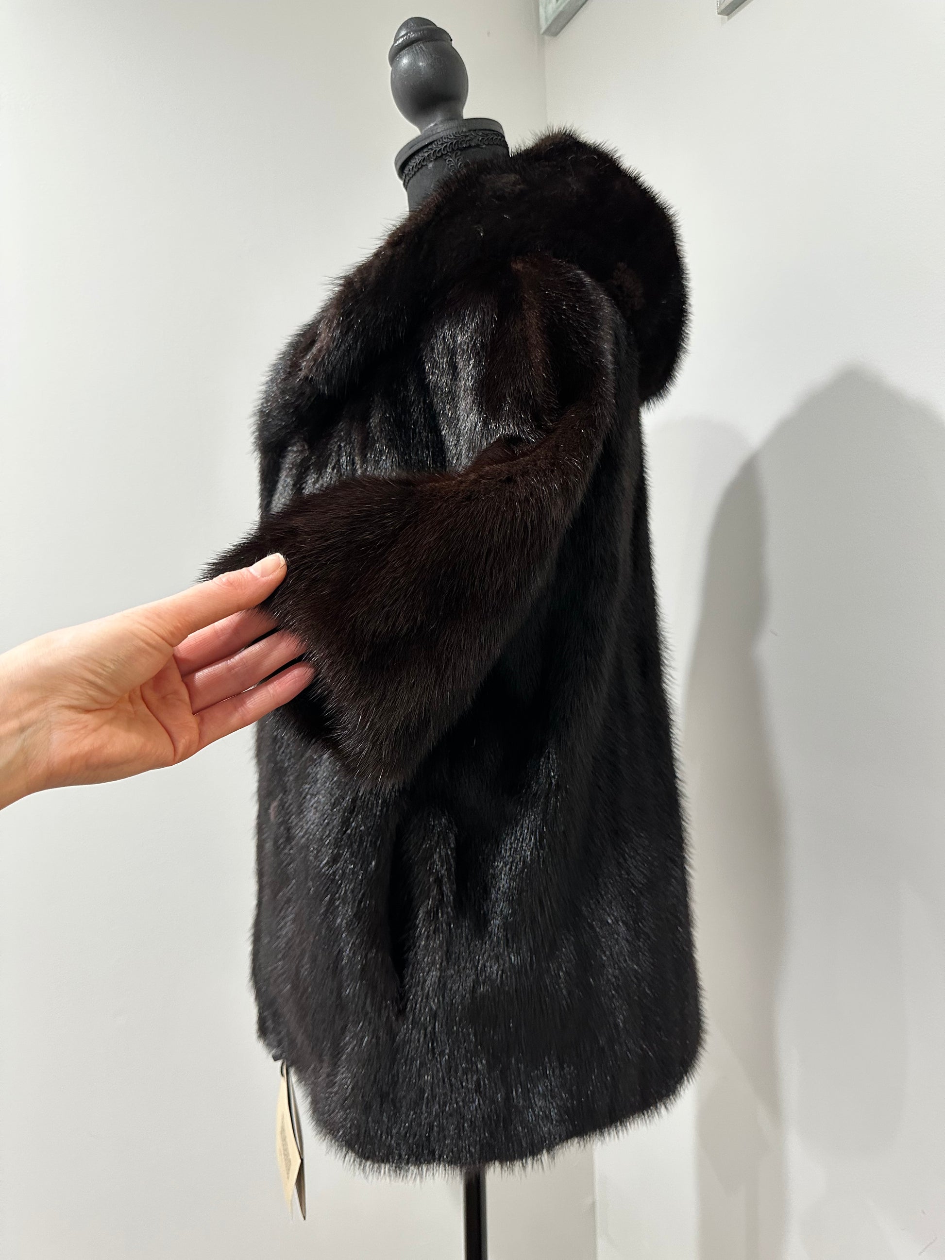 Women's mink fur coat VEST with a hood size S model bomber. Color - BLACK, natural color. A drawstring is sewn at the bottom of the product . The sleeves are SHORT. There are 2 pockets and 1 inside. Fastens with hooks. Ukrainian manufacturer trade mark FURSTAR - SiNCE 2008. Mink - soft, shiny pile, fluffy, beautiful shade. Hand-sewn viscose lining.