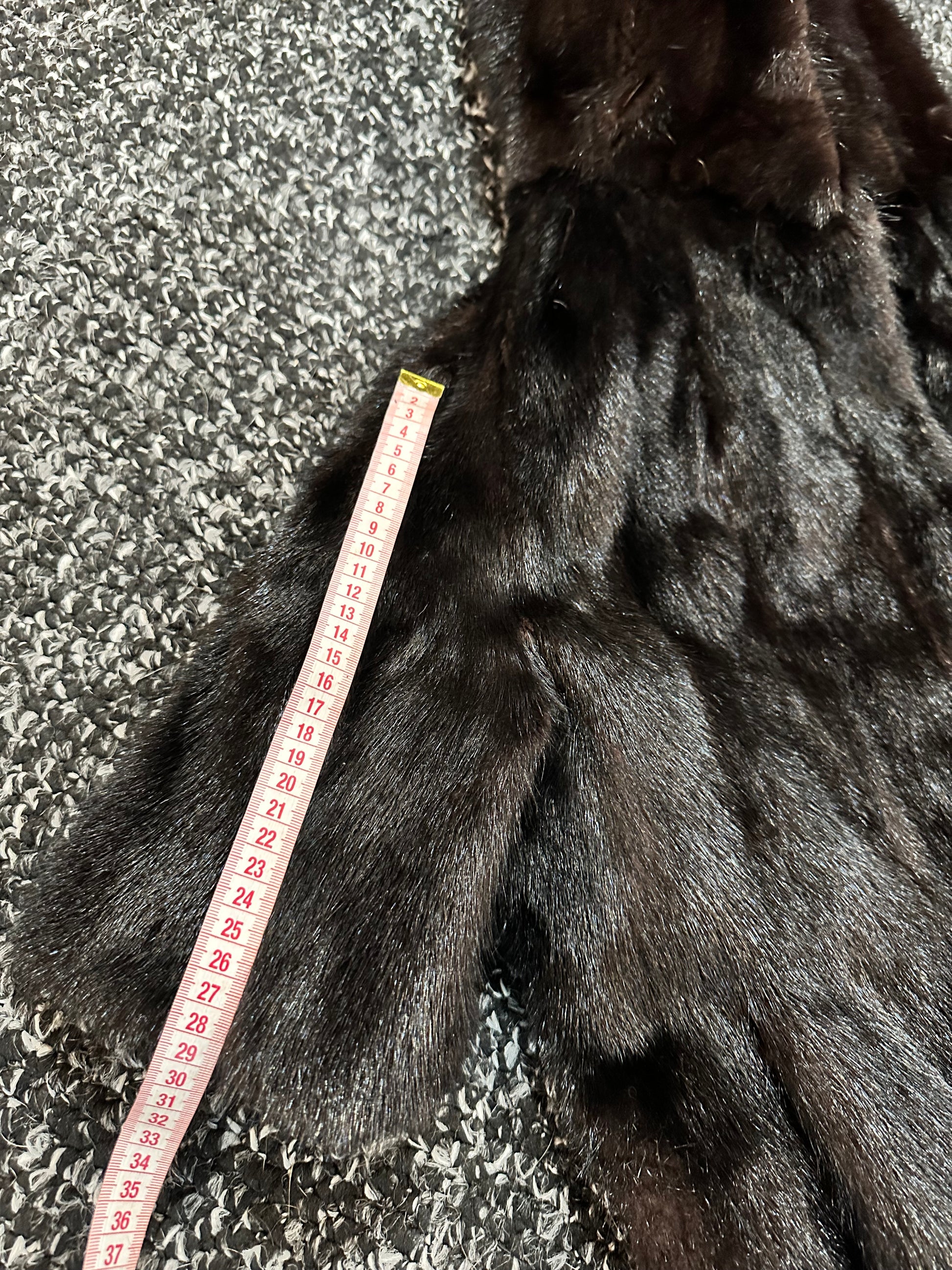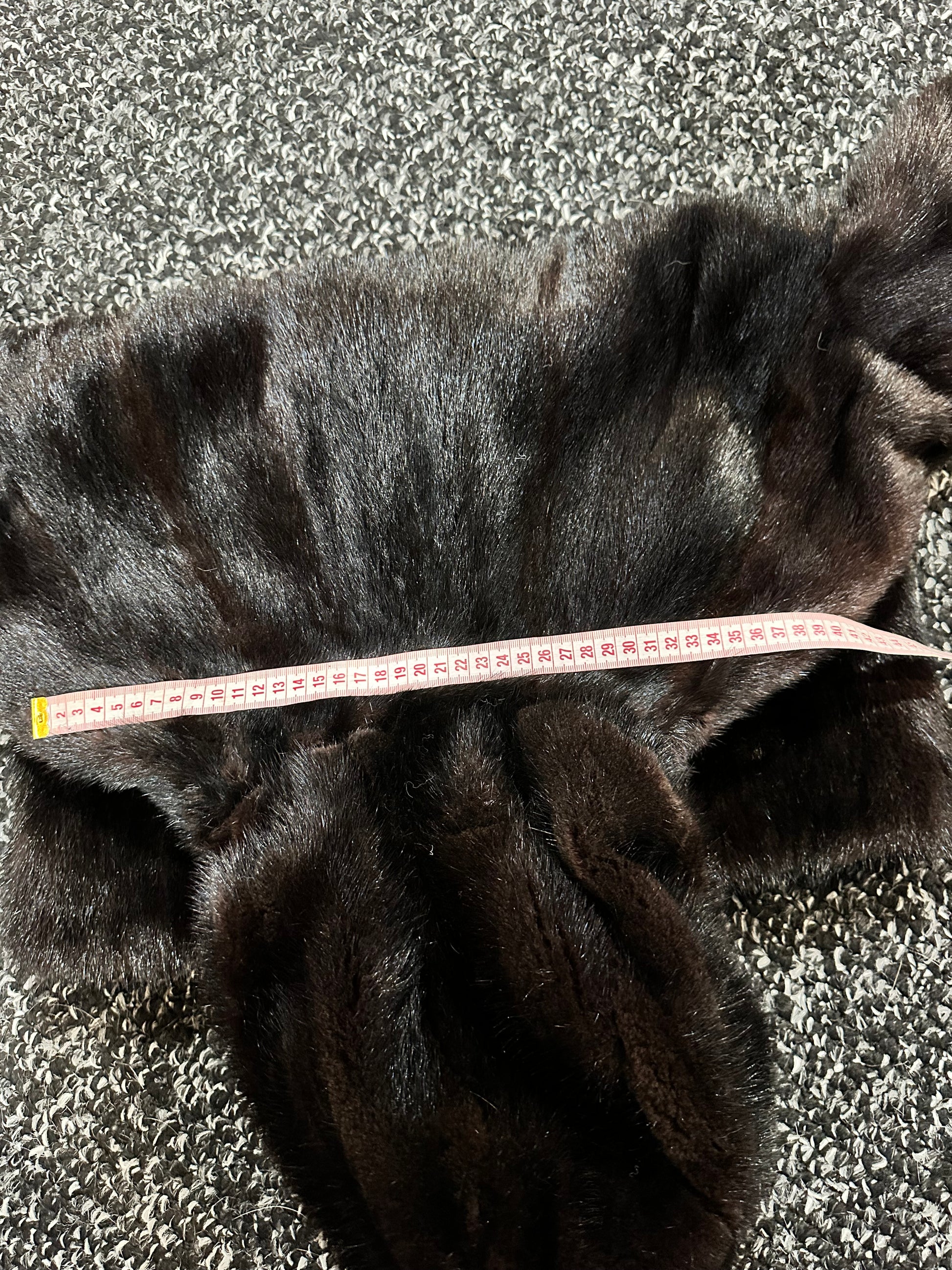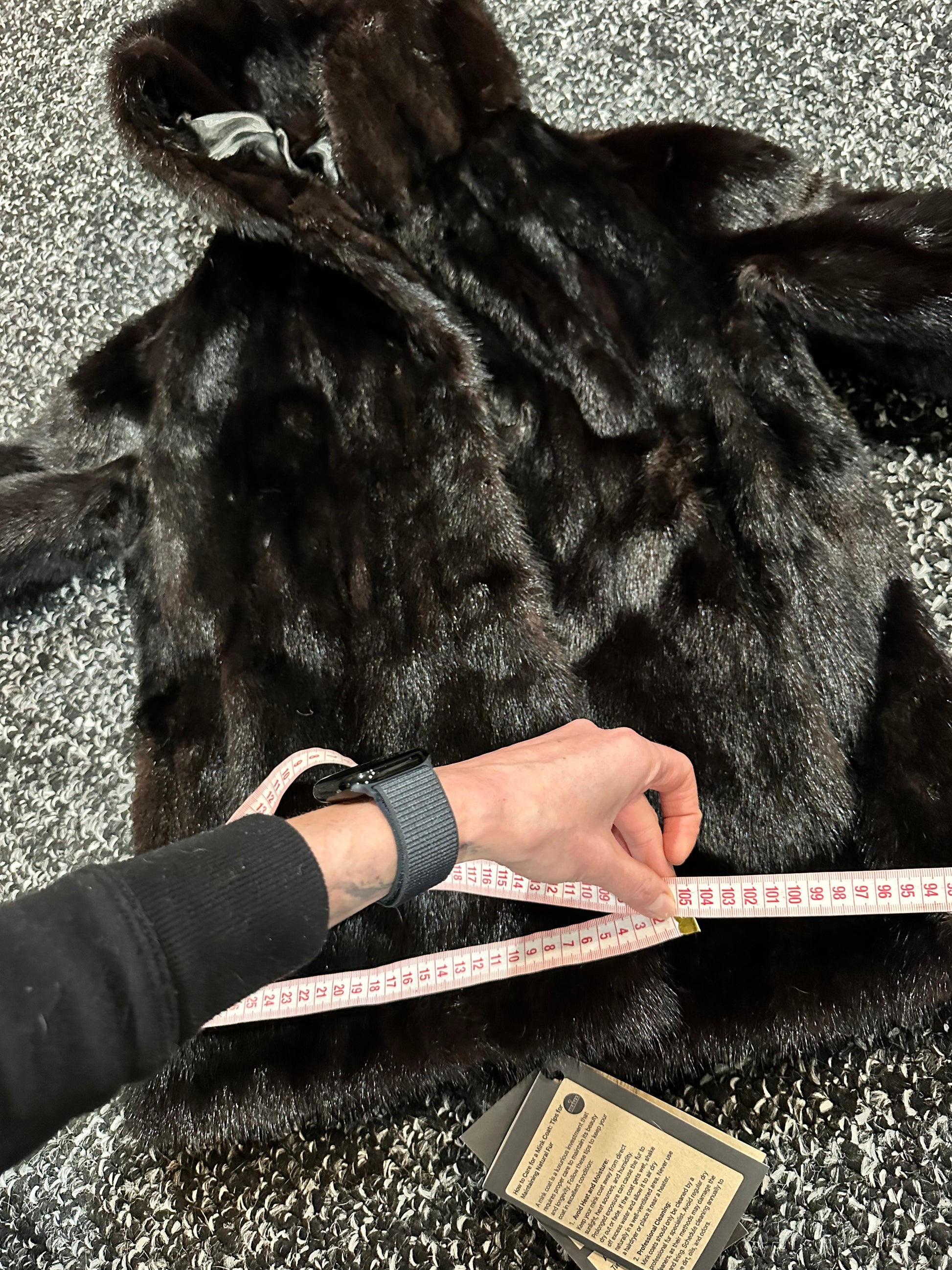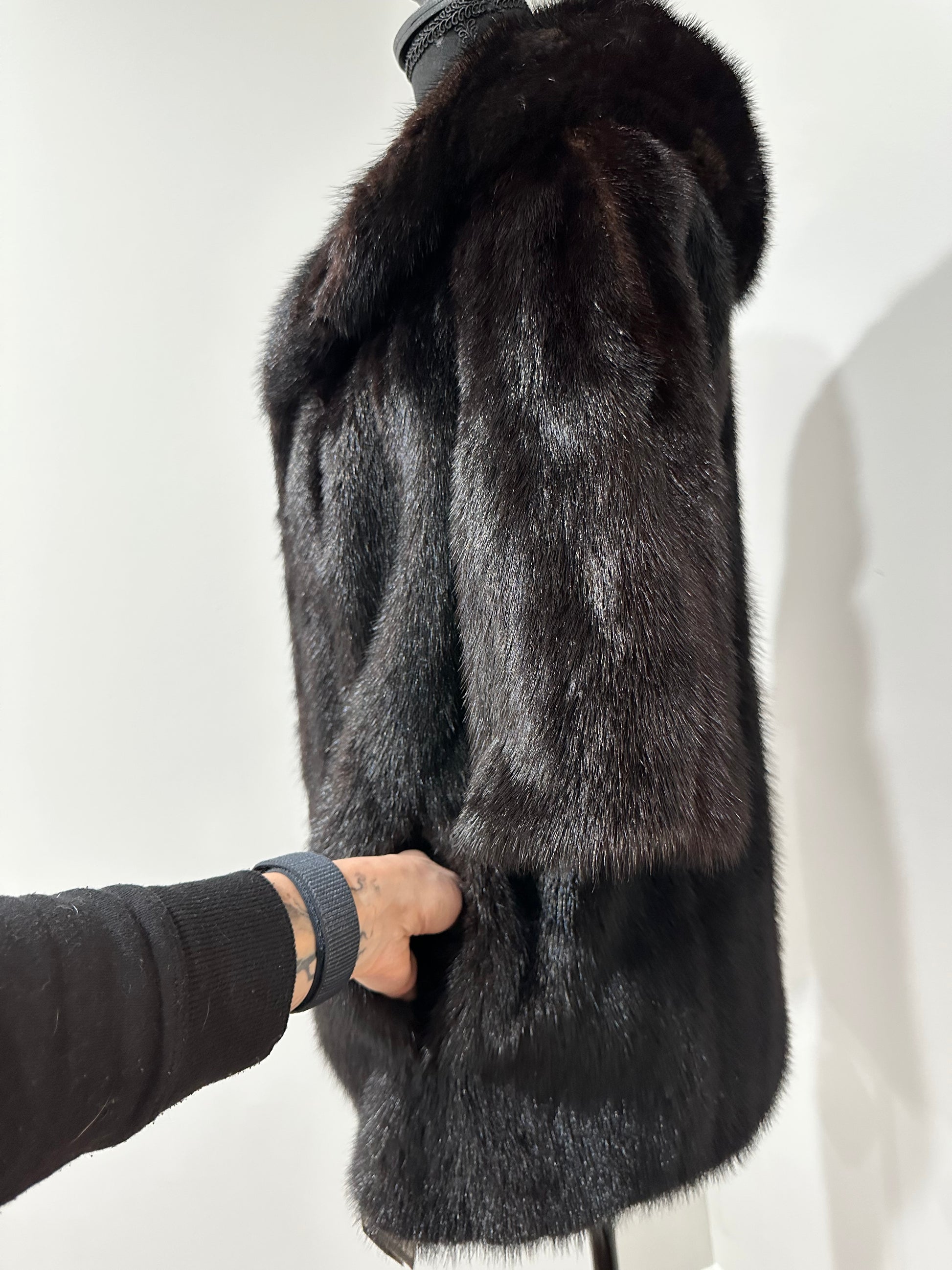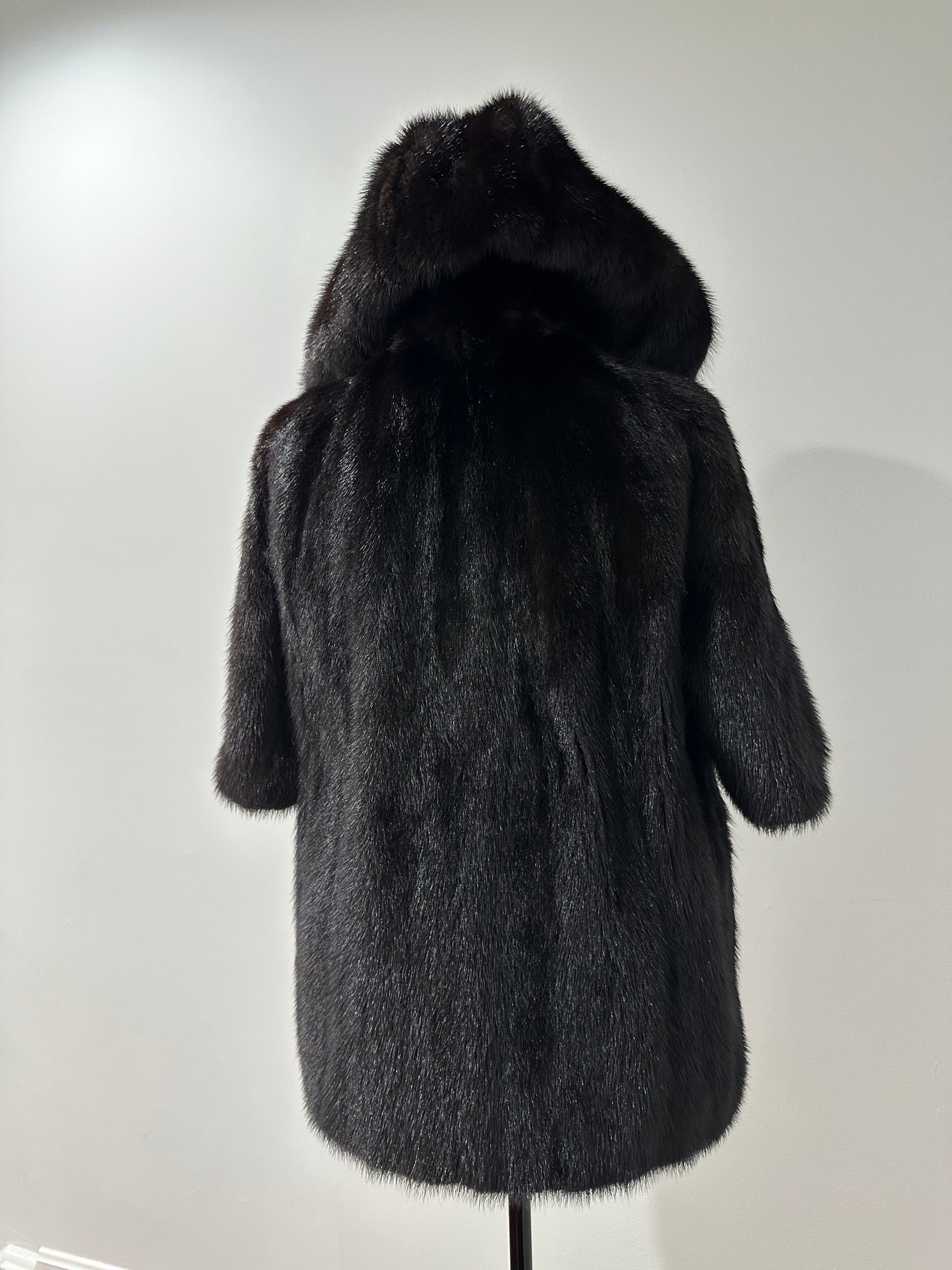 Women's mink fur coat VEST with a hood size S model bomber. Color - BLACK, natural color. A drawstring is sewn at the bottom of the product . The sleeves are SHORT. There are 2 pockets and 1 inside. Fastens with hooks. Ukrainian manufacturer trade mark FURSTAR - SiNCE 2008. Mink - soft, shiny pile, fluffy, beautiful shade. Hand-sewn viscose lining.