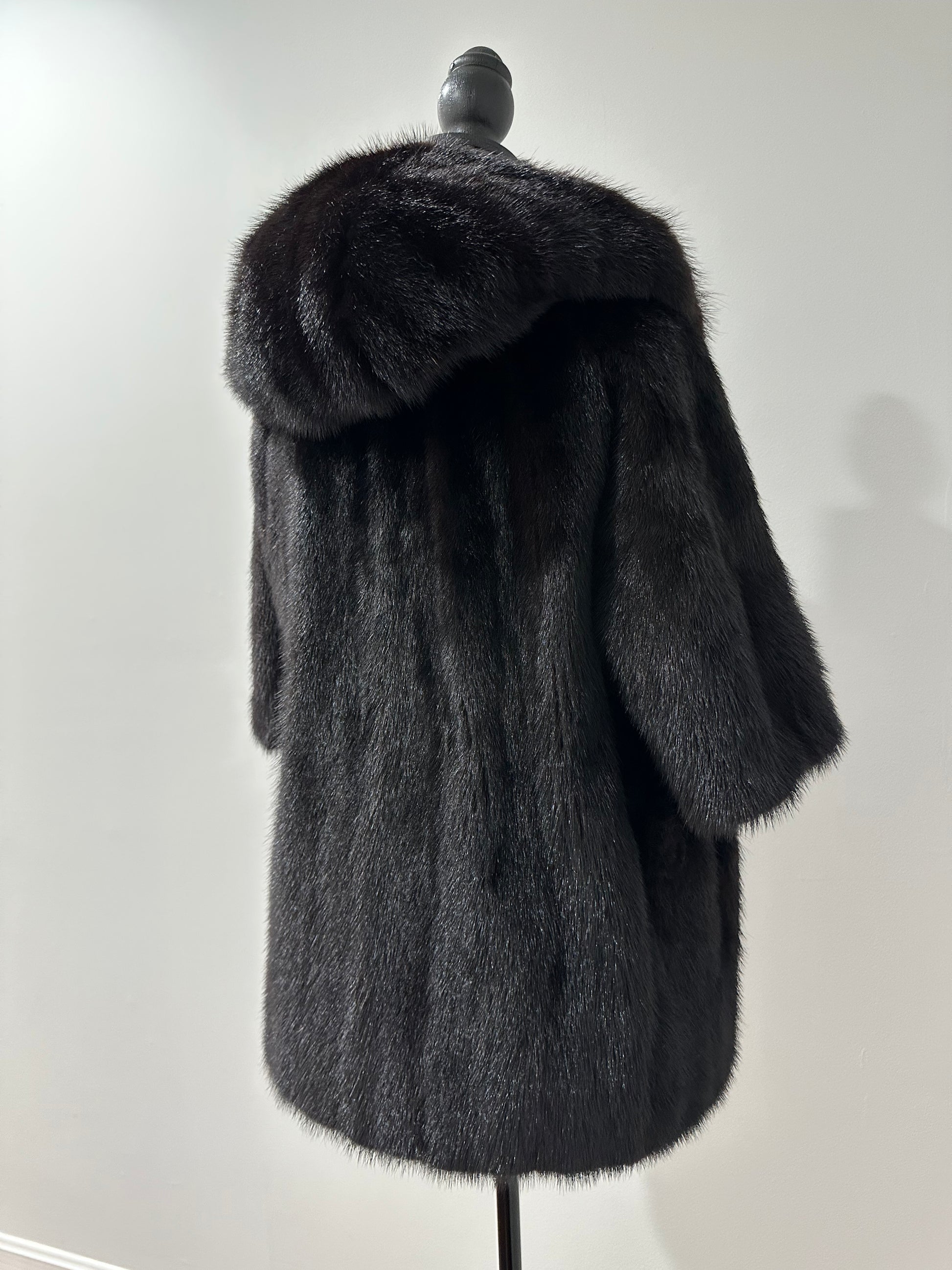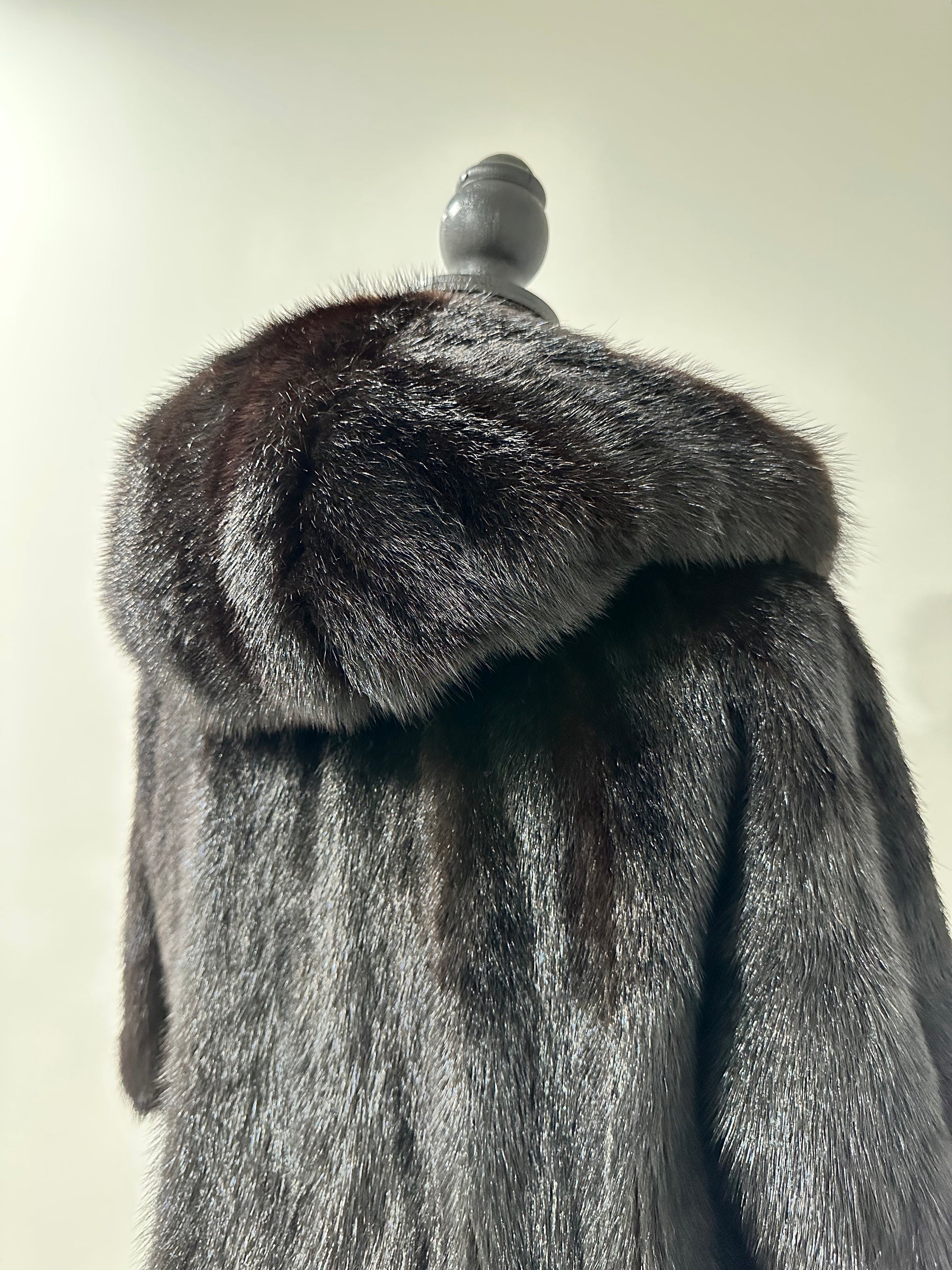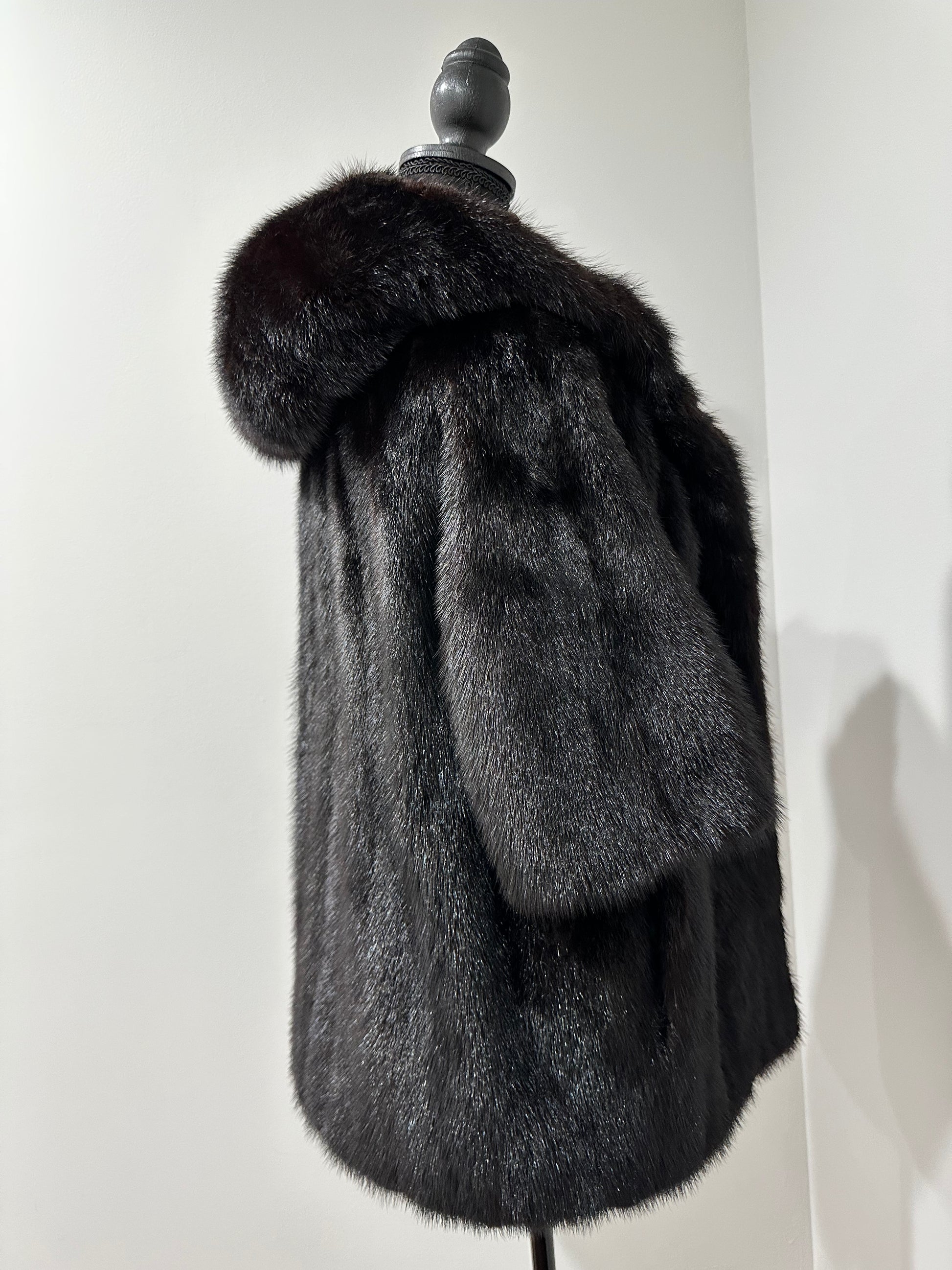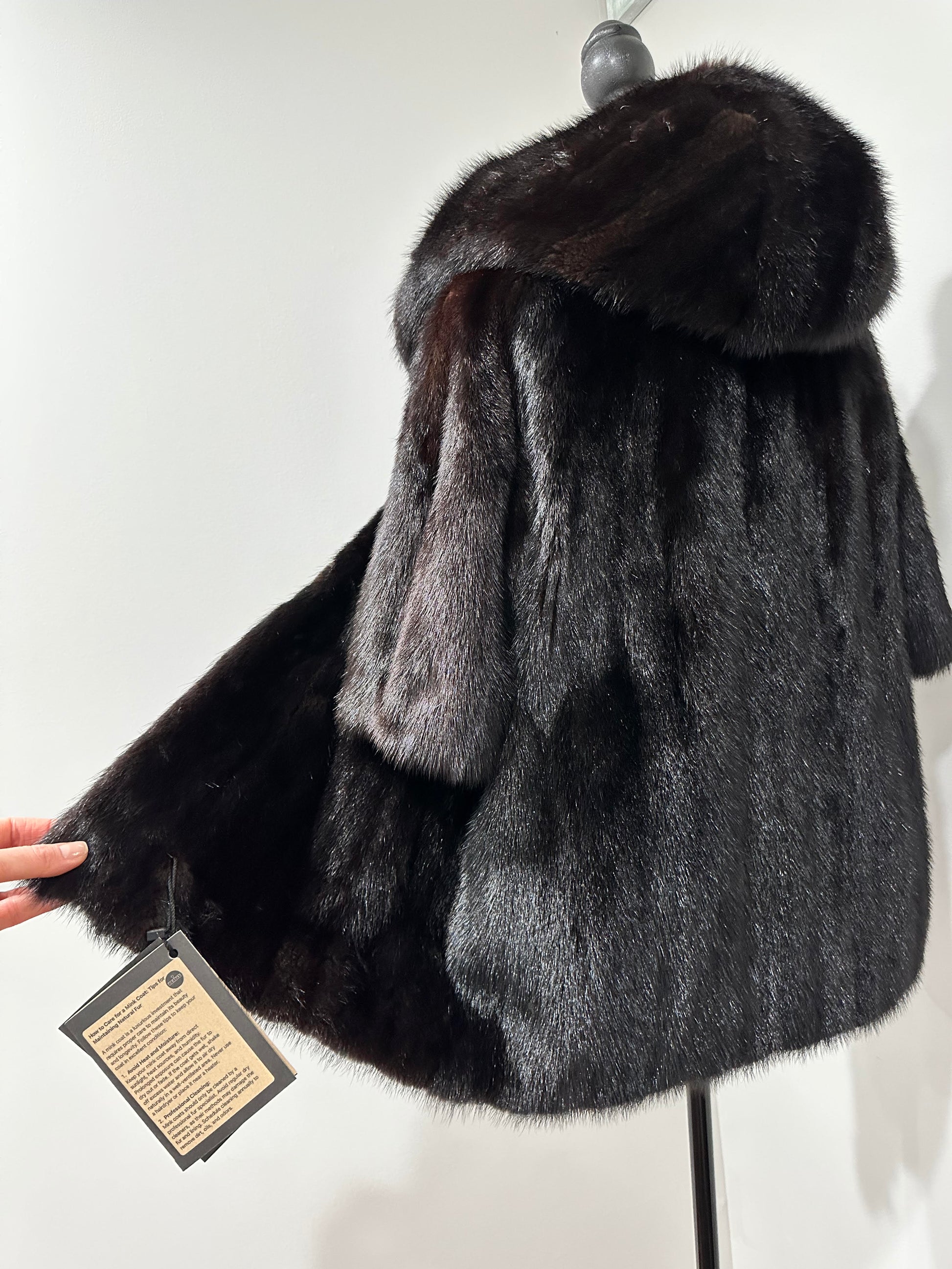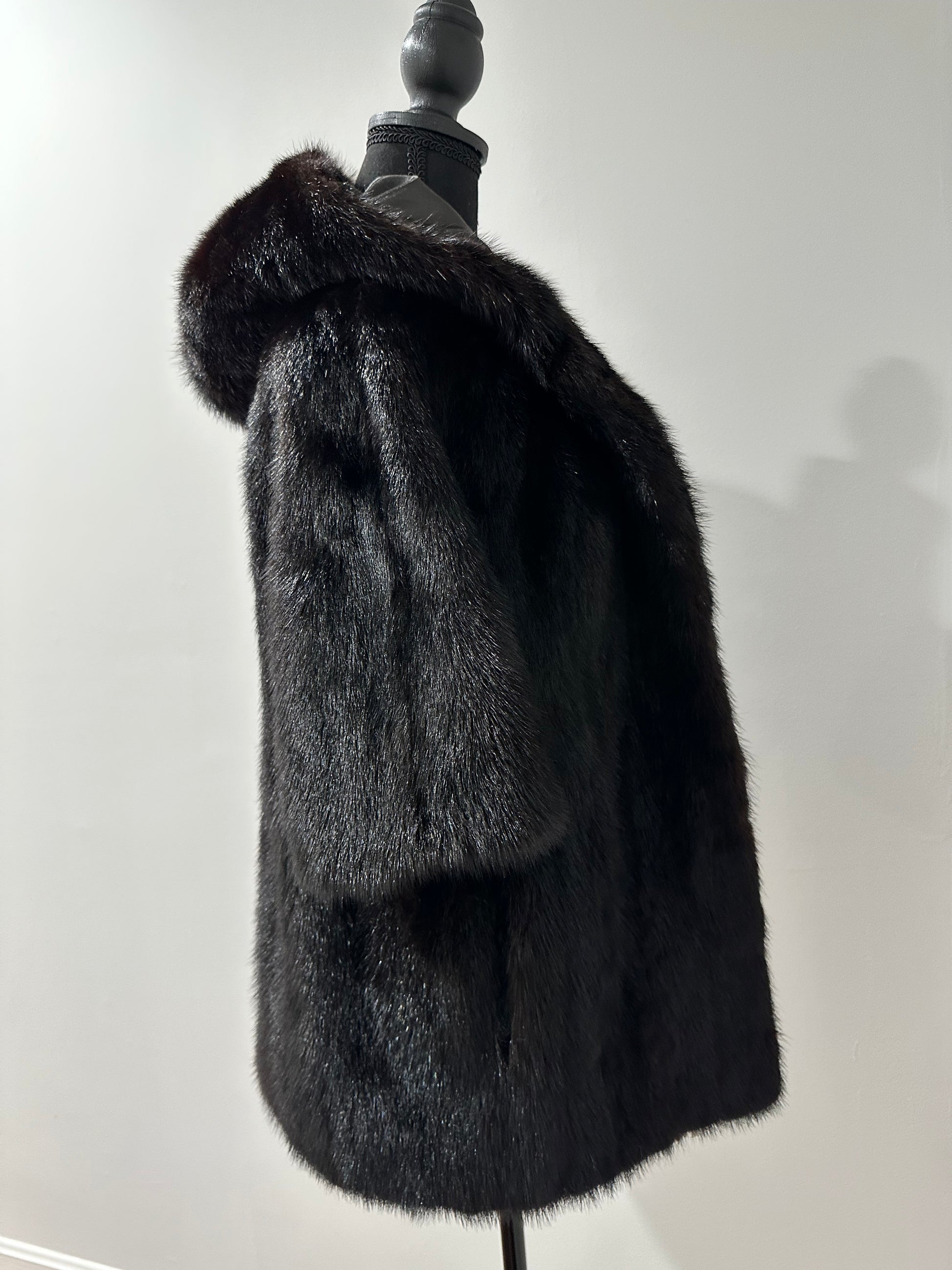 Women's mink fur coat VEST with a hood size S model bomber. Color - BLACK, natural color. A drawstring is sewn at the bottom of the product . The sleeves are SHORT. There are 2 pockets and 1 inside. Fastens with hooks. Ukrainian manufacturer trade mark FURSTAR - SiNCE 2008. Mink - soft, shiny pile, fluffy, beautiful shade. Hand-sewn viscose lining.